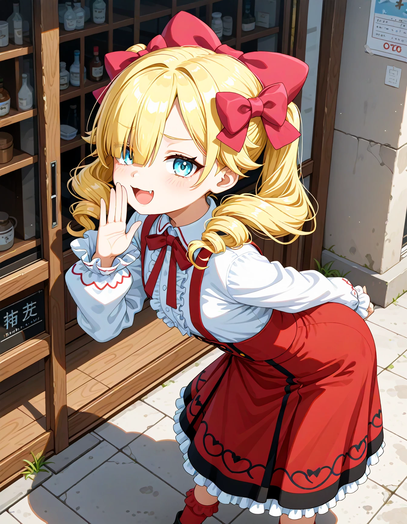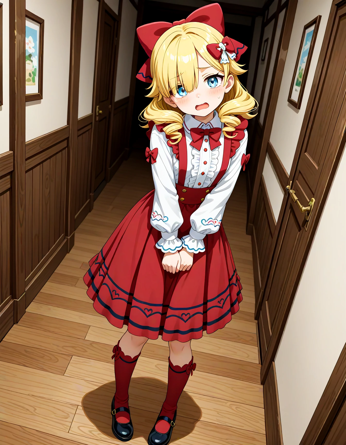 defmarni, sommadel, blue eyes, blonde hair, long hair, drill hair, hair over one eye, hair bow, red bow, hair ornament, red dress, dress, center frills, long skirt, red skirt, suspenders, suspender skirt, white shirt, frills, long sleeves, puffy sleeves, black footwear, shoes, red socks,