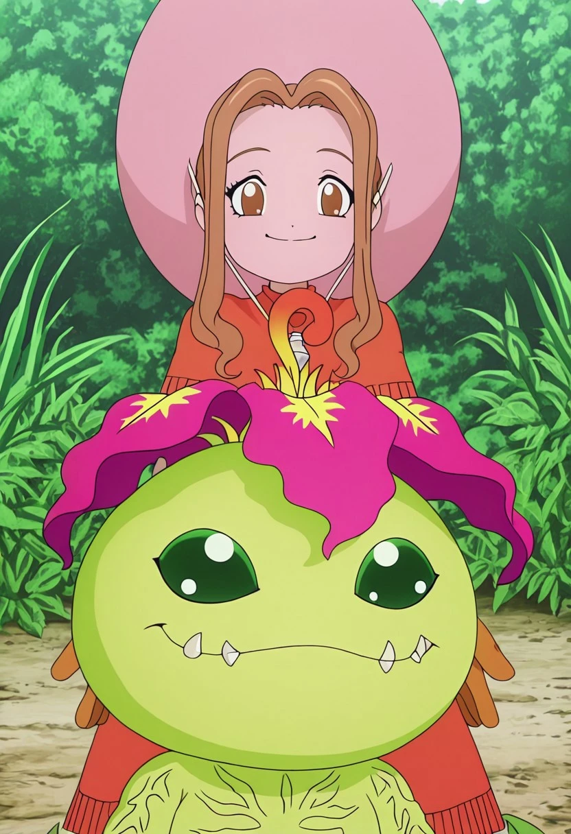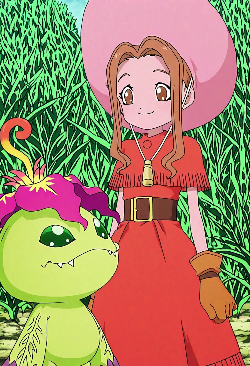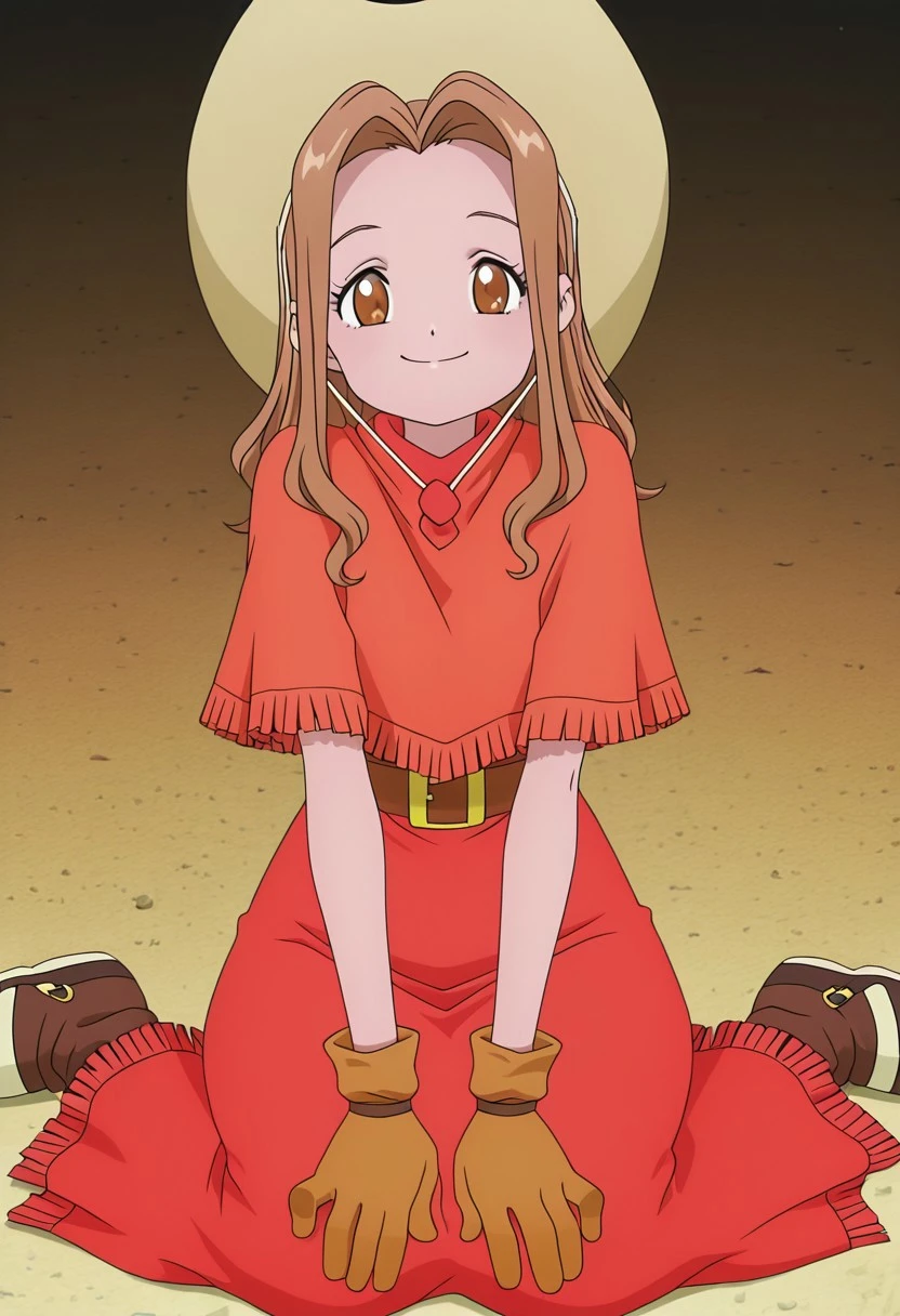 brown hair, brown eyes, belt, long hair, dress, capelet, gloves, fringe trim, cowboy hat, anime screencap, anime coloring