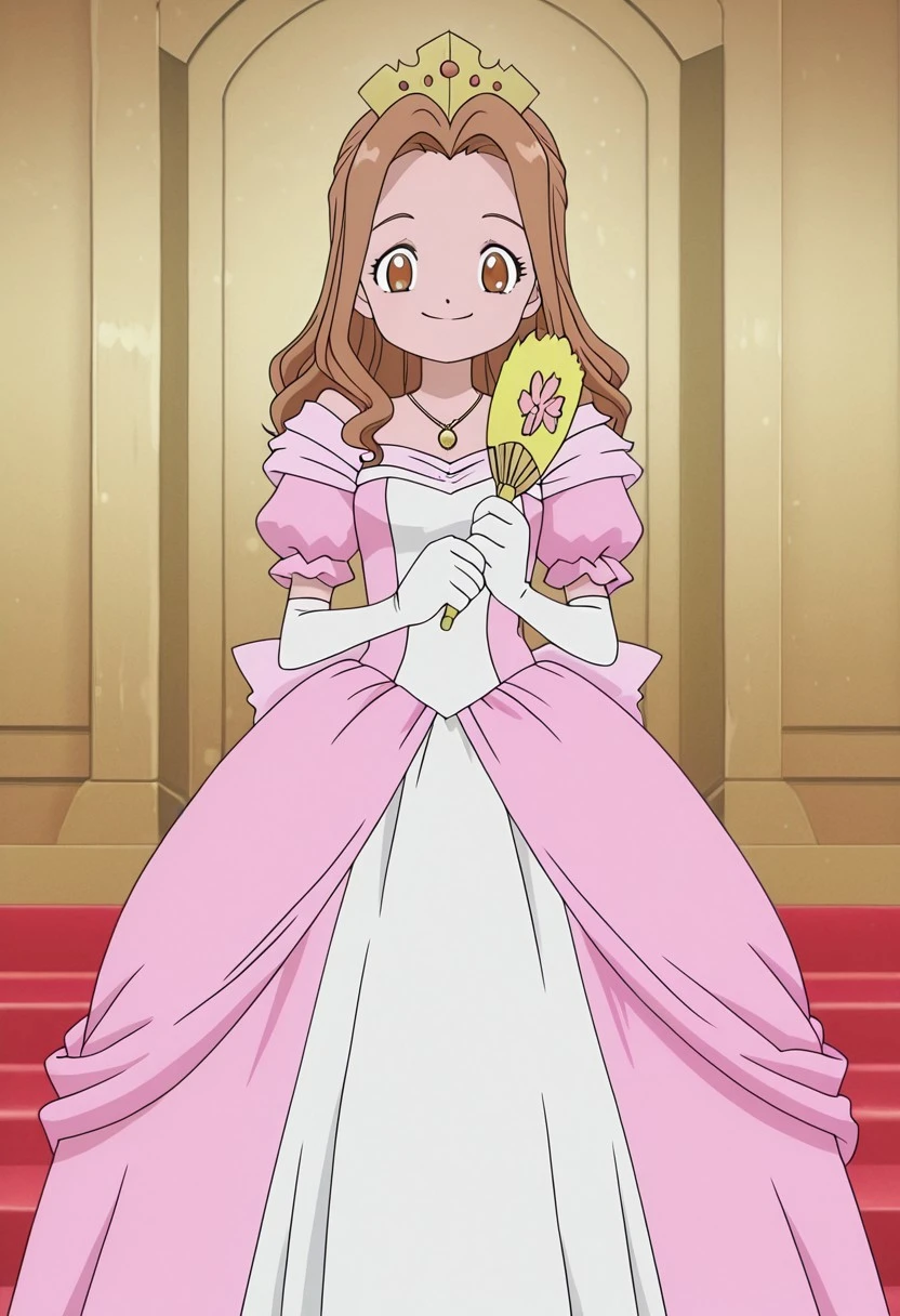 dress, gloves, crown, hand fan, princess, elbow gloves, gown, necklace,