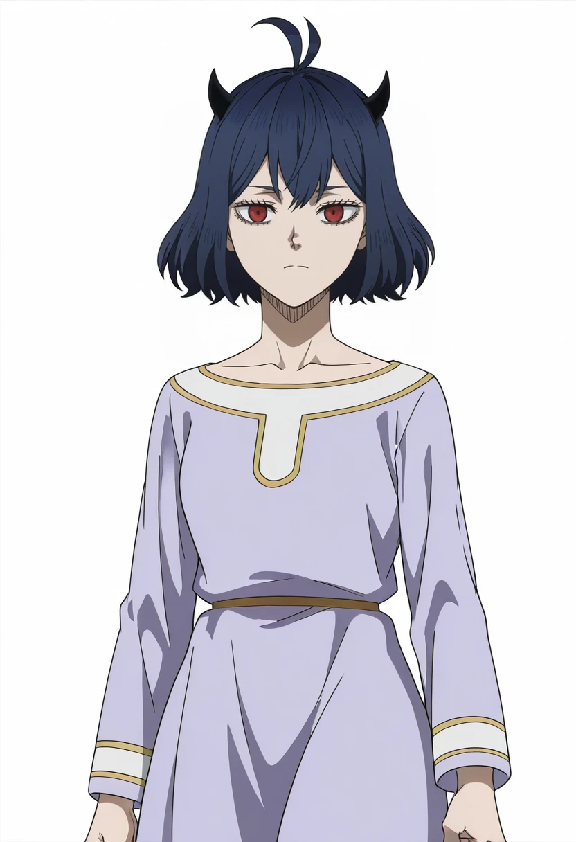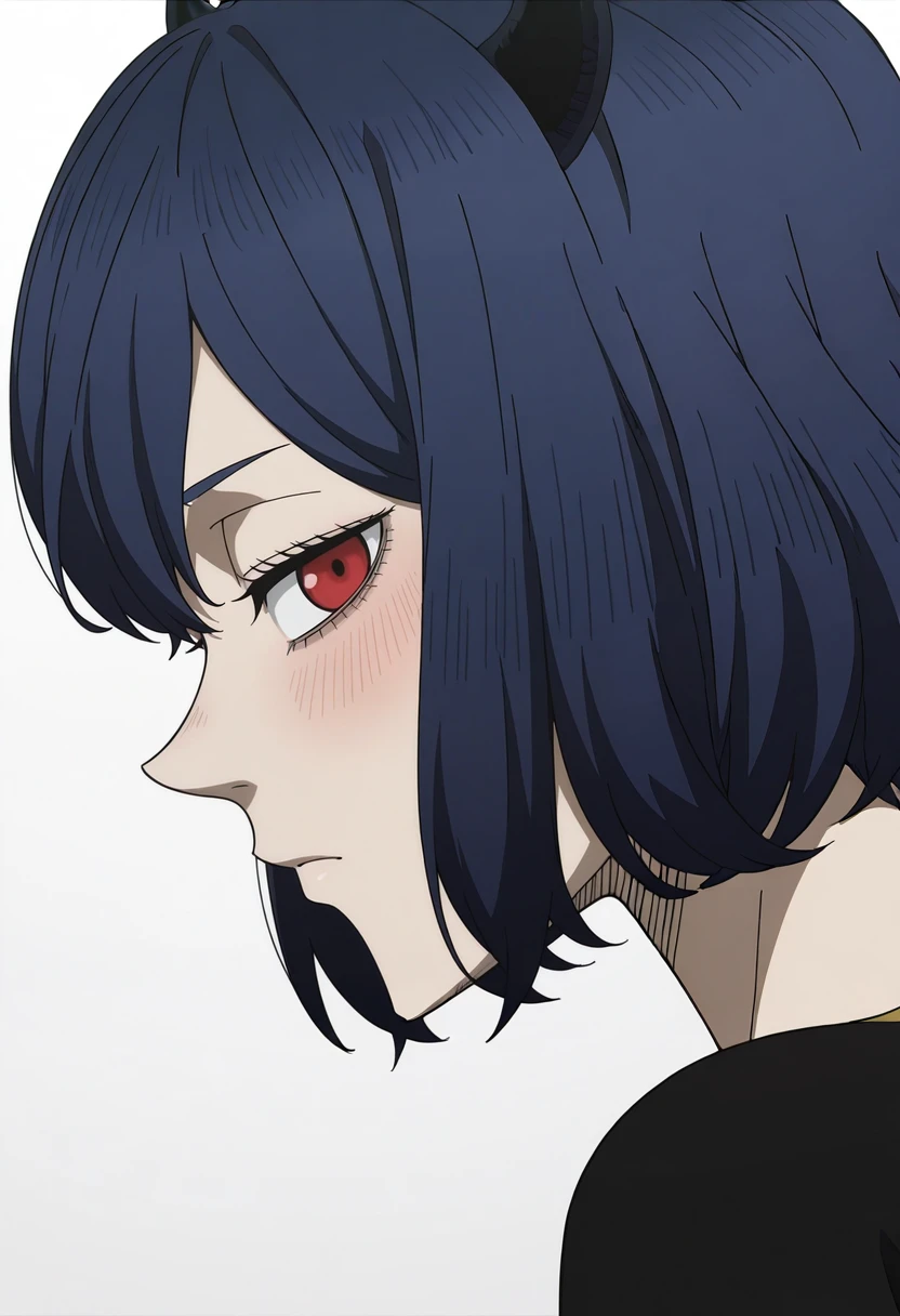 Base appearance prompts:ydnerosecre, 1girl, solo, short dark blue hair, red eyes, hair over forehead, bangs, eye shading, pale skin, black horns