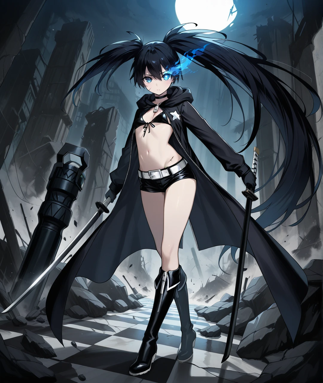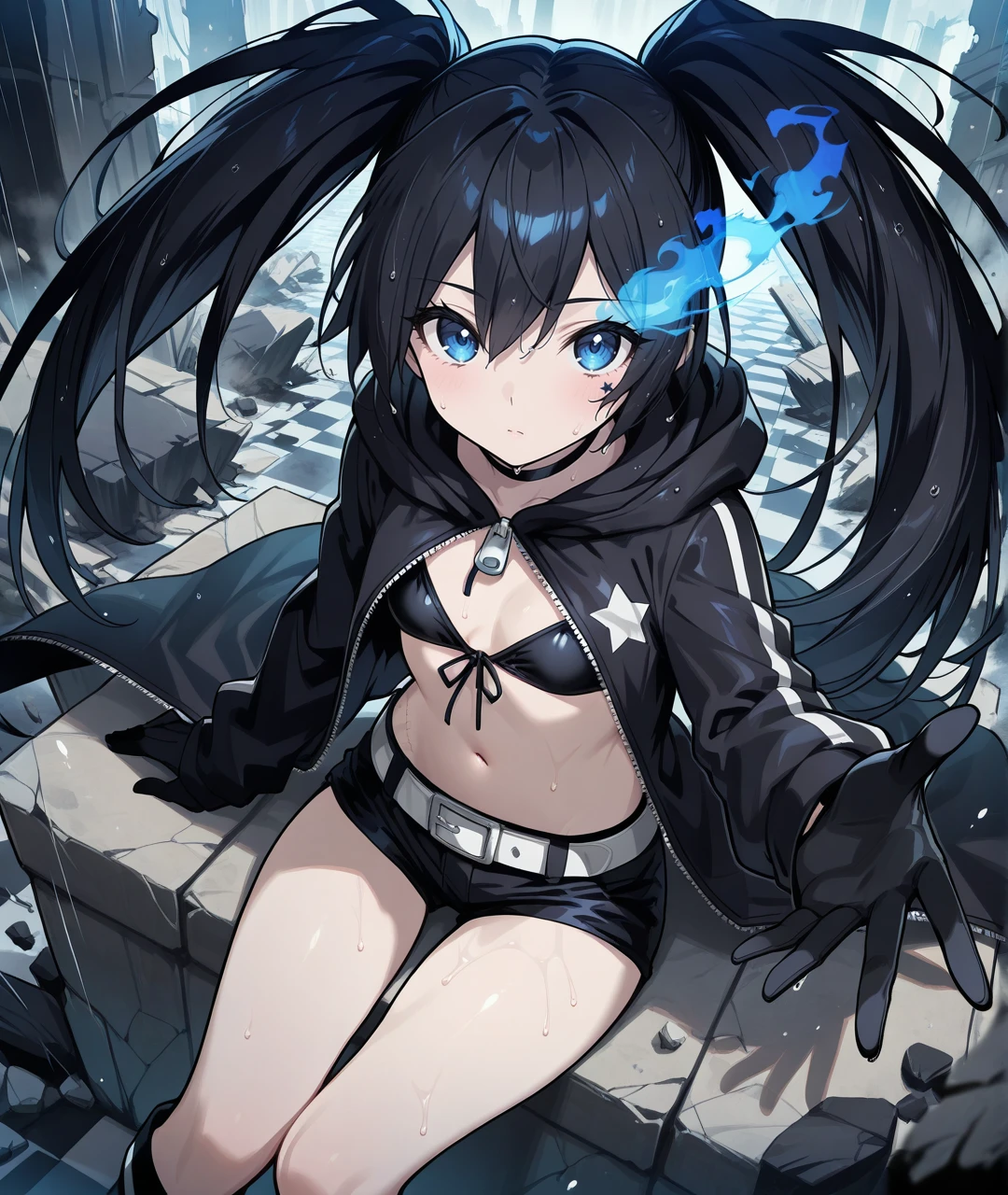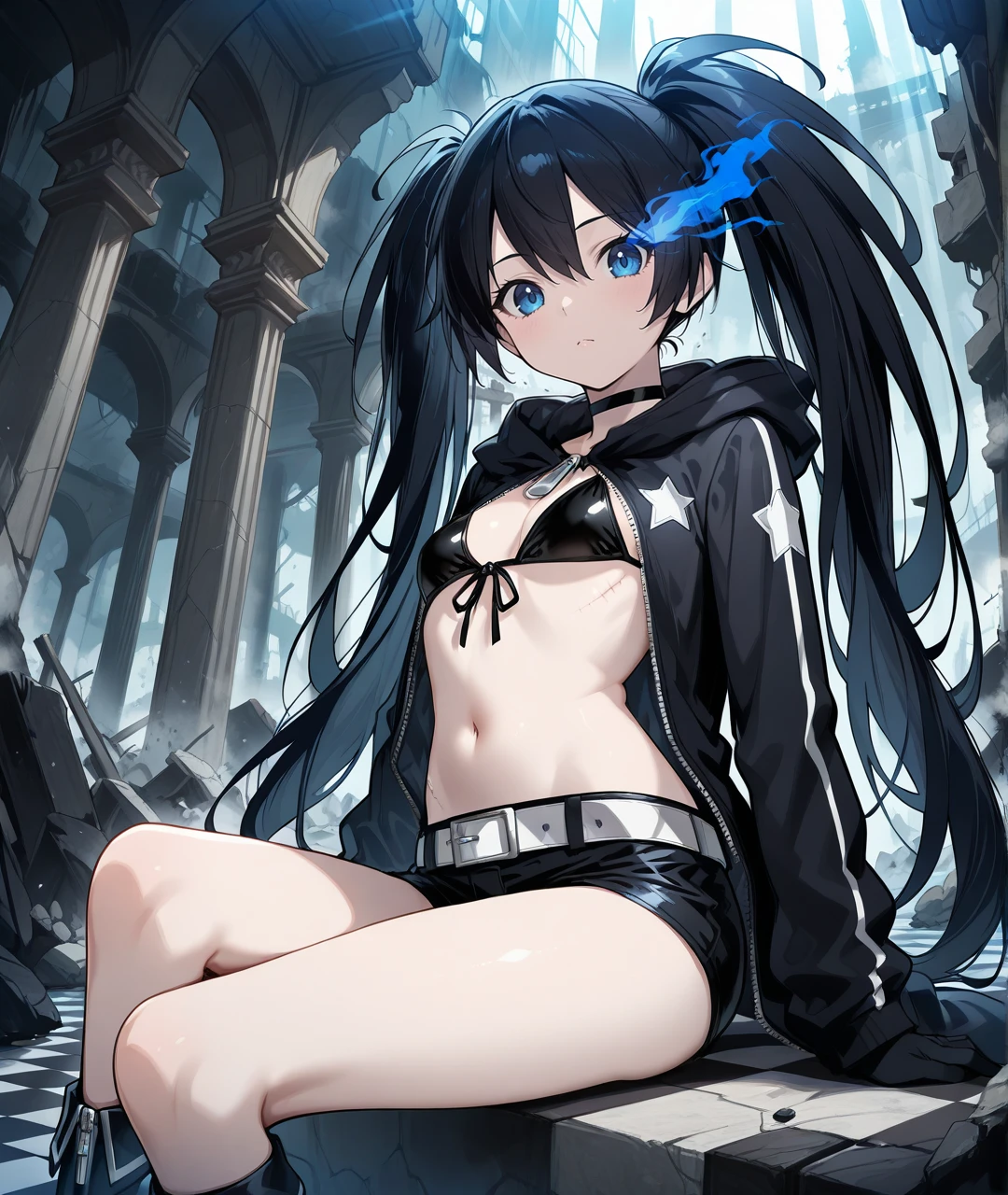 BRSBase, pale skin, blue eyes, flaming eye, black hair, long hair, twintails, uneven twintails, black choker, collarbone, small breasts, scar, black coat, open coat, hooded coat, hood down, zipper, star (symbol), long sleeves, black gloves, black bikini, front-tie bikini top, bikini top only, midriff, stomach, navel, white belt, belt buckle, short shorts, knee boots, black footwear,