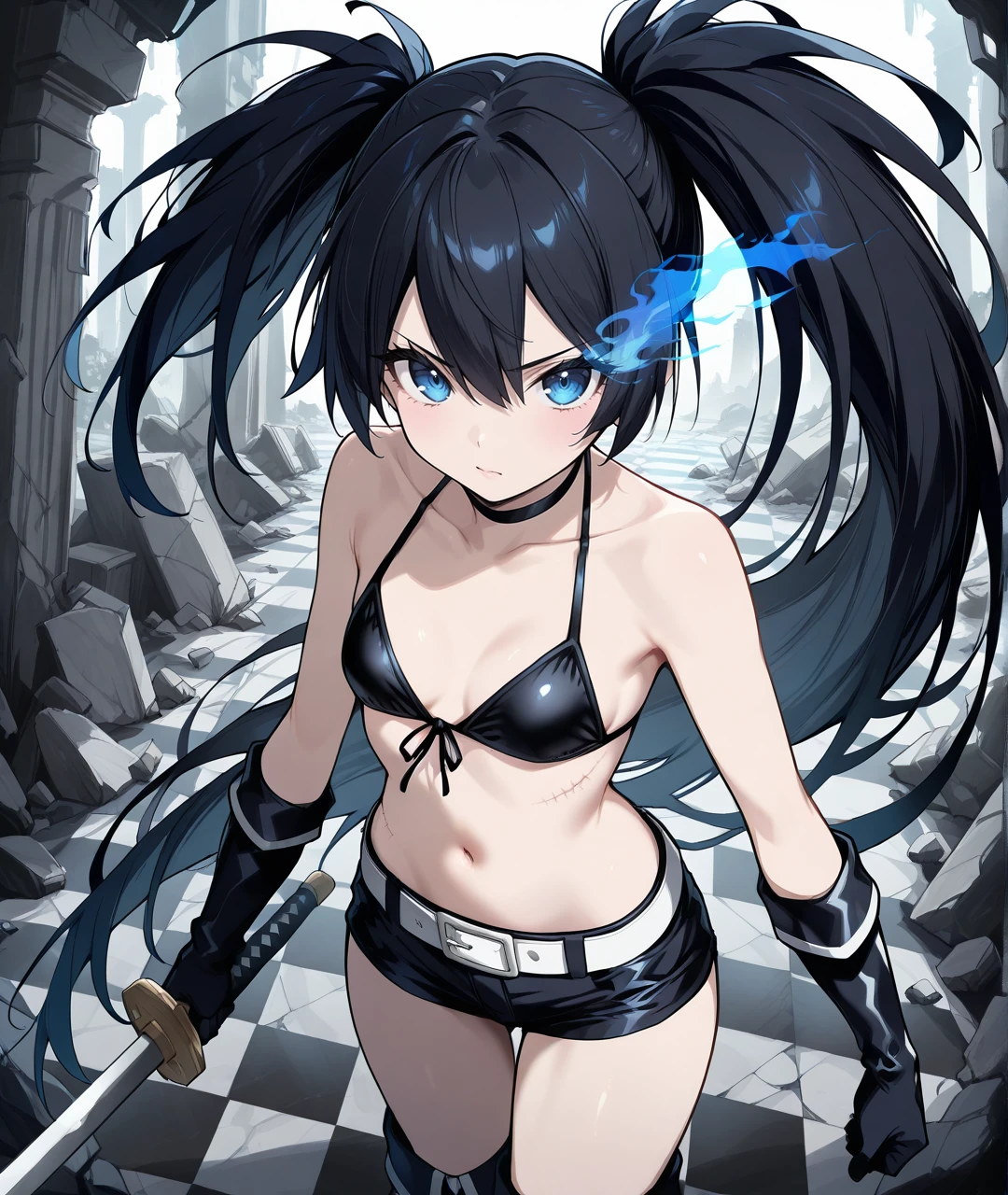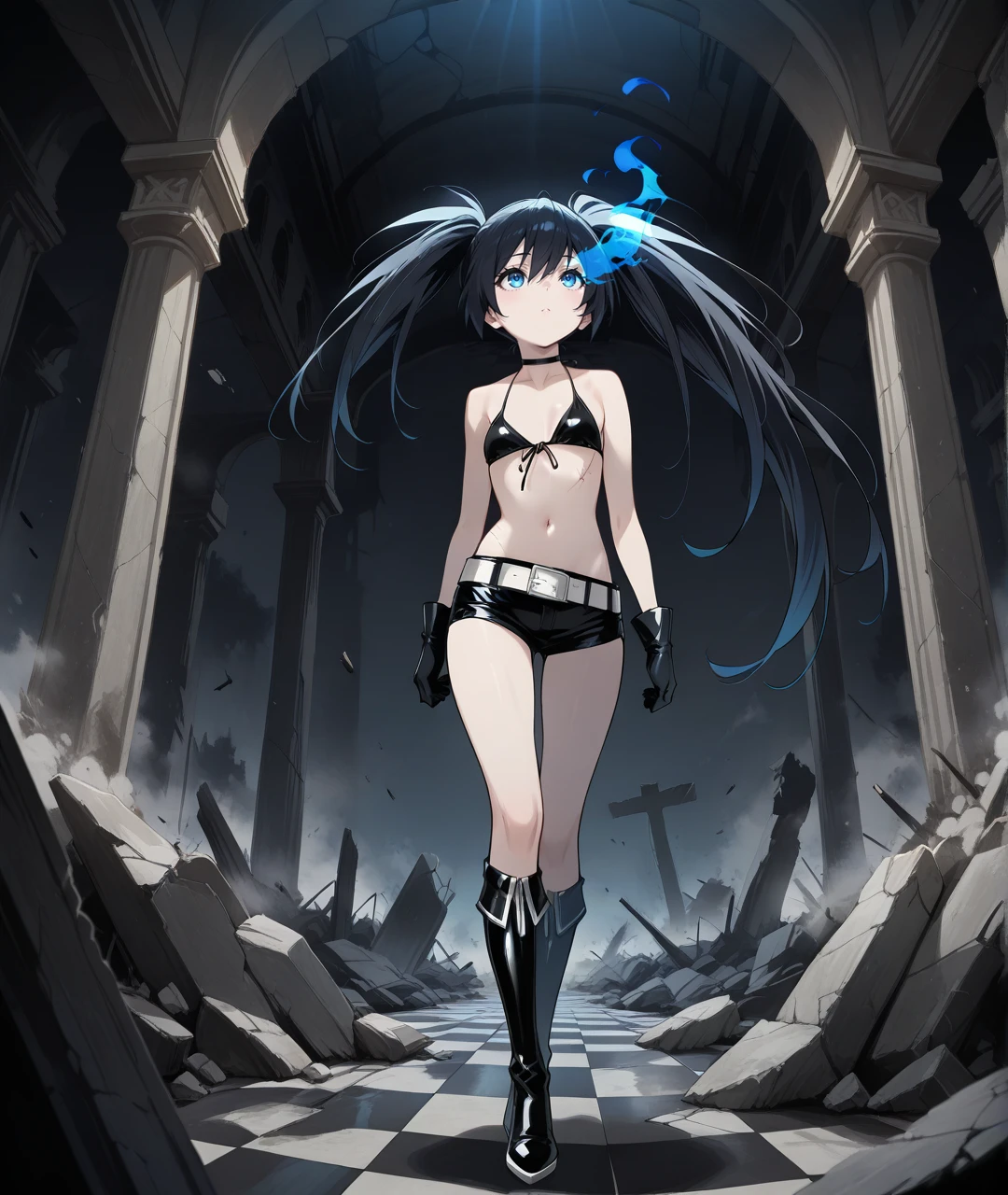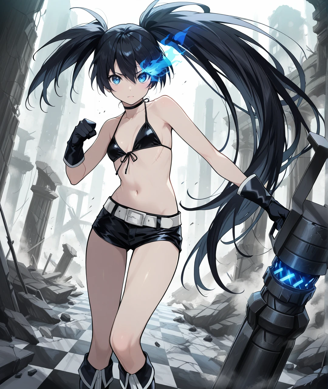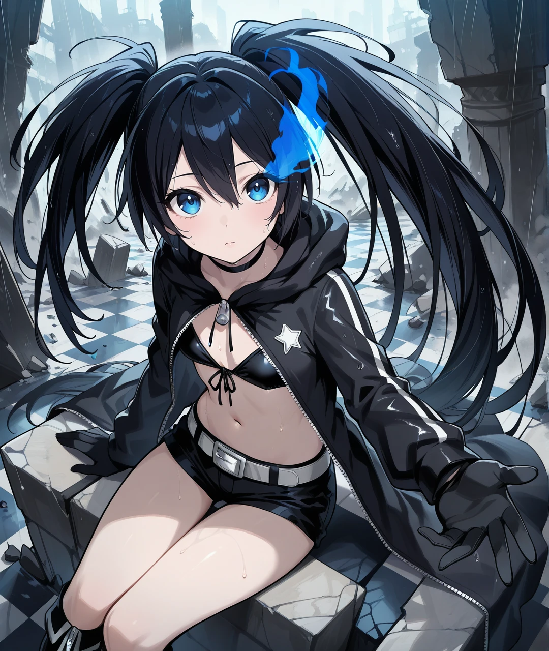 BRSBase, pale skin, blue eyes, flaming eye, black hair, long hair, twintails, uneven twintails, black choker, collarbone, small breasts, scar, black coat, open coat, hooded coat, hood down, zipper, star (symbol), long sleeves, black gloves, black bikini, front-tie bikini top, bikini top only, midriff, stomach, navel, white belt, belt buckle, short shorts, knee boots, black footwear,