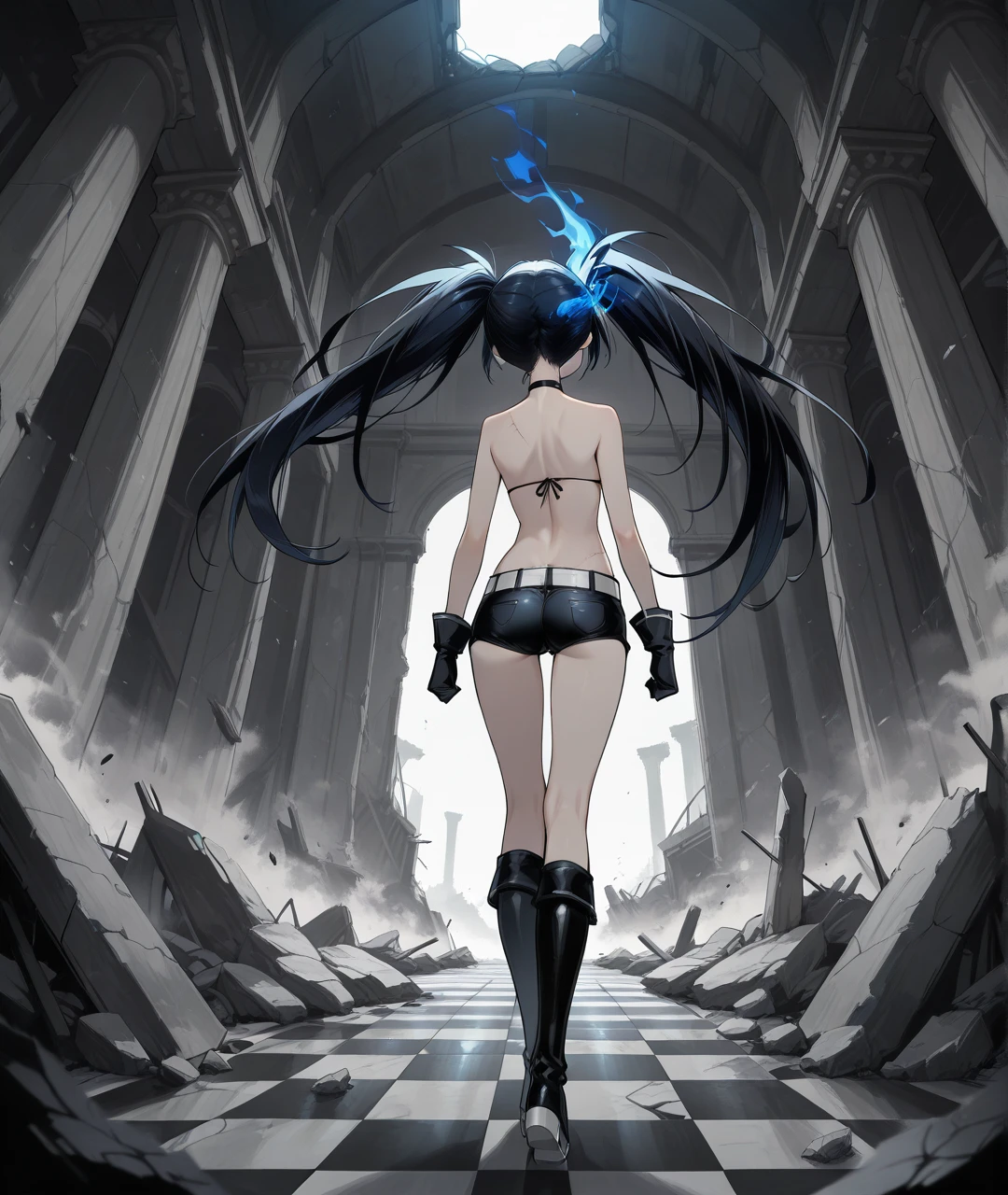 Character Tags: BRSBase, pale skin, blue eyes, flaming eye, black hair, long hair, twintails, uneven twintails, black choker, collarbone, small ???????, scar, black coat, open coat, hooded coat, hood down, zipper, star (symbol), long sleeves, black gloves, black ??????, front-tie ?????? top, ?????? top only, midriff, stomach, navel, white belt, belt buckle, short shorts, knee boots, black footwear,