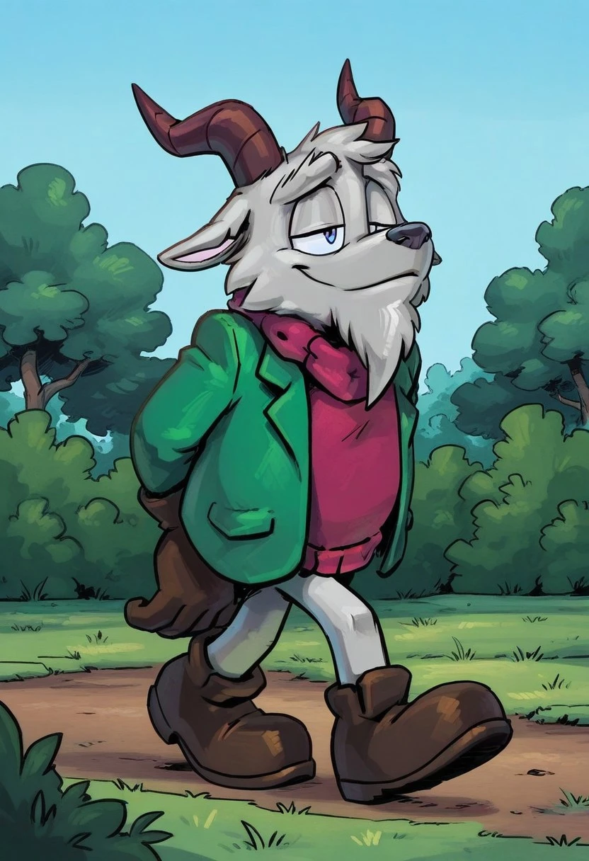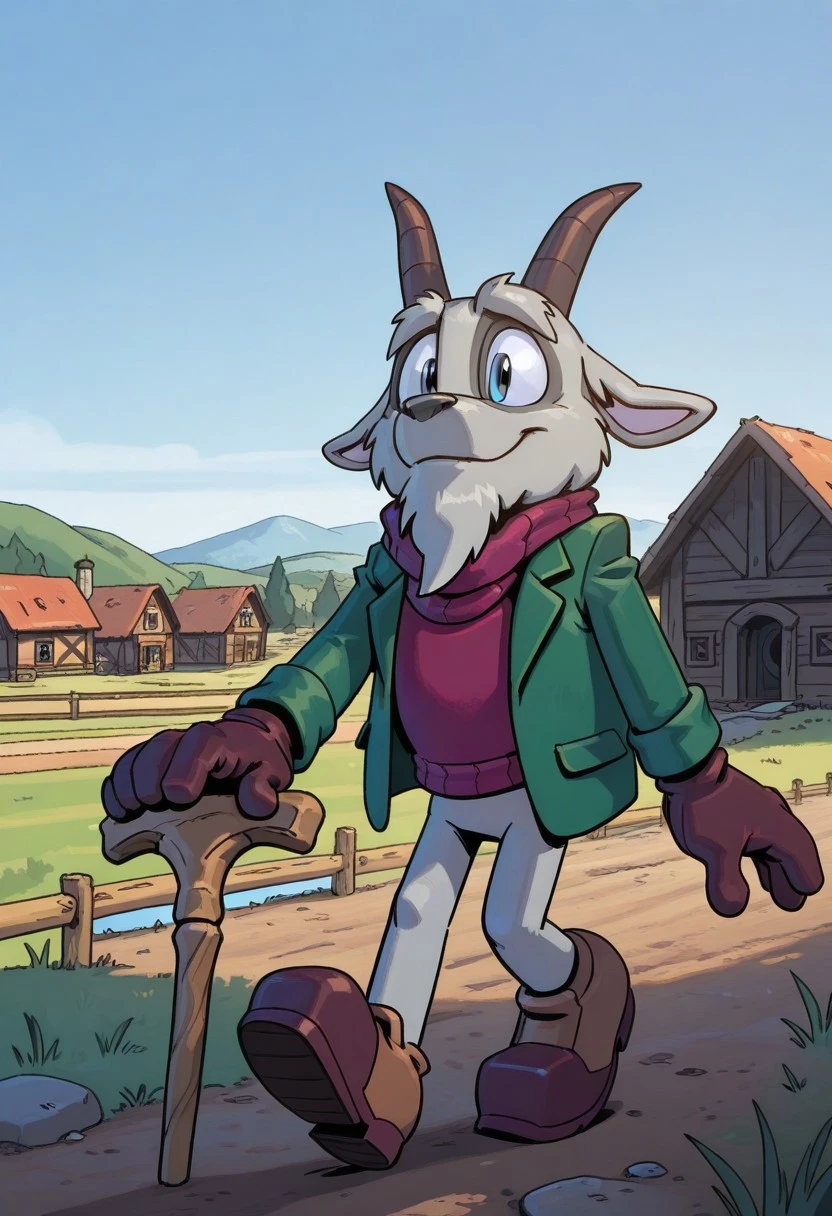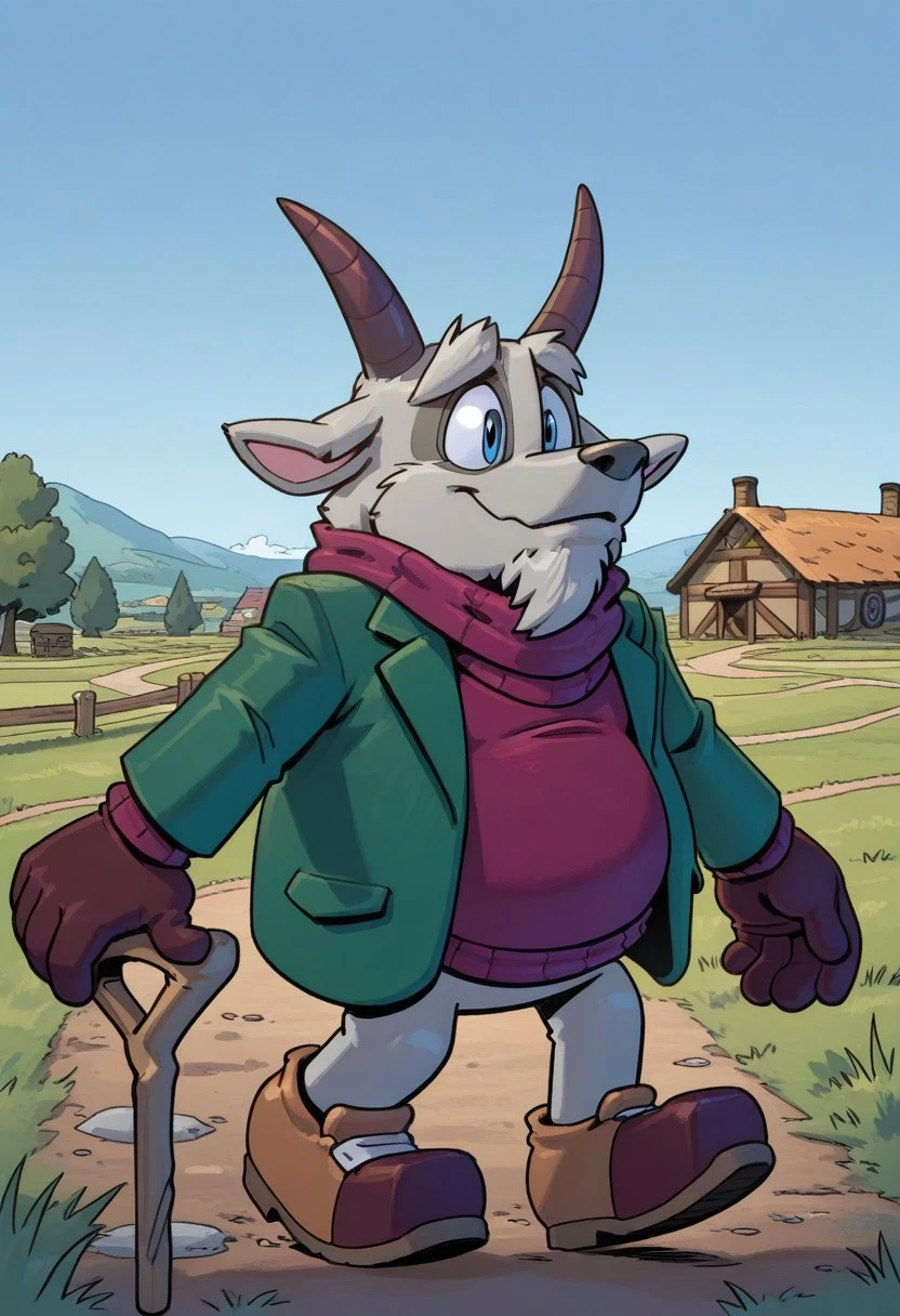 Elder Scruffy, gray fur, long gray beard, blue eyes, dark brown horns, maroon scarf, maroon sweater, open green jacket, brown shoes, brown gloves, cane