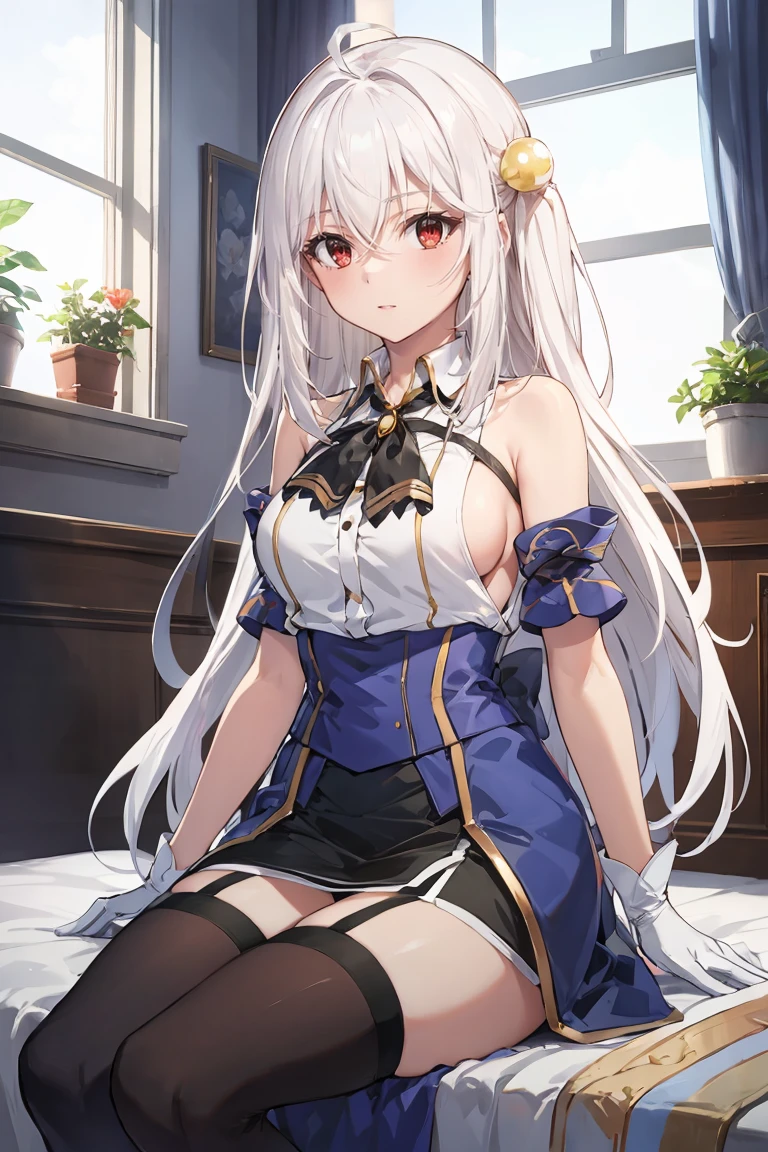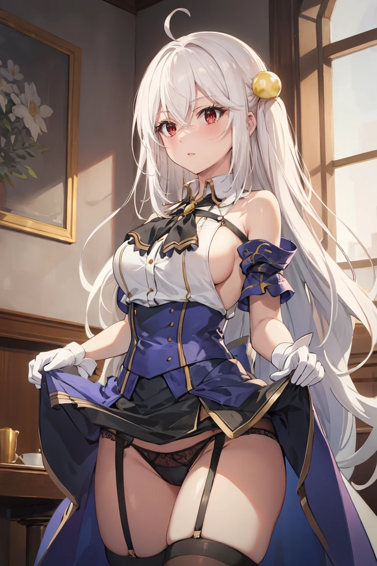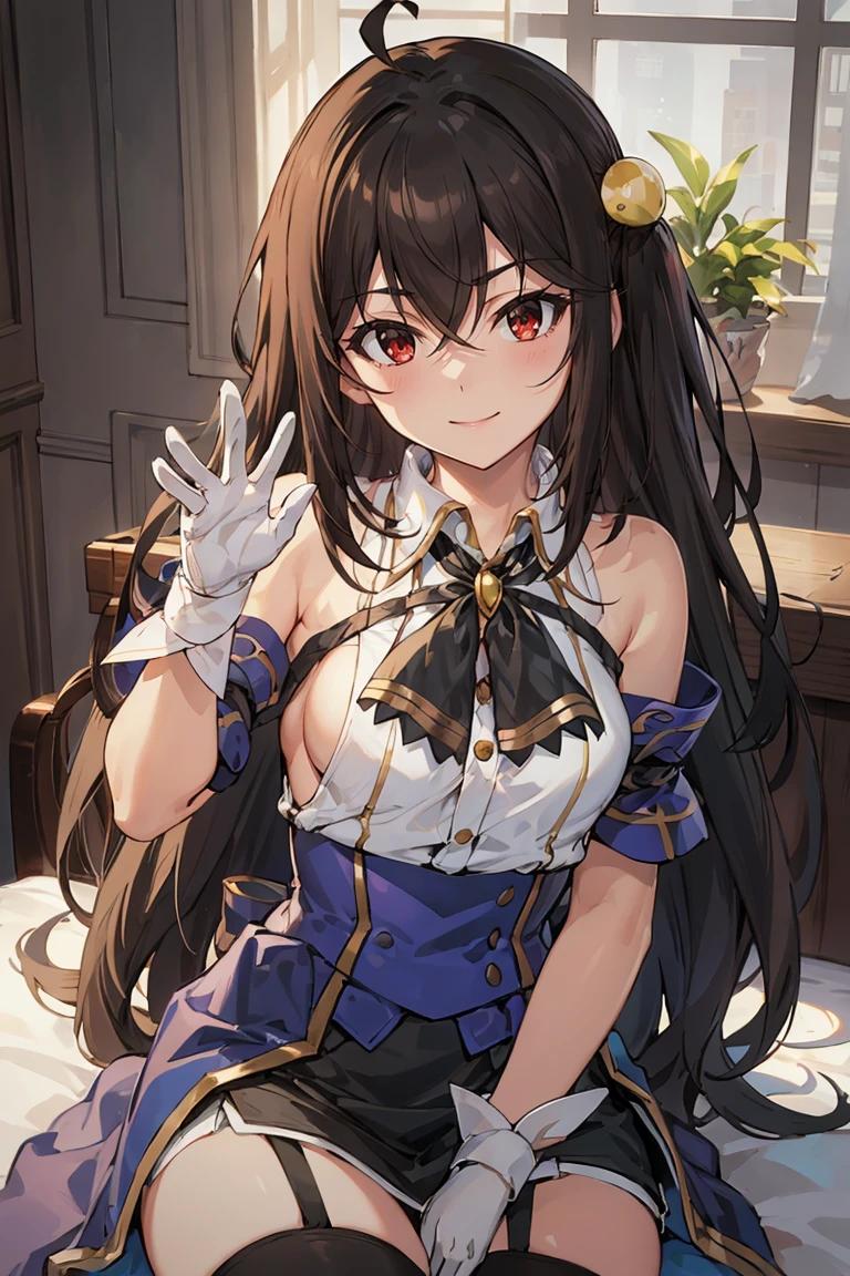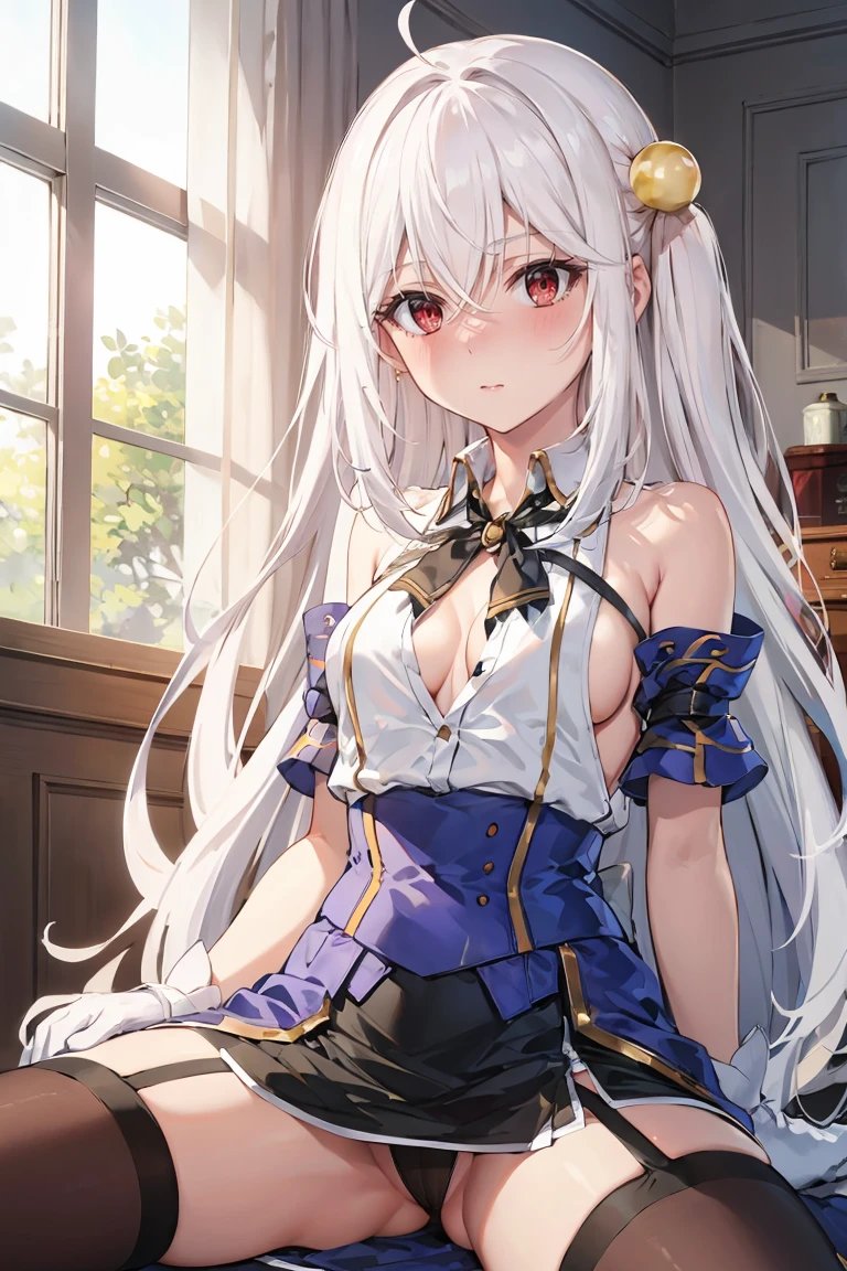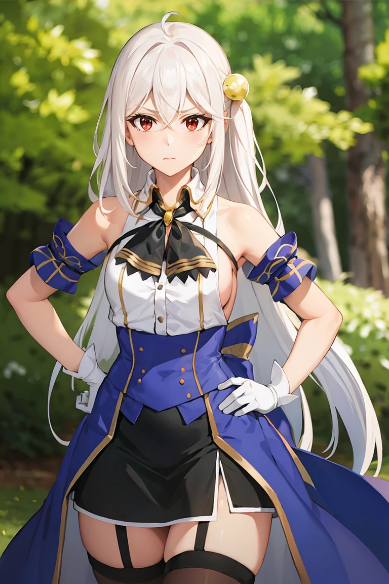 Outfit: white shirt, bare shoulders, black neck ribbon, black skirt, blue corset, blue armlets, sideboob, white gloves, garter straps, brown thighhighs