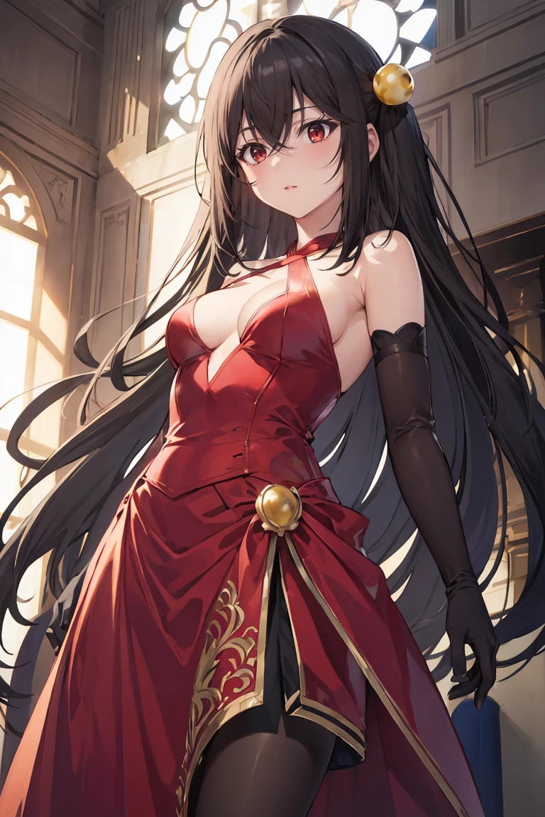 You can made her with black hair. Simply add "black hair". Some outfits may not be flexible. Play with tags weights and add a more detailed description of the outfit. This happened because I was not happy with the results several times and sacrificed flexibility in exchange for the desired picture (for me). "bare shoulders" can be changed with "sleeveless". Use what you like more.
