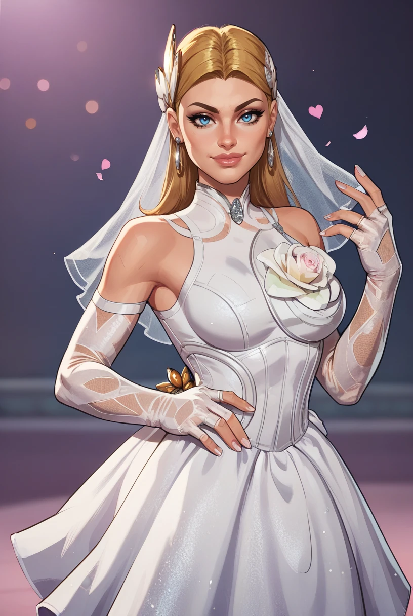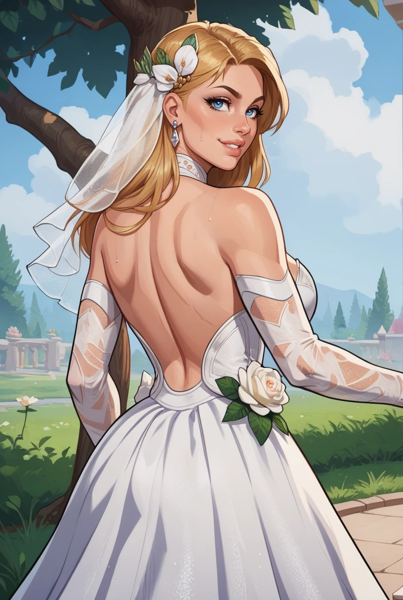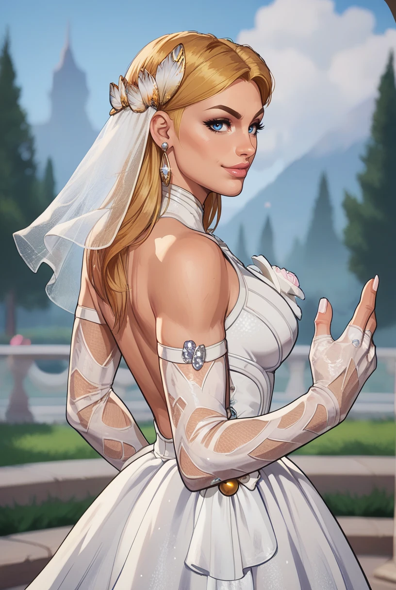 Susan Storm, long blonde hair, half-up hairstyle, elegant hair, golden hair ornament, sheer white veil, elegant wedding dress, backless dress, intricate floral patterns, Asymmetrical gloves, sheer fabric, high heels, golden accents,