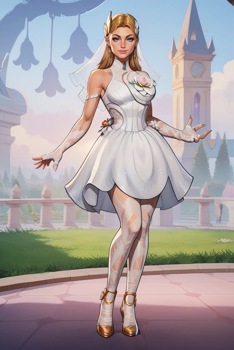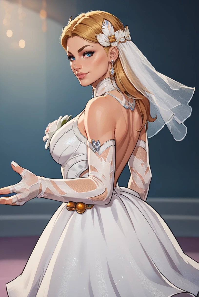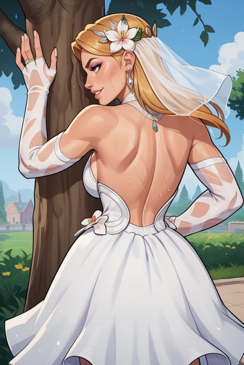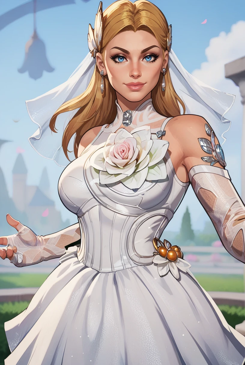 Susan Storm, long blonde hair, half-up hairstyle, elegant hair, golden hair ornament, sheer white veil, elegant wedding dress, backless dress, intricate floral patterns, Asymmetrical gloves, sheer fabric, high heels, golden accents,