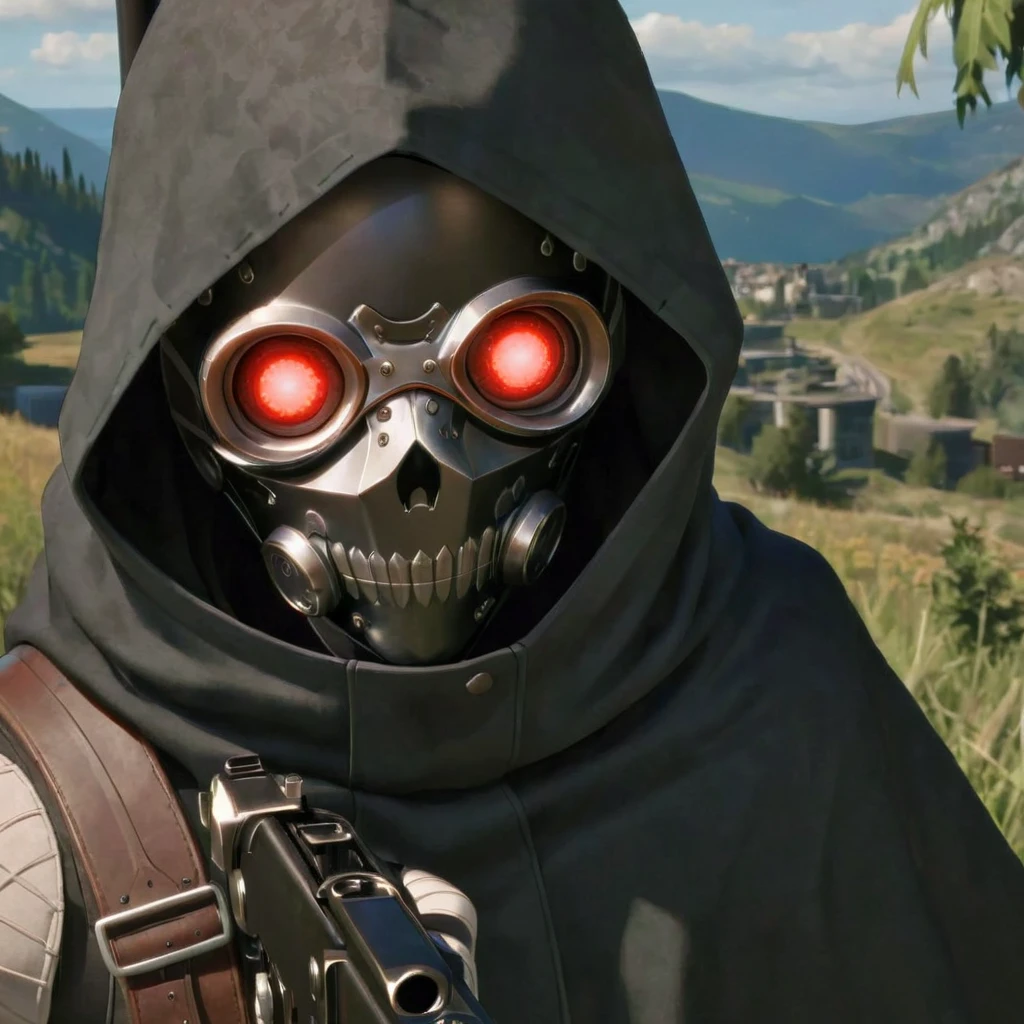 Ideal prompt: d34thgun, man wearing a cyberpunk skull mask with glowing red eyes, muscular stature, full face mask, metallic gasmask, wrapped in bandages, cloak, pistol, kevlar armor,1boy, male focus, closeup