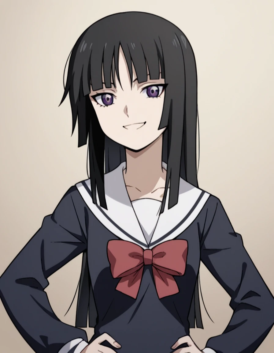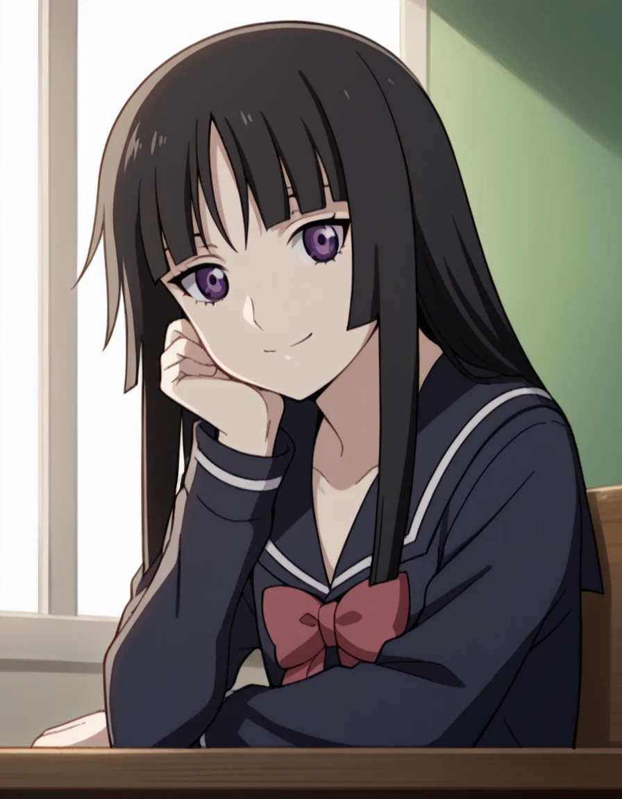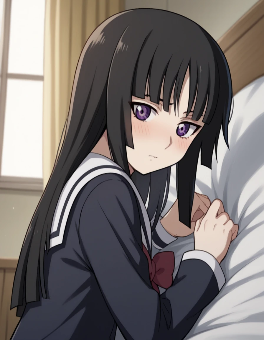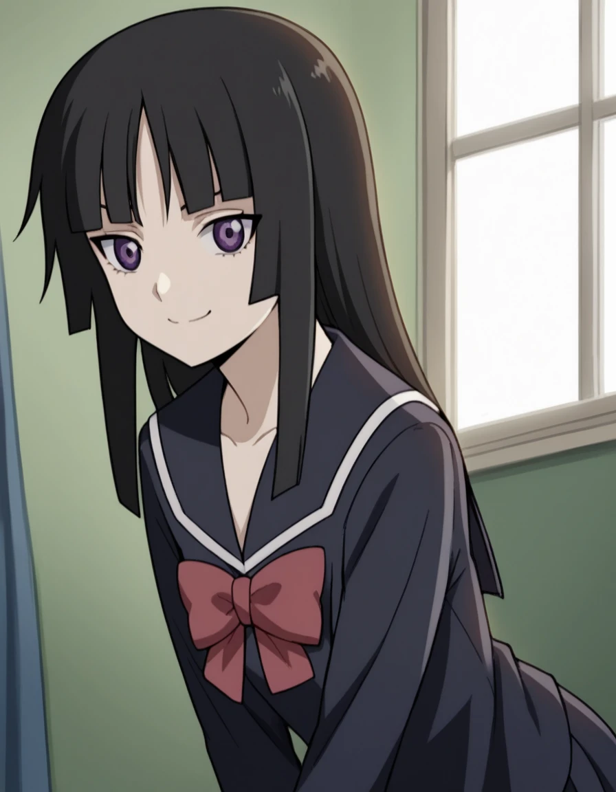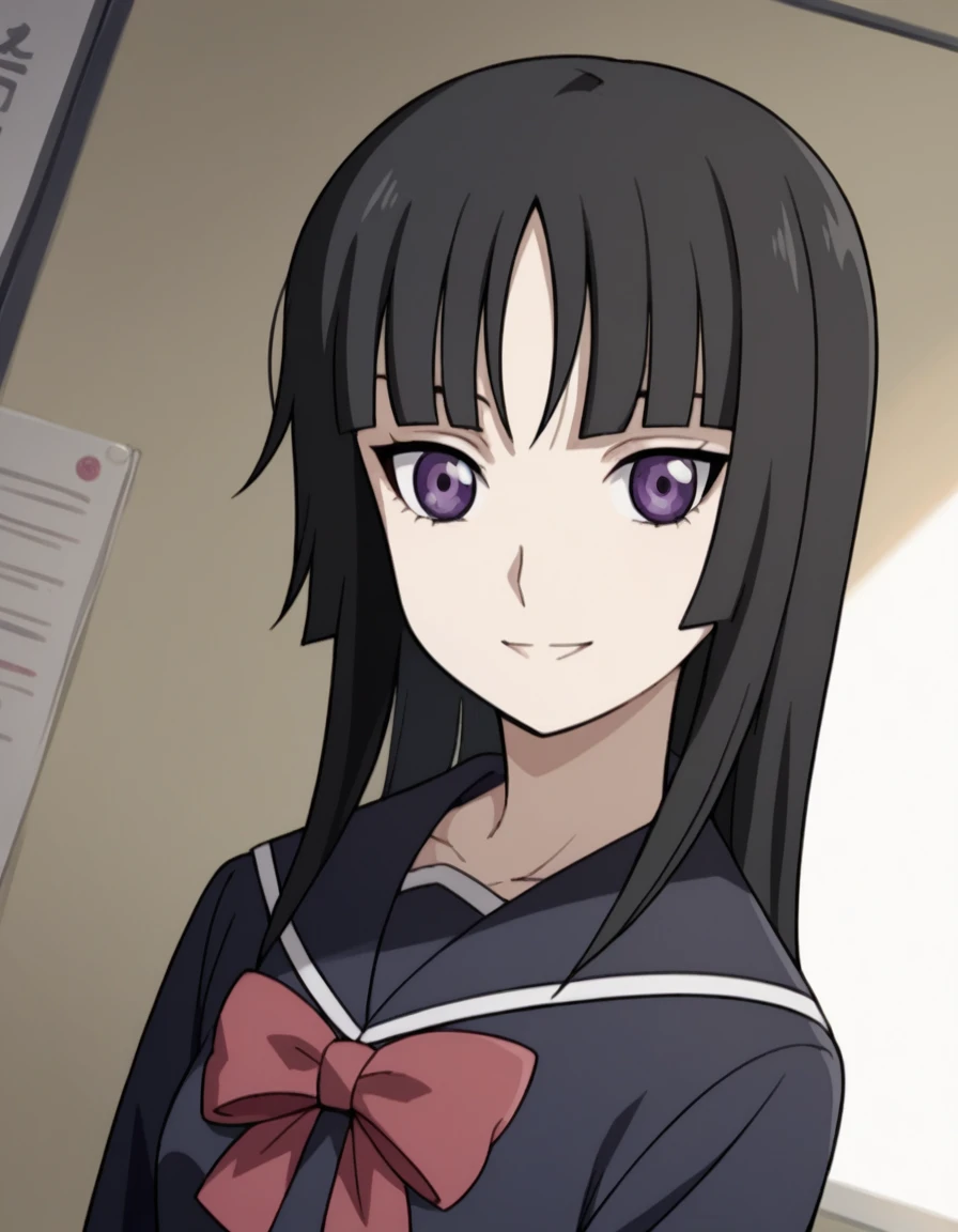<lora:yomi-isayama-s1-ponyxl-lora-nochekaiser:1>, yomi isayama, long hair, bangs, black hair, purple eyes, blunt bangs, hime cut