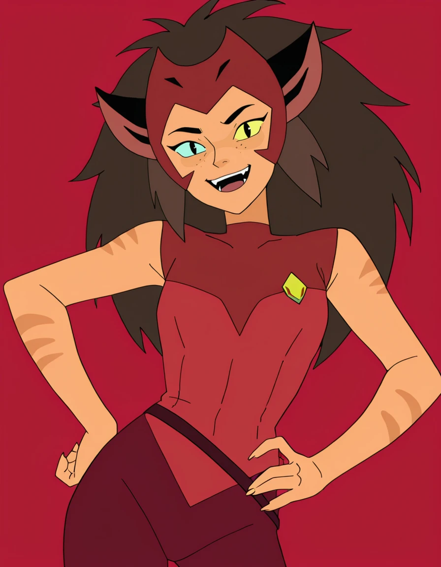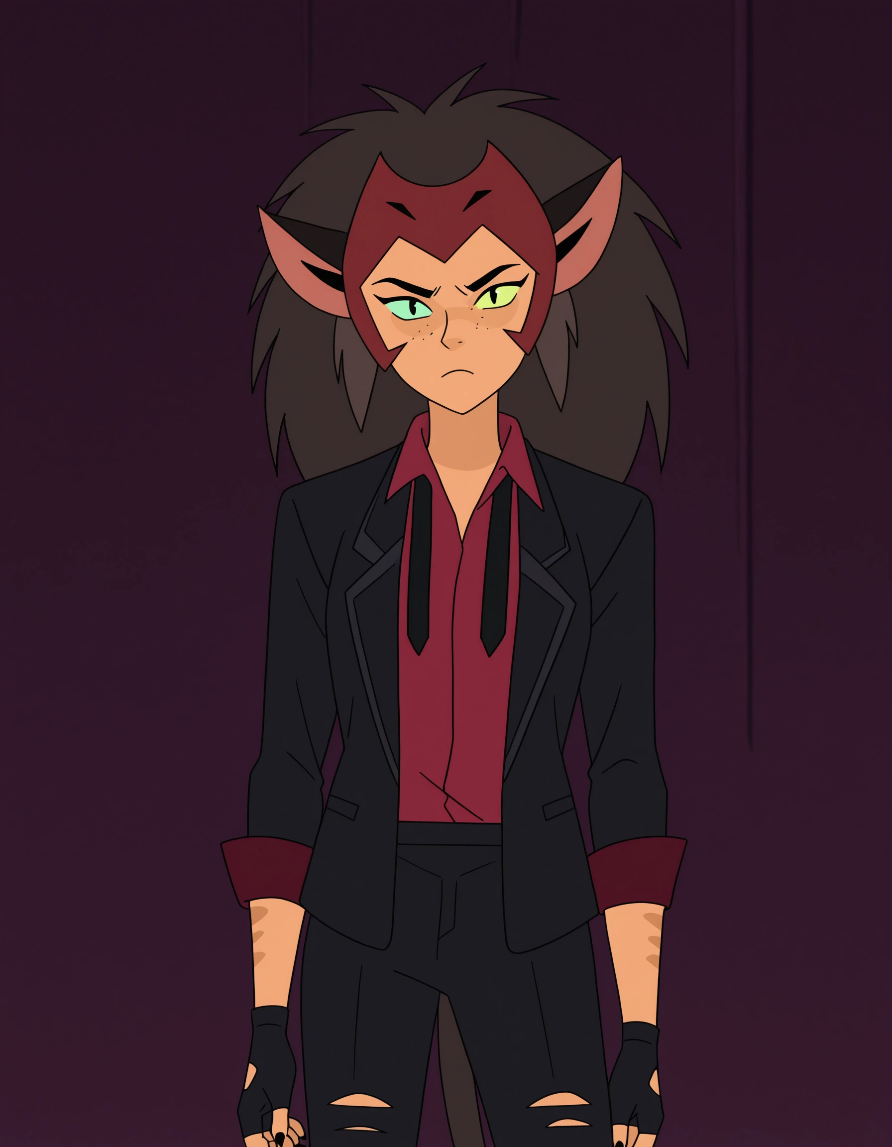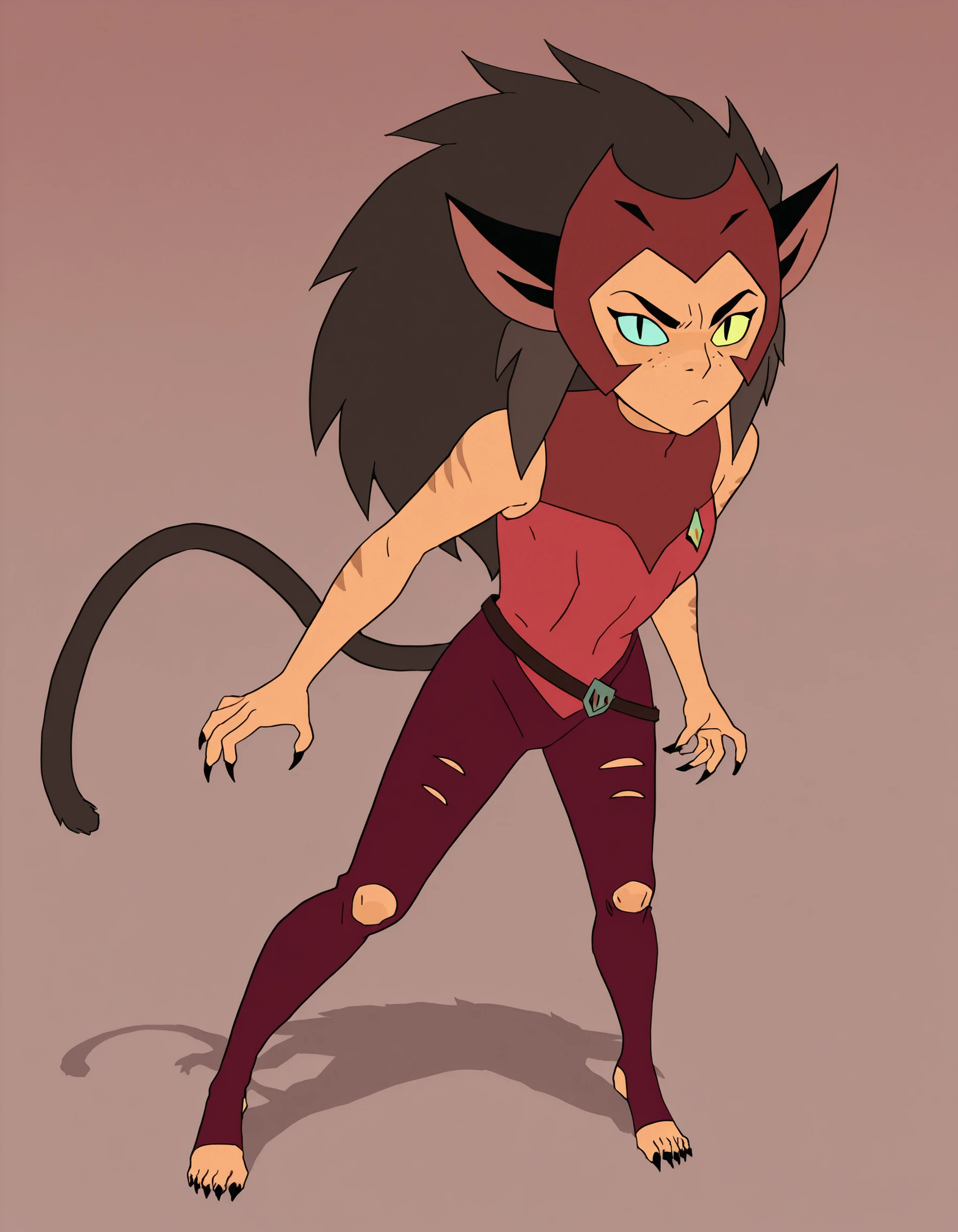 catra,s1, 1girl, solo, pointy ears, brown hair, big hair, sleeveless shirt, heterochromia, headdress,red bodysuit,sharp fingernails,slit pupils, toeless legwea,sharp toenails,torn pants, tail