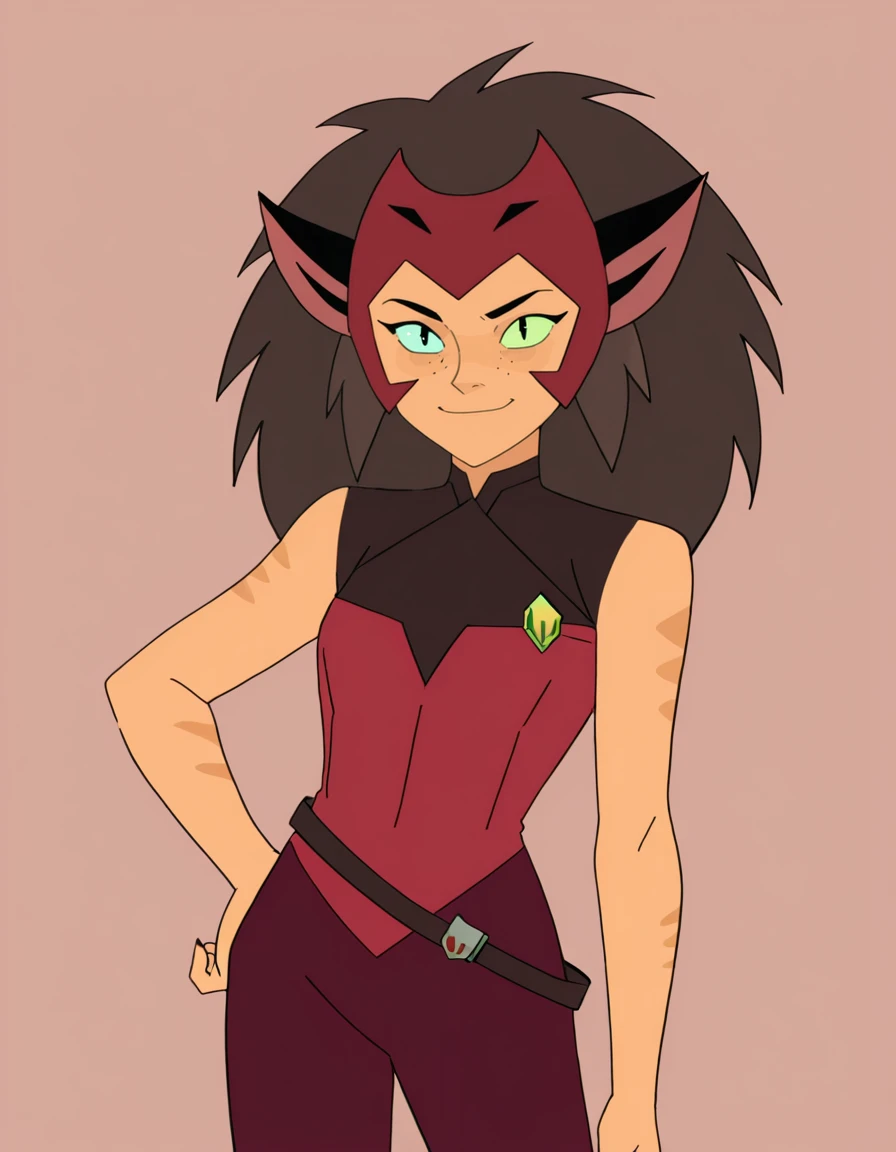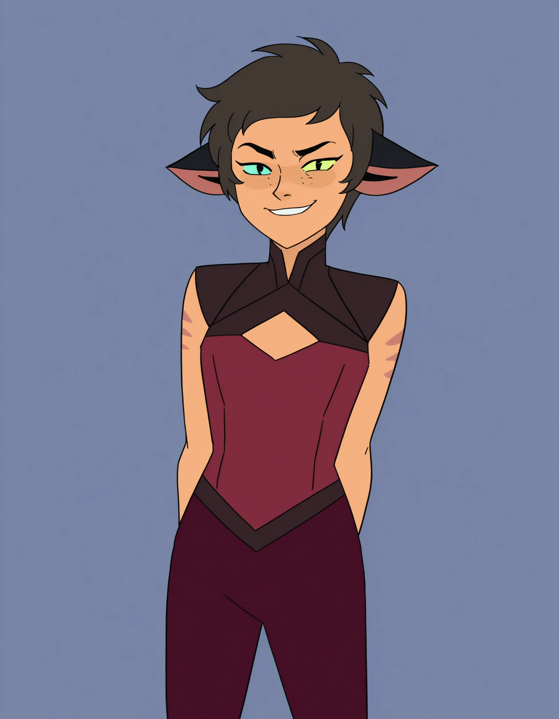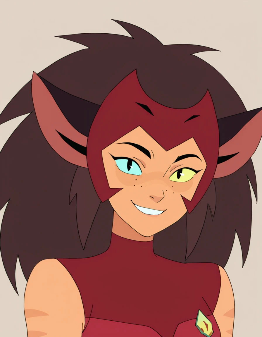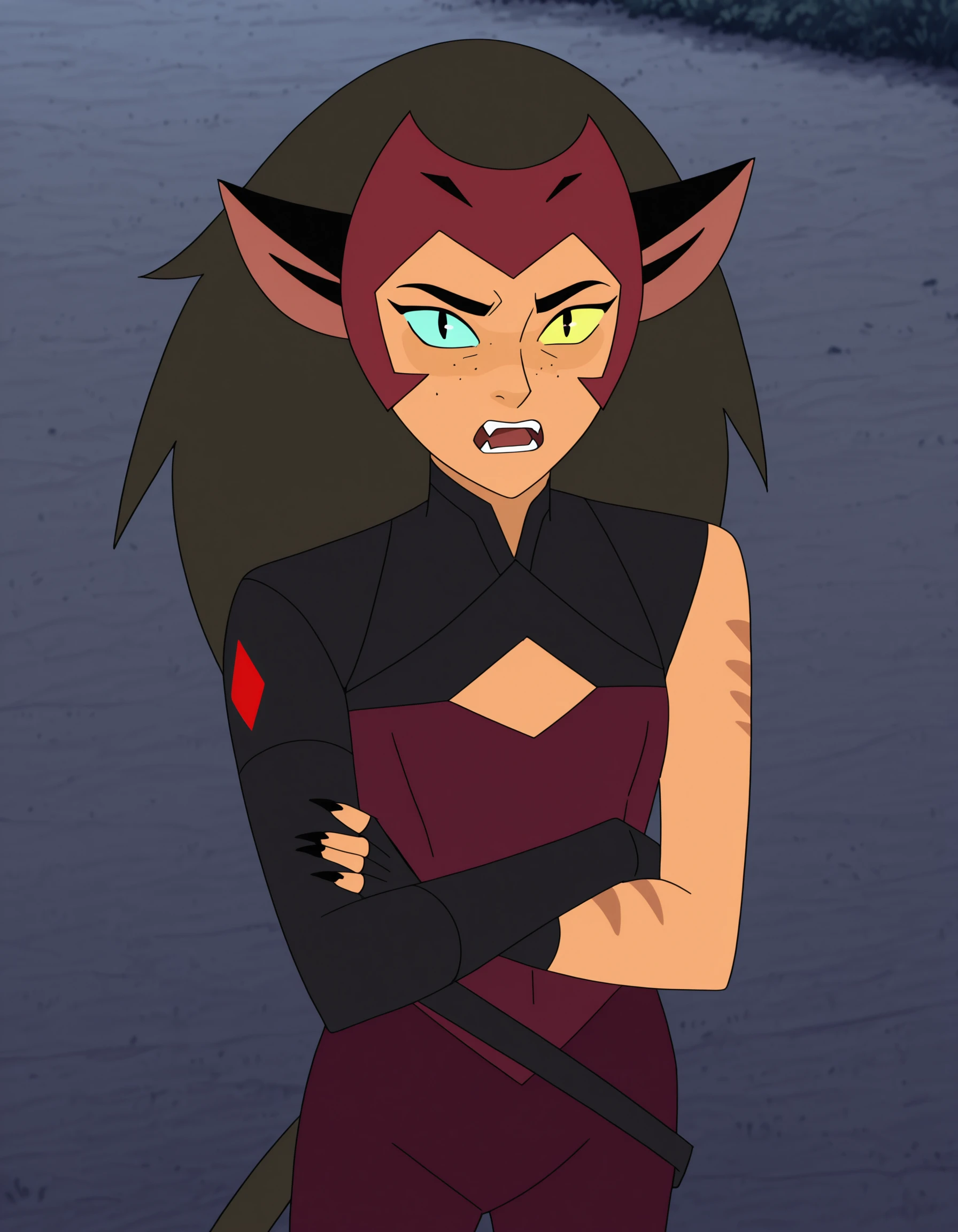 catra,s1, 1girl, solo, pointy ears, brown hair, big hair, sleeveless shirt, heterochromia, headdress,red bodysuit,sharp fingernails,slit pupils, toeless legwea,sharp toenails,torn pants, tail