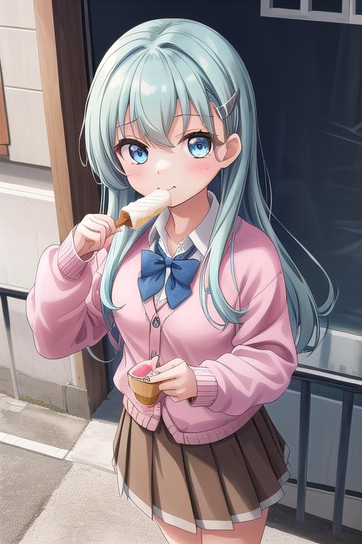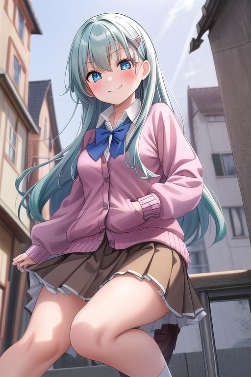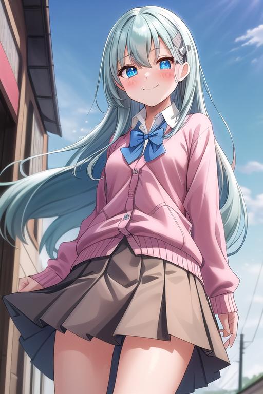 Modern jk outfit : suzuyajkkc,long hair, skirt, shirt, hair ornament, long sleeves, white shirt, pleated skirt, hairclip, collared shirt, (blue)bowtie, aqua eyes, cardigan, brown skirt, pink cardigan