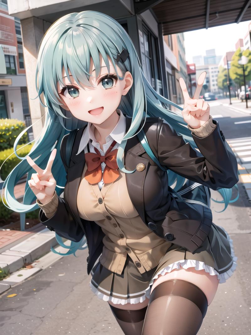 Kaini outfit : suzuyakainikc, aqua hair, aqua eyes,1girl, solo,green hair, long hair,skirt, hair ornament, bow, school uniform, jacket,pleated skirt, hairclip,cardigan, brown skirt, brown jacket, brown thighhighs,frilled skirt,