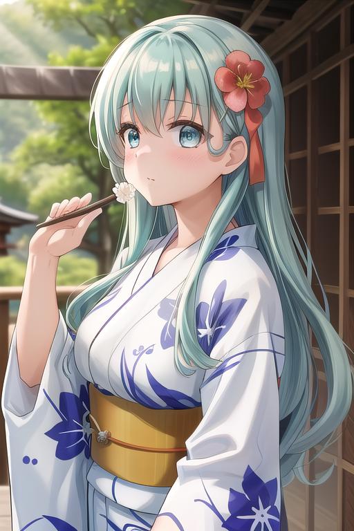 Yukata outfit : suzuyayukatakc, aqua hair, aqua eyes, long hair, hair ornament, hair flower, wide sleeves, sash, obi, floral print,white yukata,