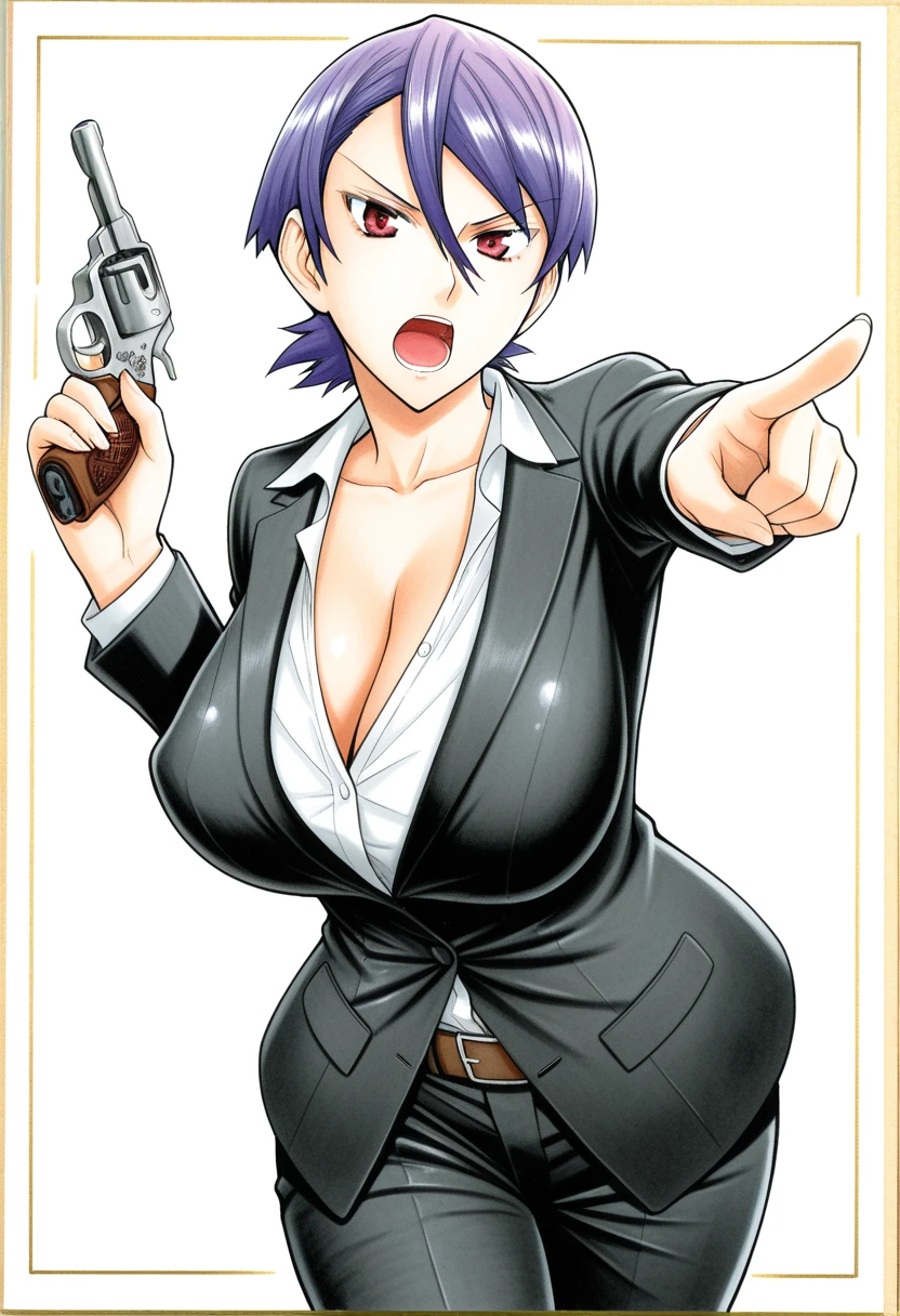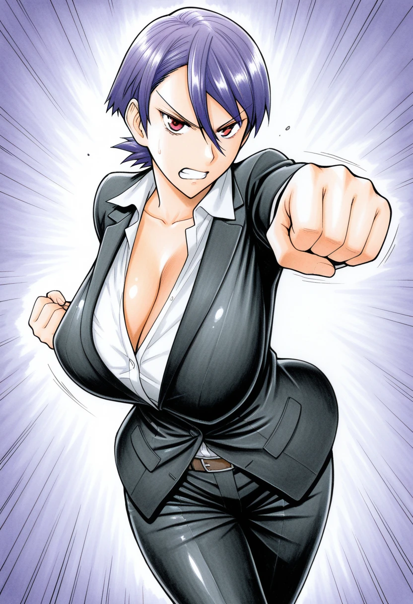 hitomi_kijima_magicalize, short hair, hair between eyes, purple hair, red eyes, large breasts,Main outfit: