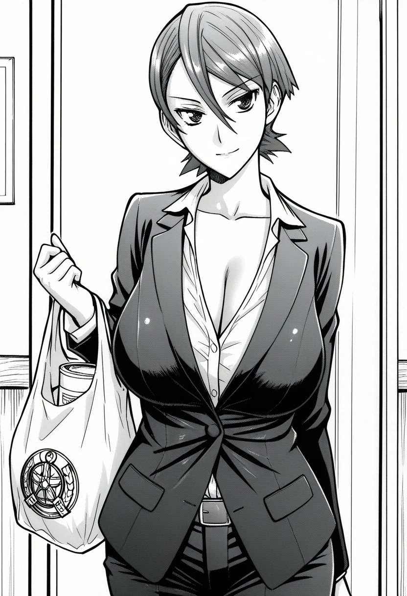 black suit, white shirt, black pants, brown belt, cleavageOptional outfit: