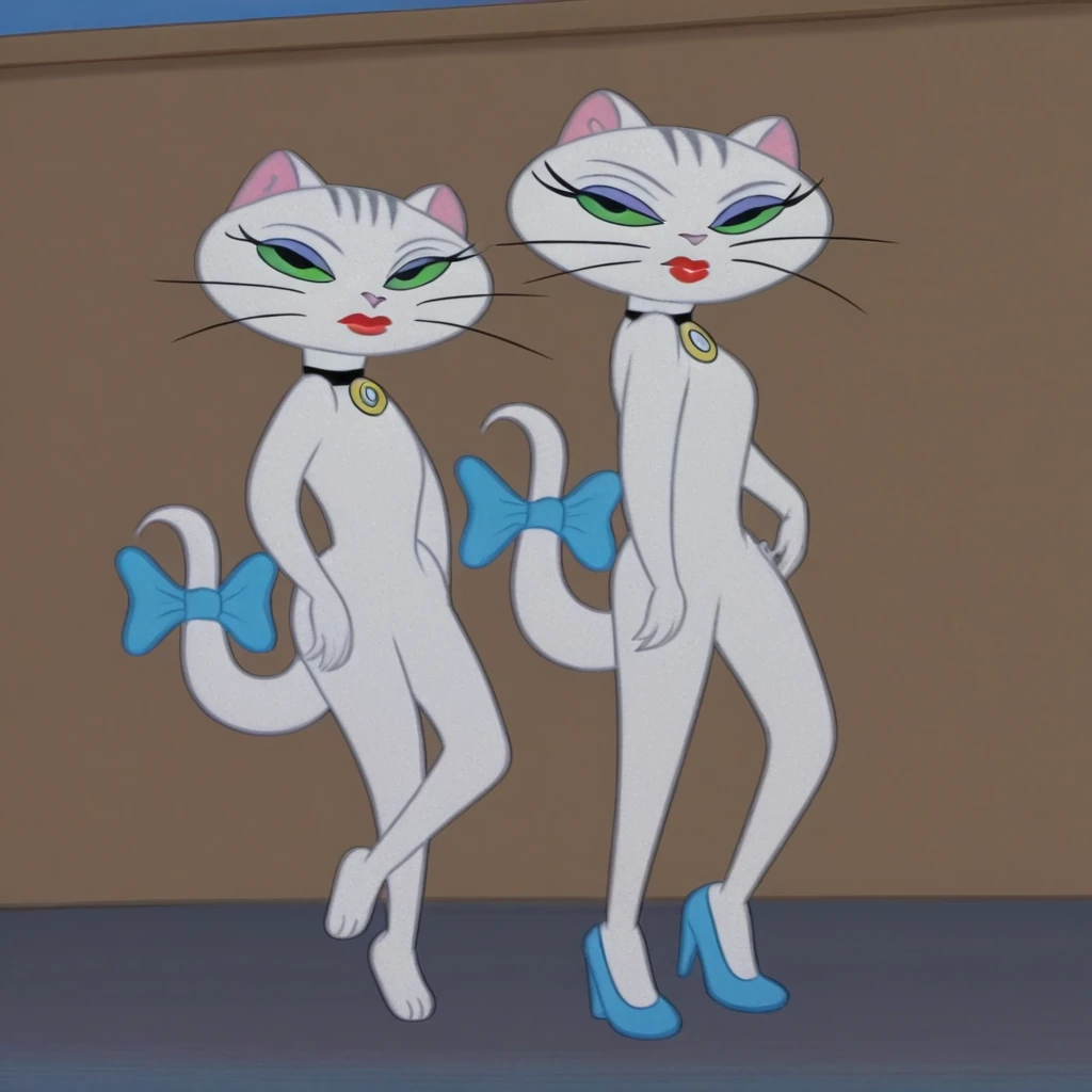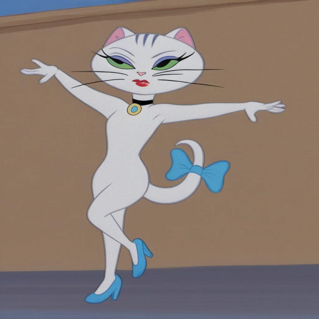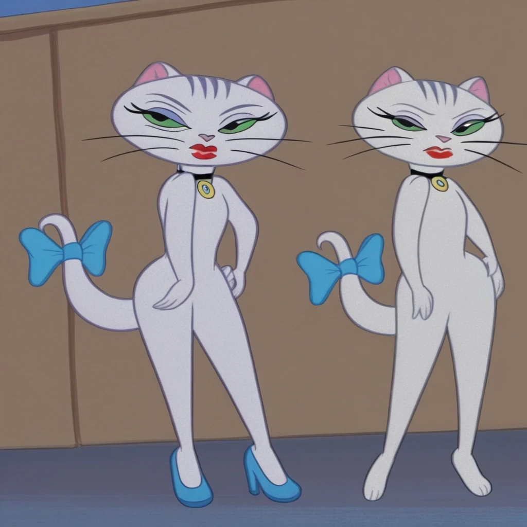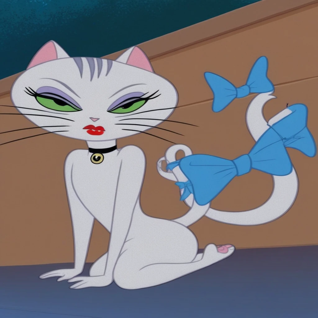 GalCatTomandJerryBCB, White Cat Girl, feminine, green eyes, purple makeup, Red Lipstick, three grey stripes on her head, white skin, cat tail, light blue ribbon on her tail, choker,