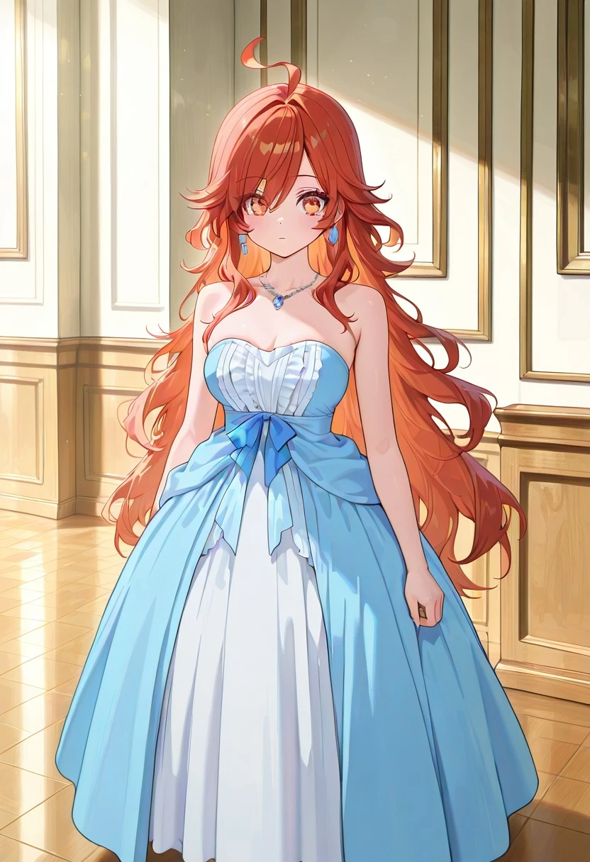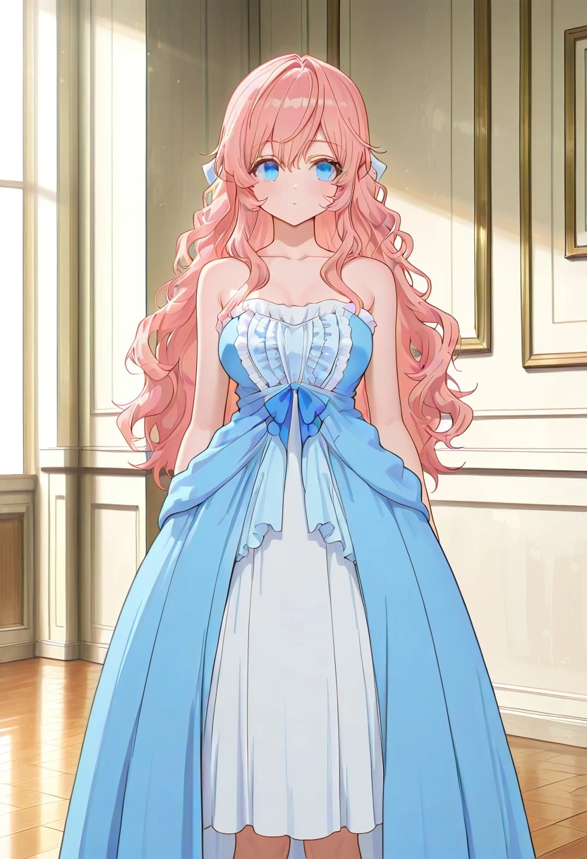 Trarsclstyl, formal dress, strapless dress, corset dress, ruffled bodice, layered dress, long dress, floor-length dress, wide skirt, princess dress, two-tone dress, blue dress, light blue dress, white dress, bow on , fabric folds