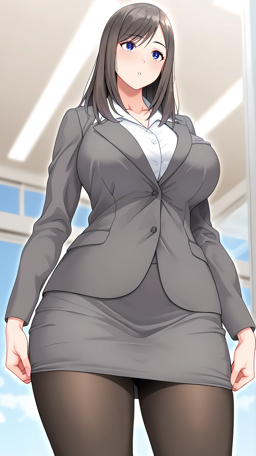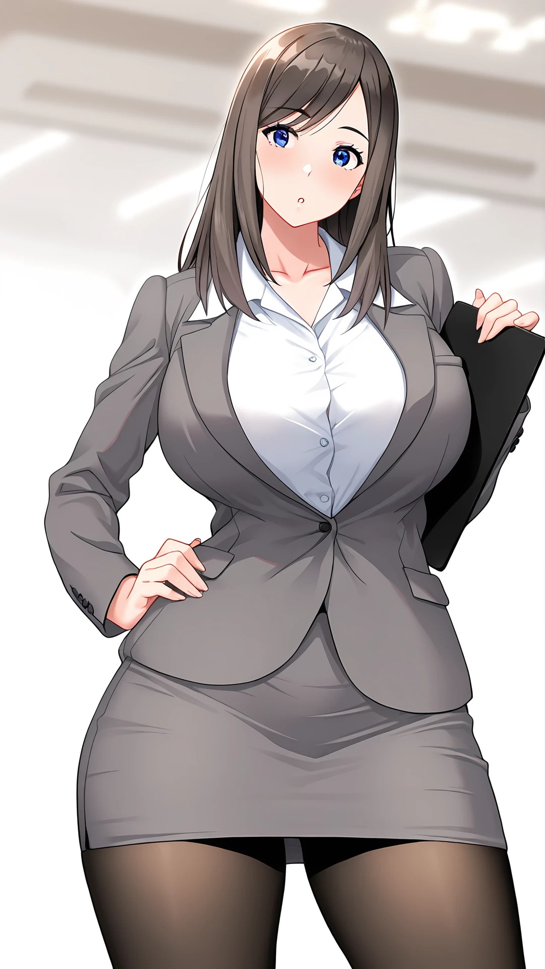 ,kagurazaka yui,1girl,solo,office lady,pantyhose,skirt,blue eyes,pencil skirt,breasts,long hair,formal,suit,skirt suit,brown hair,jacket,large breasts,black pantyhose,standing,shirt,black hair,business suit,