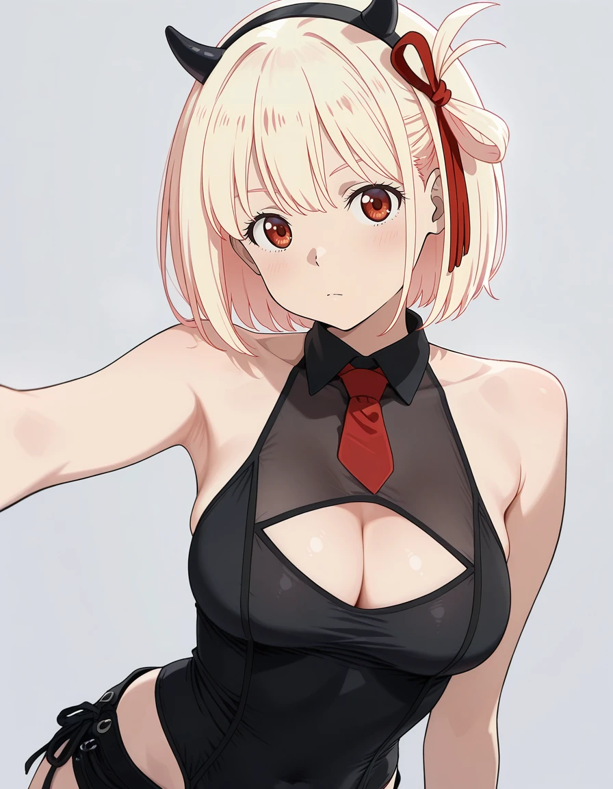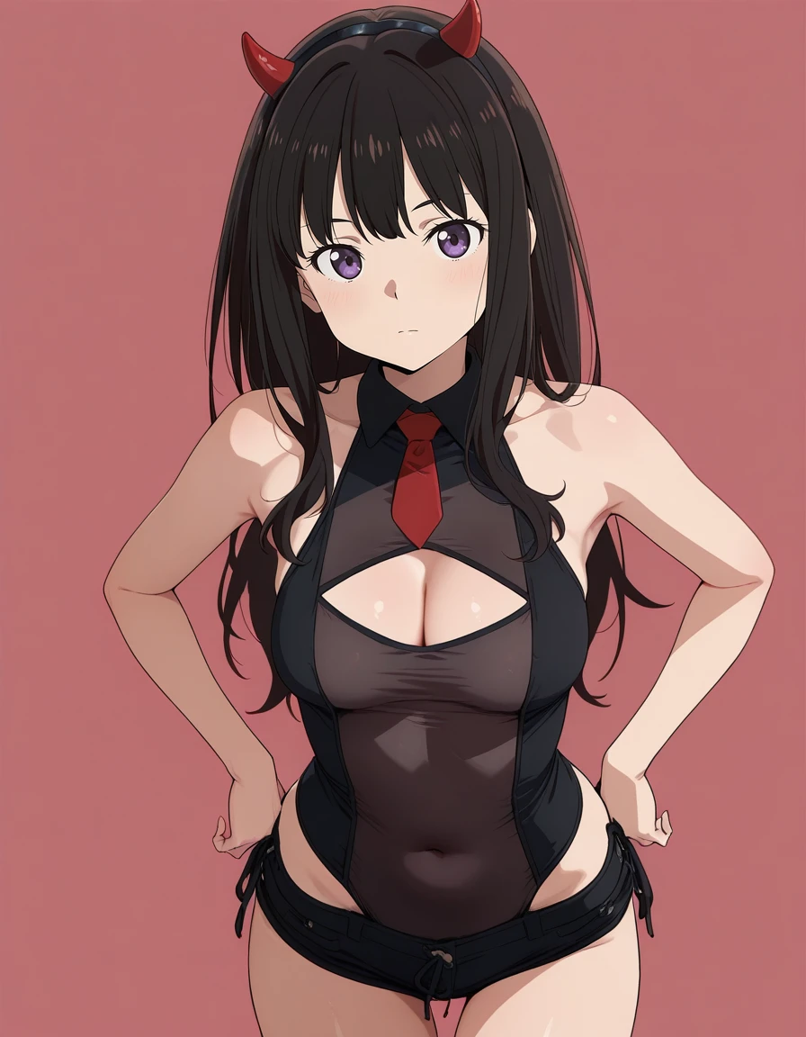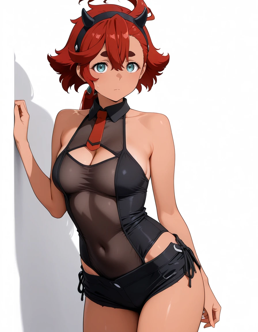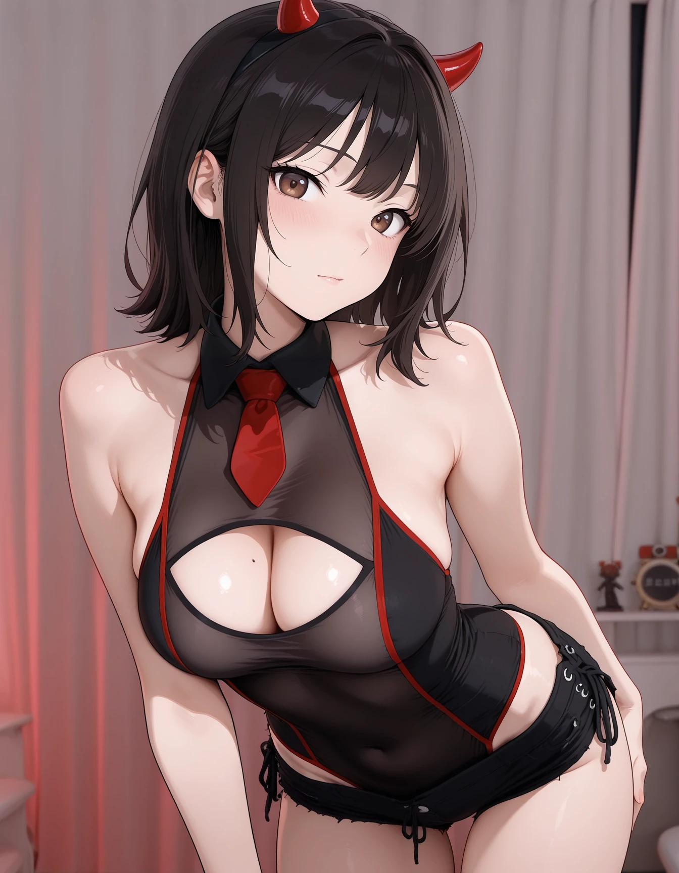 mai_leotard,cleavage_cutout,black_leotard,black_shorts,see-through,red_necktie,fake_horns, demon_horns