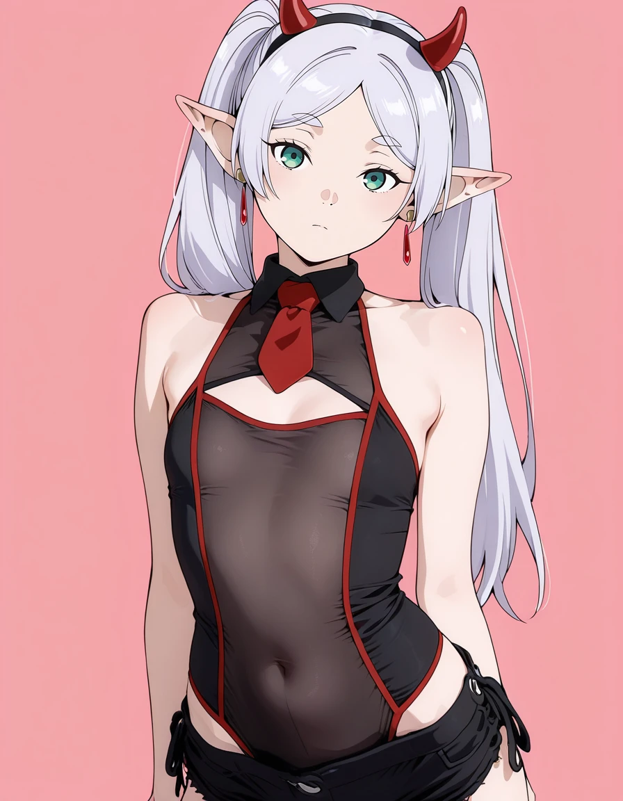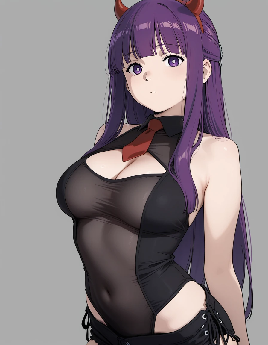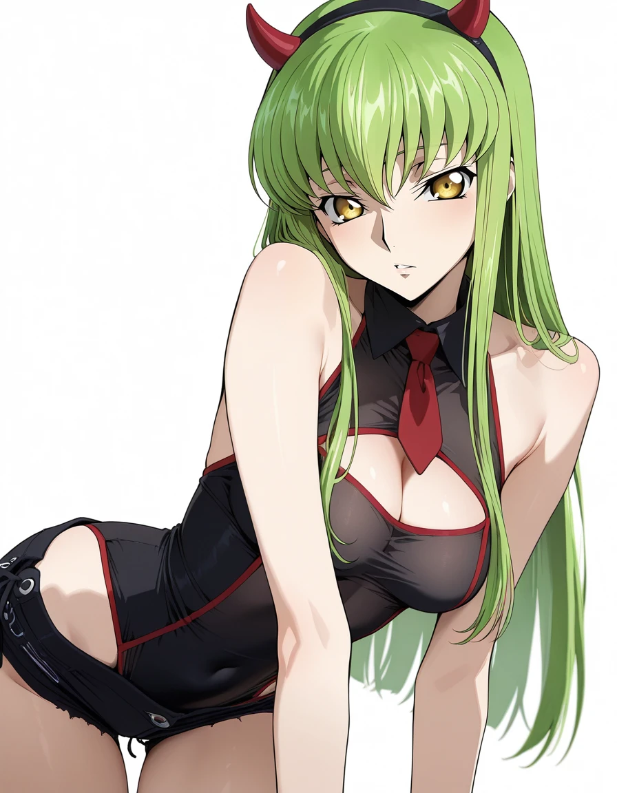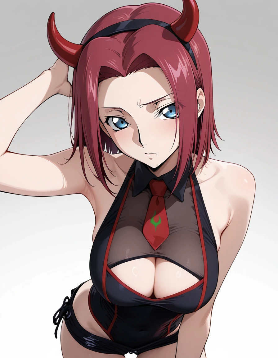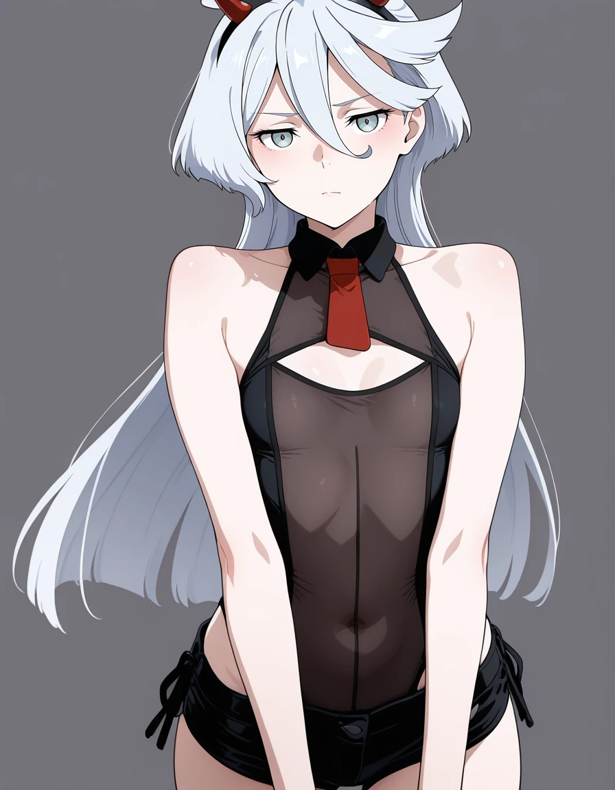 mai_leotard,cleavage_cutout,black_leotard,black_shorts,see-through,red_necktie,fake_horns, demon_horns