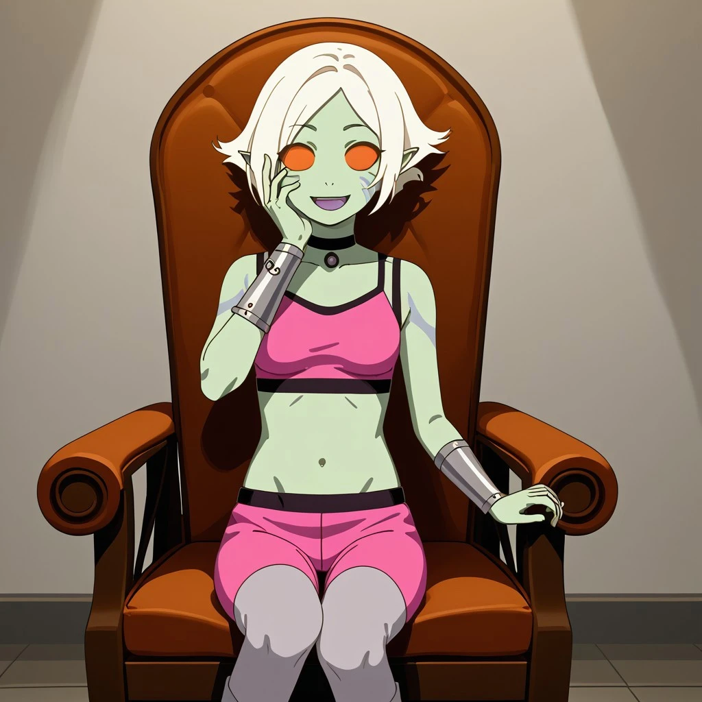 1girl,solo,white hair,pointy ears,choker,purple crop top,navel,purple shorts,grey thighhigh boots,sliver bracers,dark orange eyes,no pupils,dark orange sclera,green skin