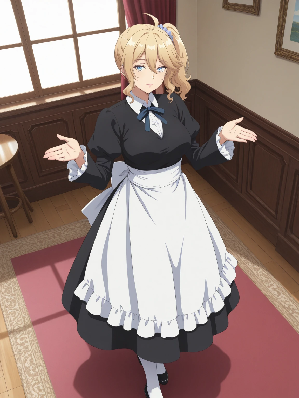• Clothes: maid uniform, high collar, neck ribbon, long sleeves, waist apron, white stockings, black shoes, back bow)