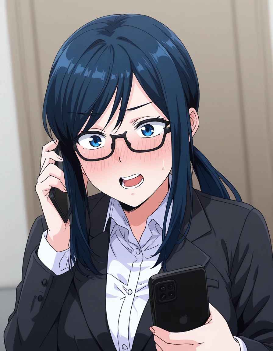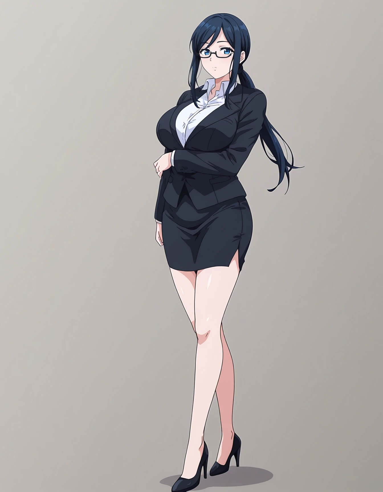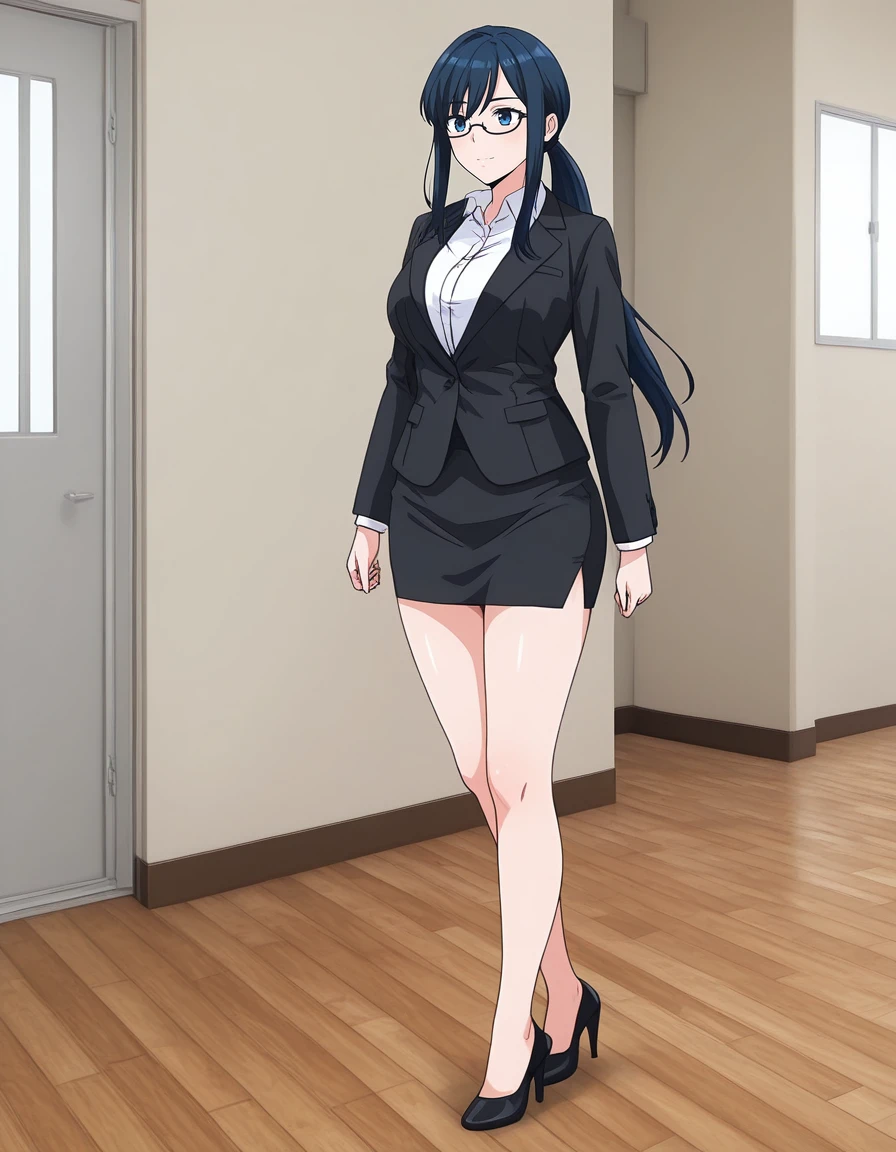 mai_tsnk,mai_ayakotk,mature_female,long_hair,ponytail,dark_blue_hair,blue_eyes,large_breasts,glasses,office_lady,suit,jacket,white_shirt,skirt_suit,pencil_skirt,bare_legs,high_heels