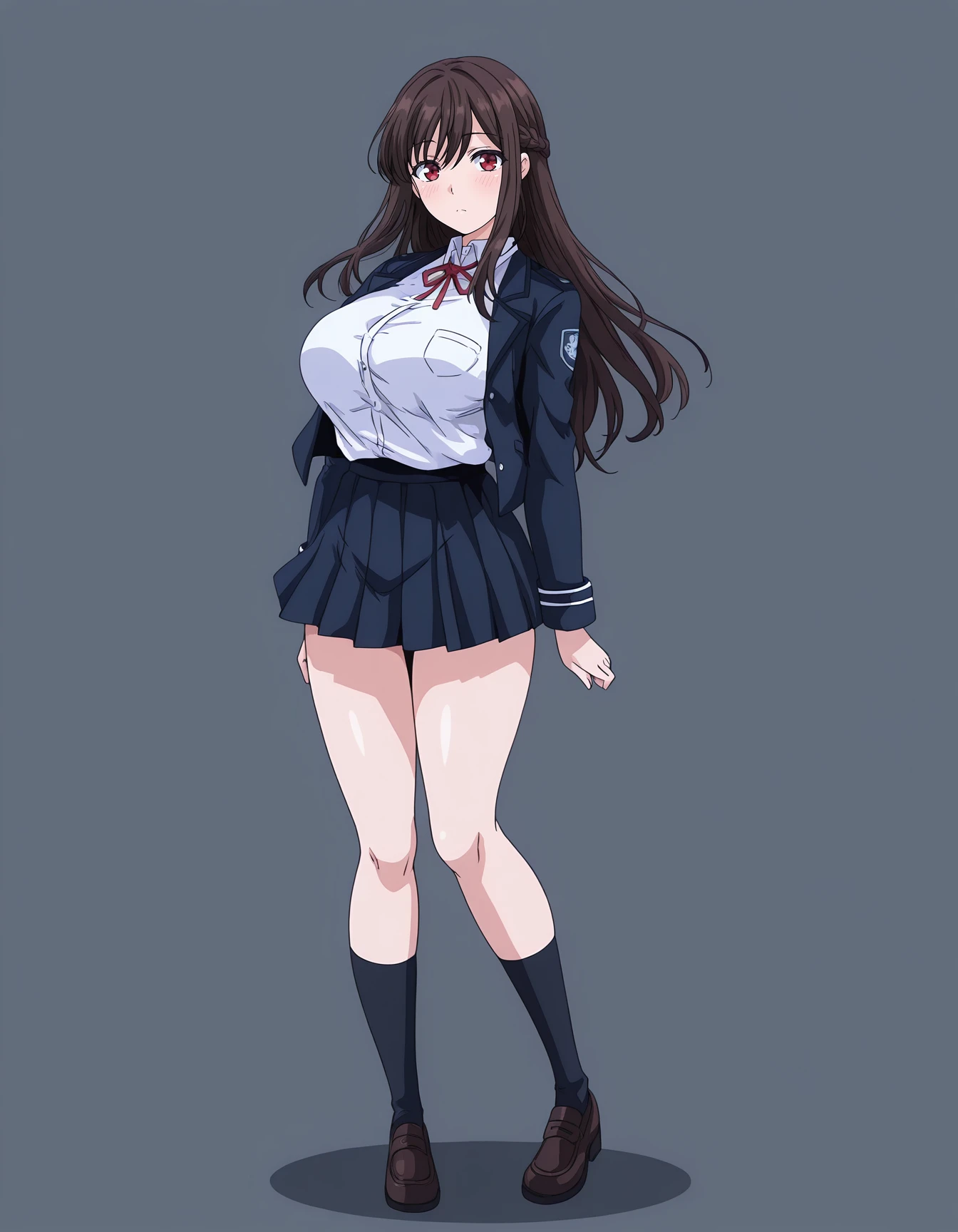 mai_tsnk,mai_yukihatk,long_hair,french_ braid,brown_hair,red_eyes,large_breasts,dark_blue_school_uniform,jacket,white_shirt,pleated_skirt
