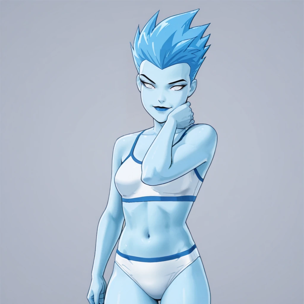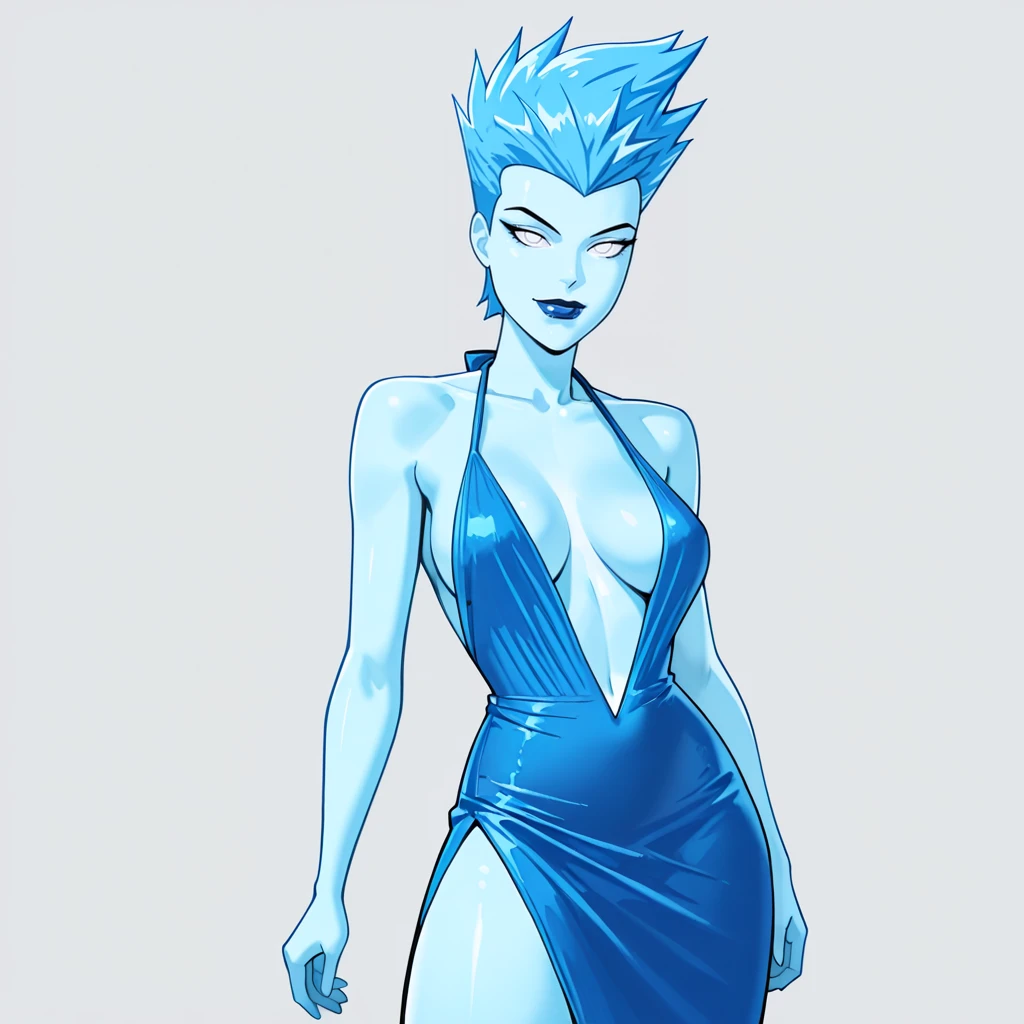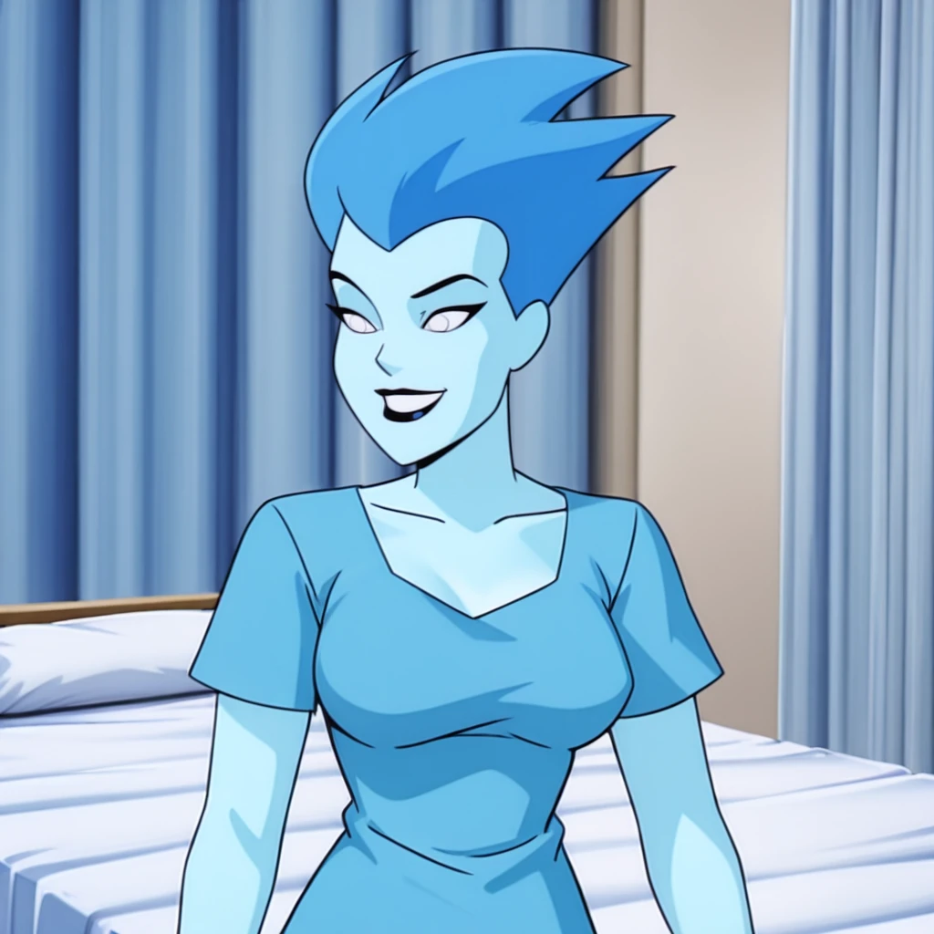Trigger with hospital outfit: LivewireHospital, 1girl, blue skin, blue dress, blue hair, white eyes, breasts, short hair, spiked hair