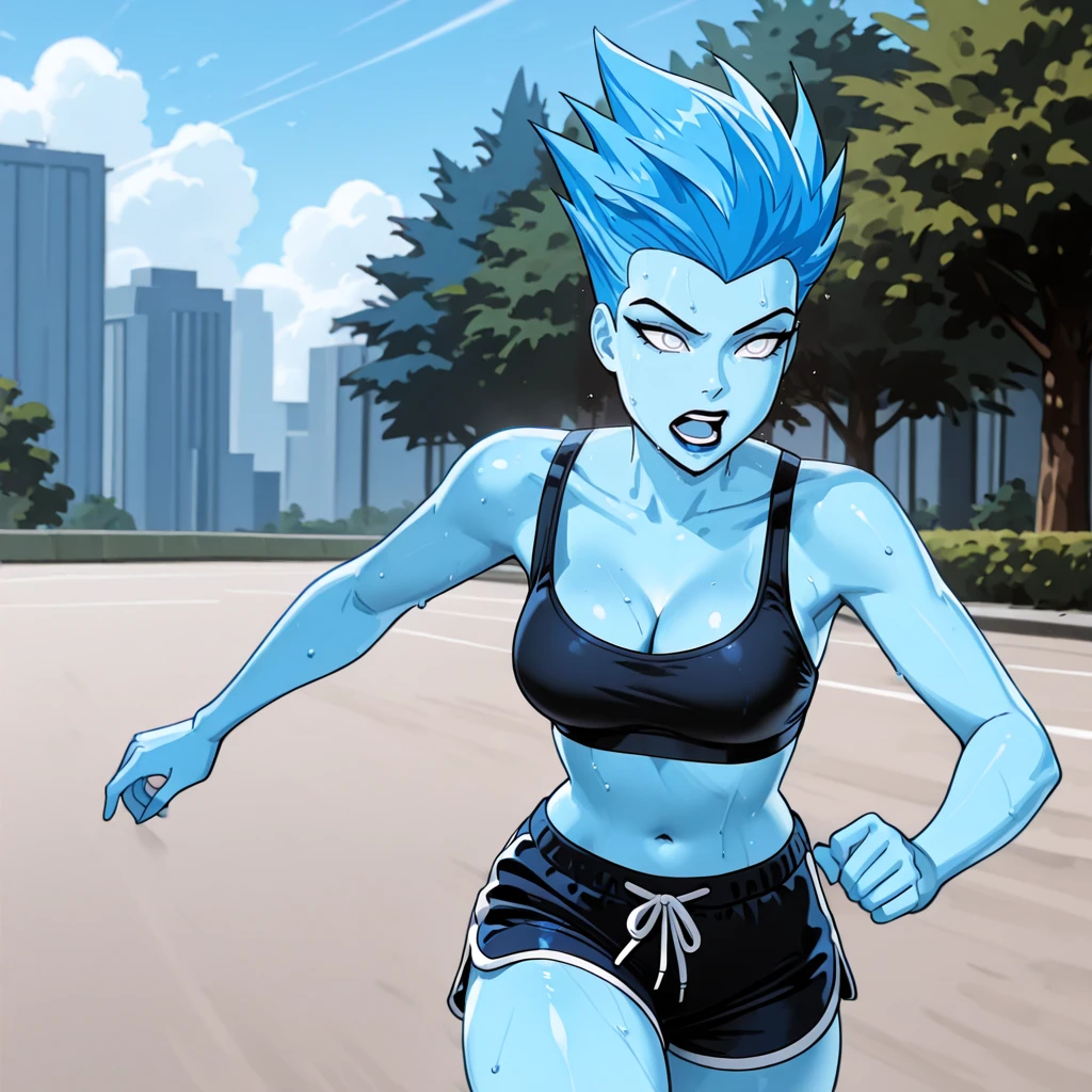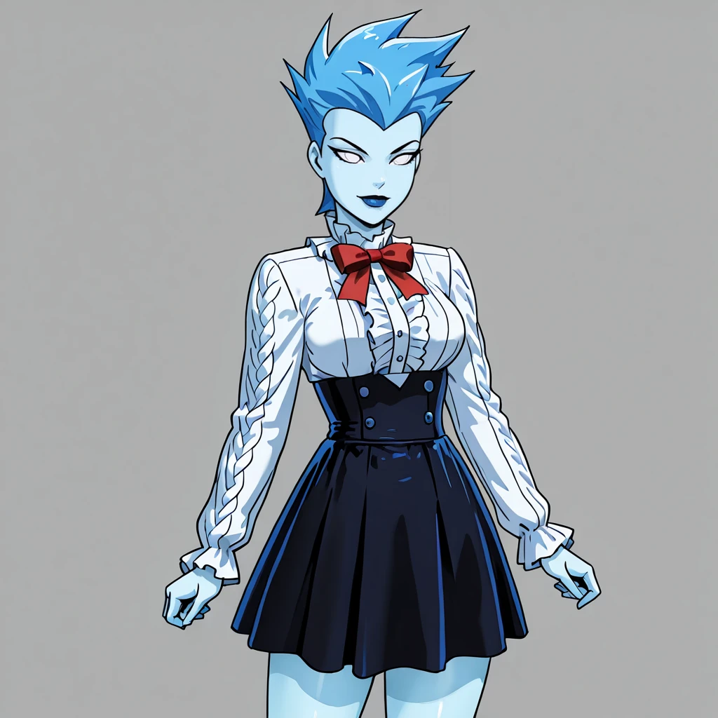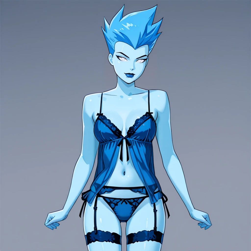Trigger with hospital outfit: LivewireHospital, 1girl, blue skin, blue dress, blue hair, white eyes, breasts, short hair, spiked hair