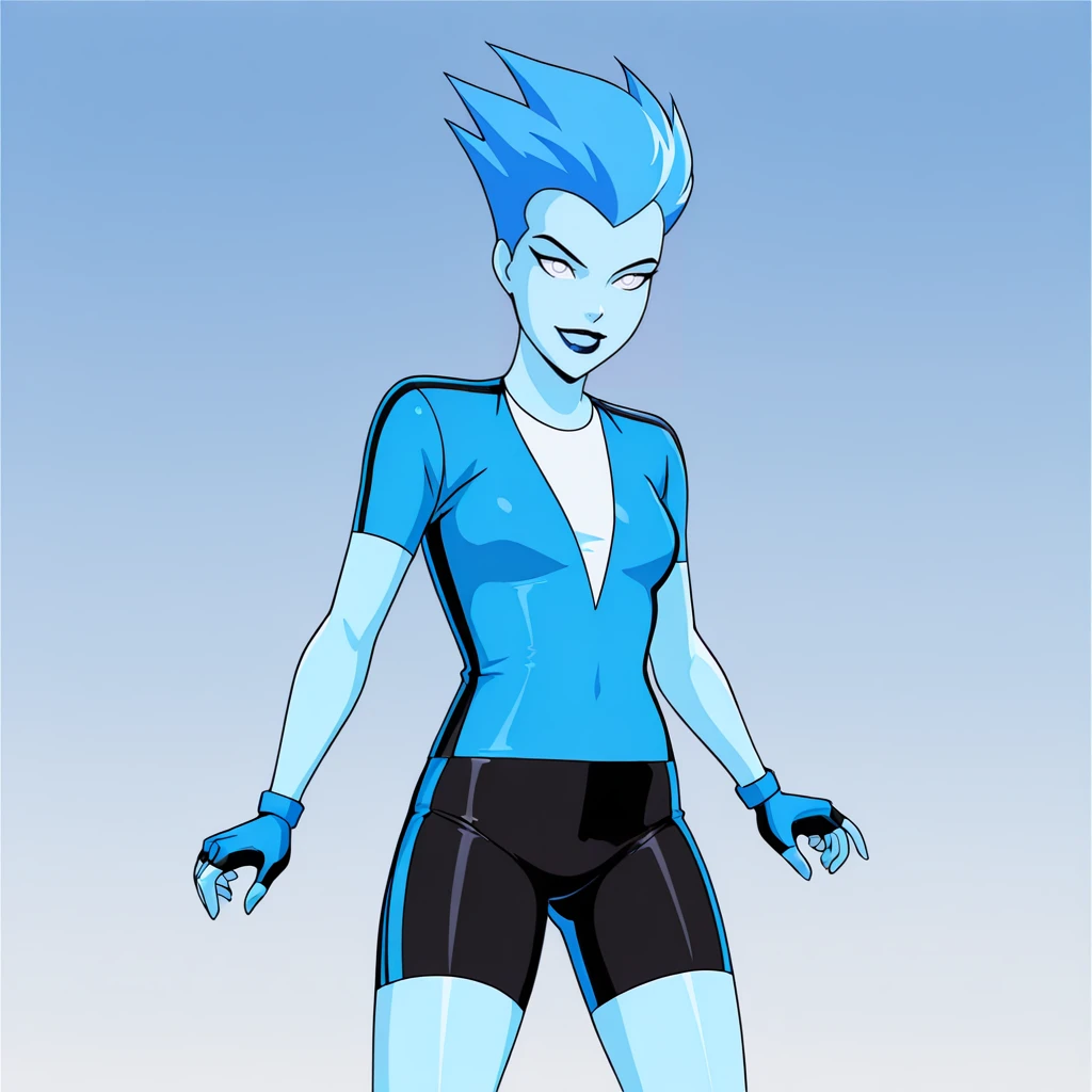 Trigger : Livewire, blue gloves, blue skin, black thighhighs, 1girl, blue hair, blue lips, leotard, white eyes, short hair, spiked hair