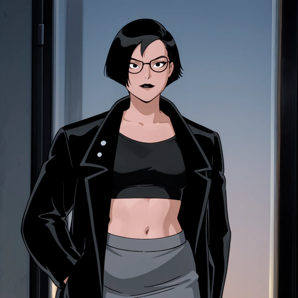 Trigger as leslie: Leslie, black hair, short hair, 1girl, grey skirt, glasses, midriff, navel, black jacket, black eyes, black lips, crop top, coat