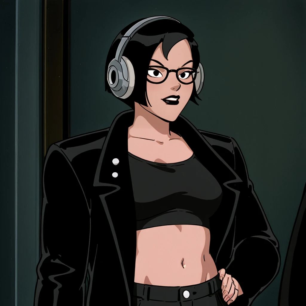 Trigger with headphones: LeslieHeadPhones, 1girl, black hair, glasses, headphones, short hair, black lips, midriff, black jacket, navel, black eyes, pants, makeup, lipstick, crop top, breasts, black-framed eyewear,cowboy shot