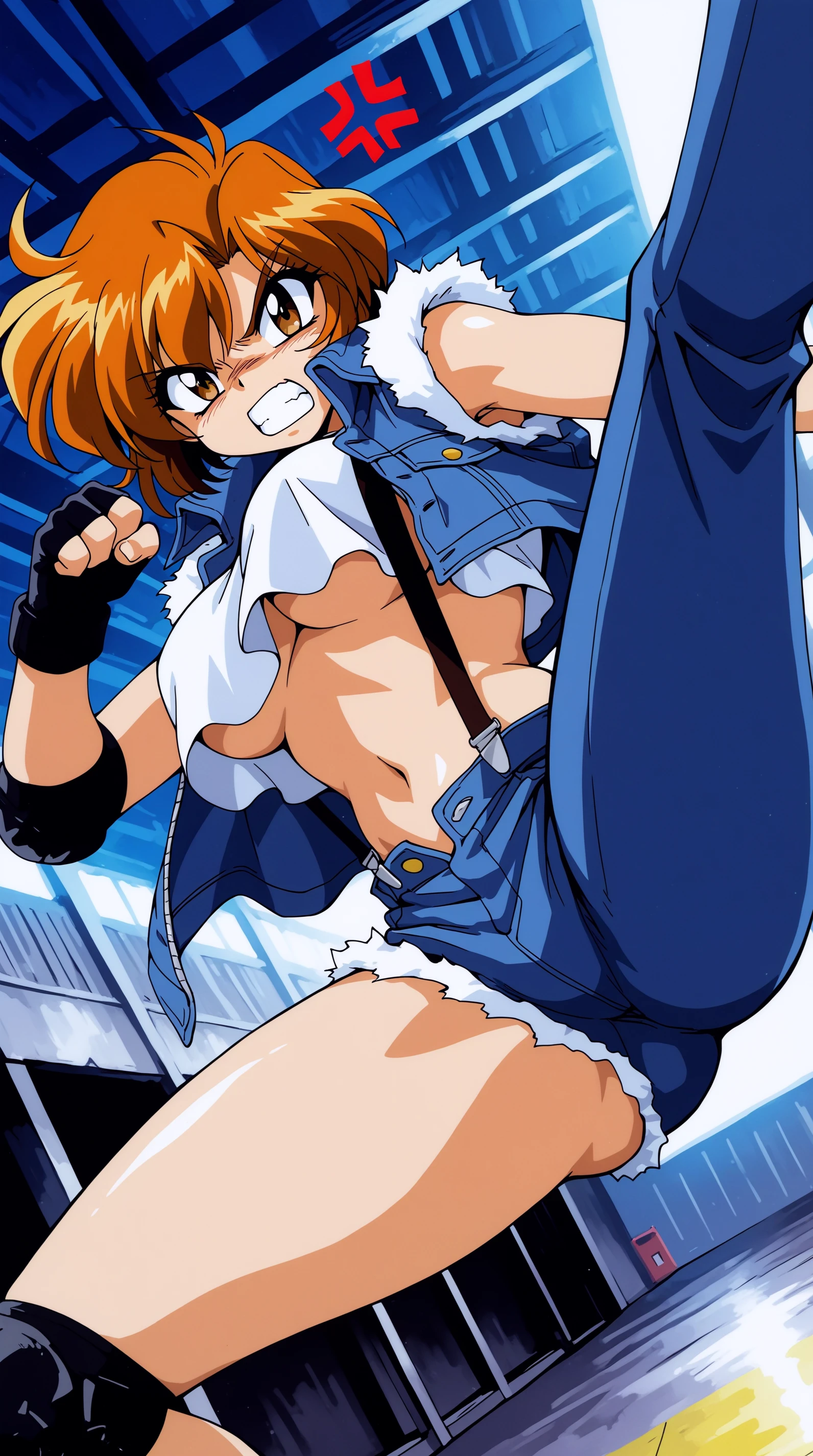 jacket, pants, midriff, crop top, no bra, suspenders, denim, jeans, unzipped, asymmetrical clothes, cutoffs, single pantsleg, torn jeans, fingerless gloves, knee pads, elbow pads
