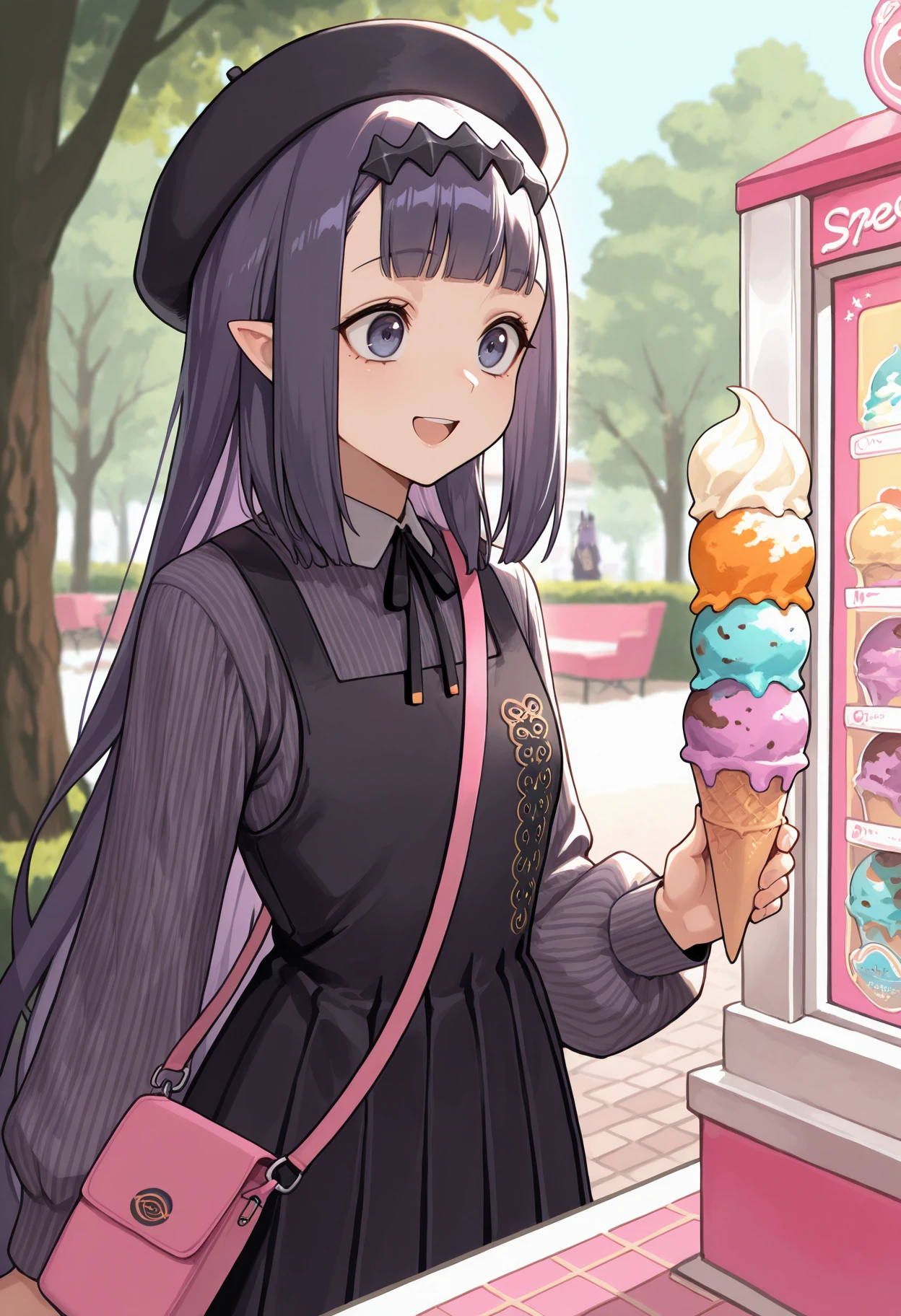 inaina_painter, pinafore dress, pinstripe shirt, beret, black headpiece, pink bag, pantyhose