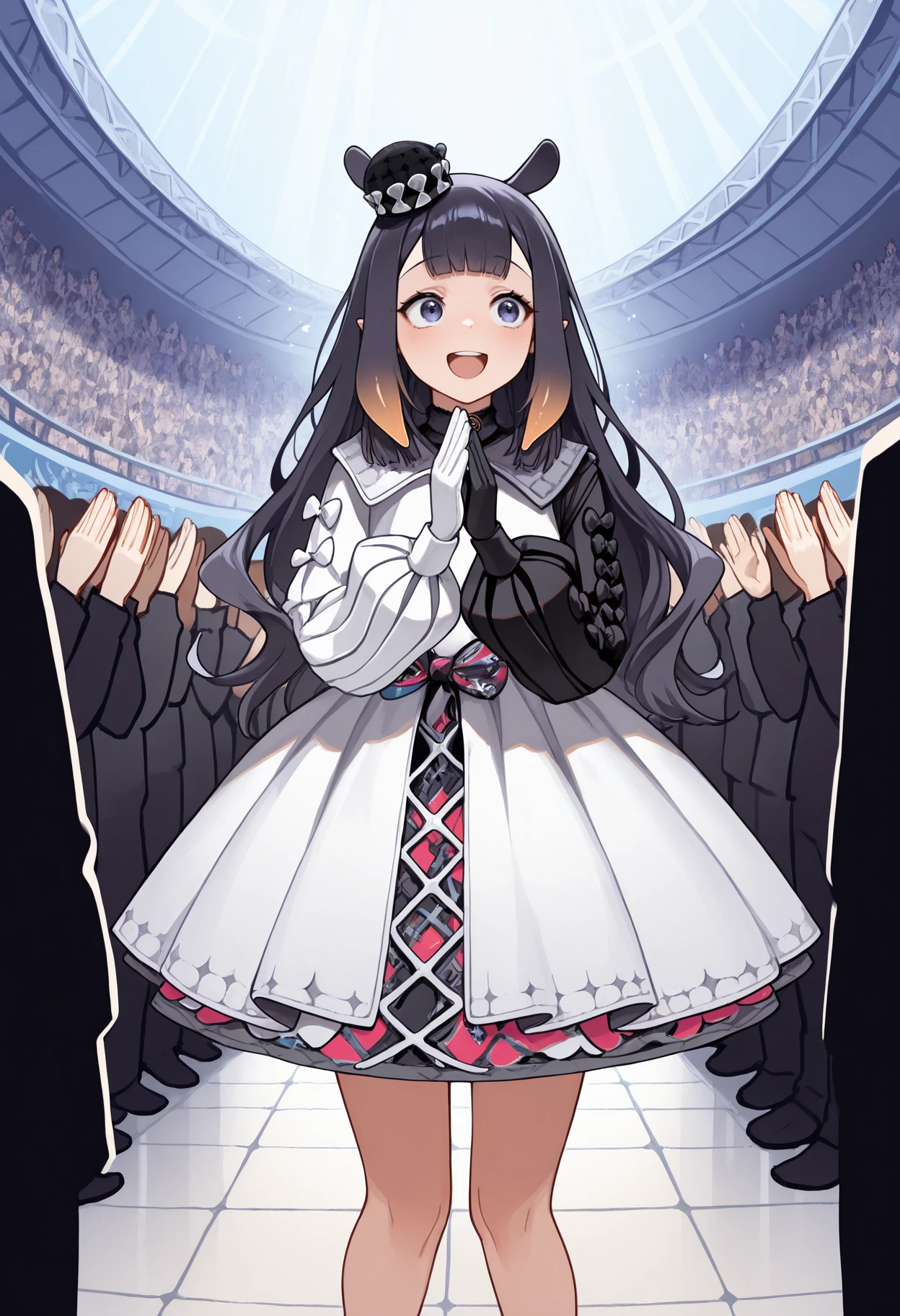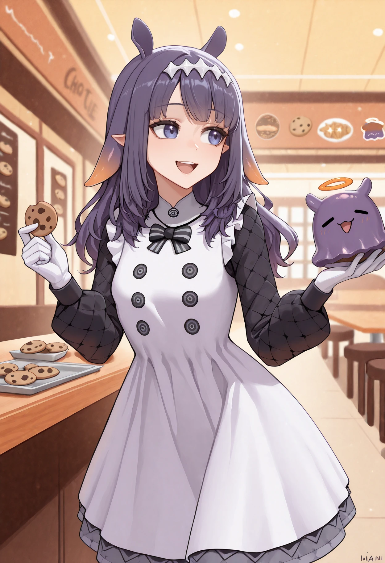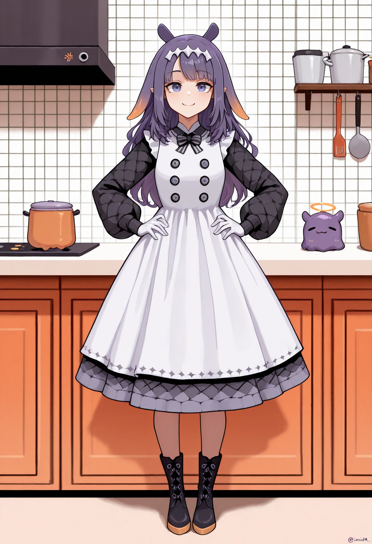 inaina_pstrychf, purple hair, orange hair, orange hair, white headpiece, apron dress, medium dress, white gloves