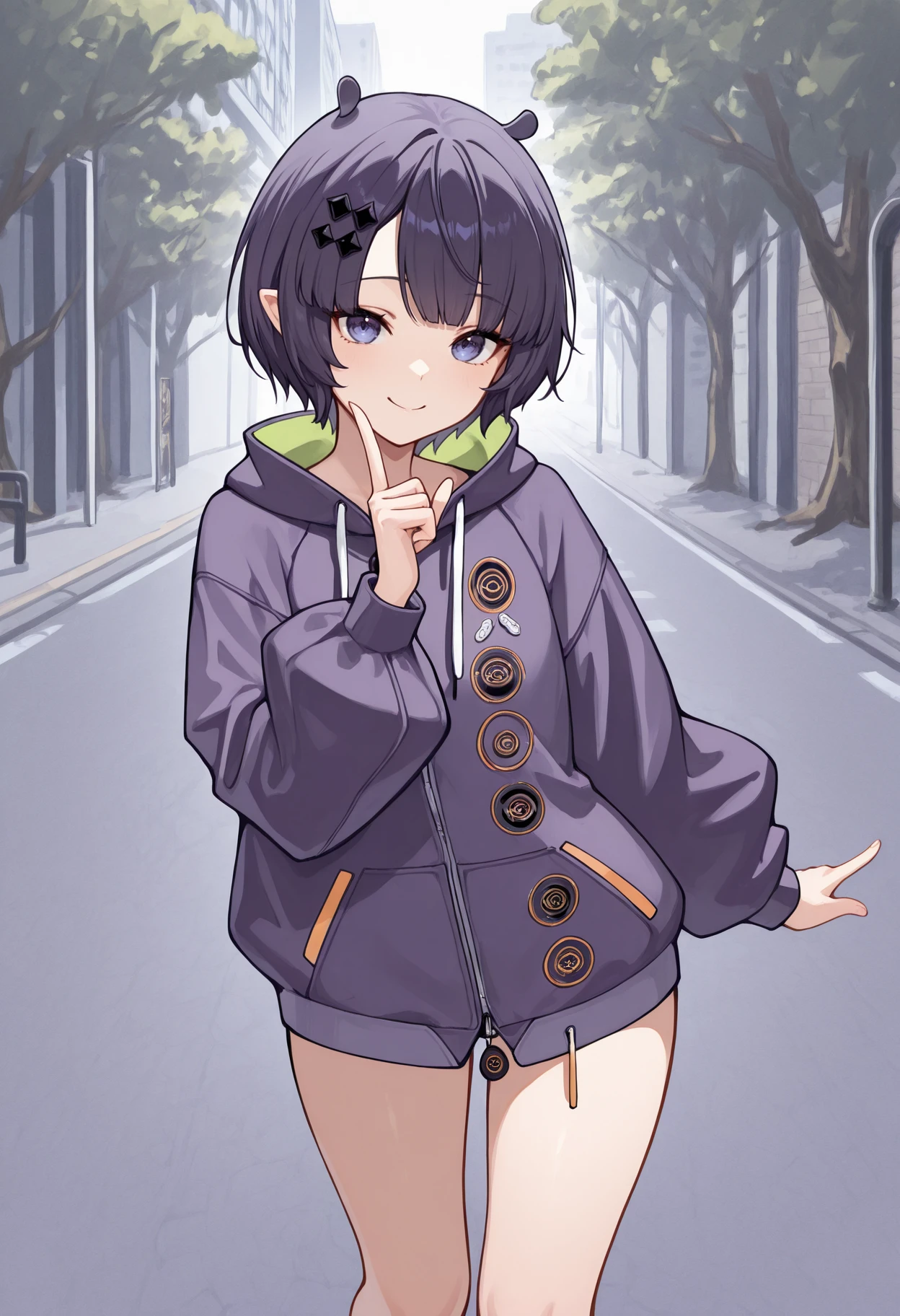 inaina_relax, purple hair, short hair, black hairpin, purple jacket, neon green trim, loose clothes, bare legs