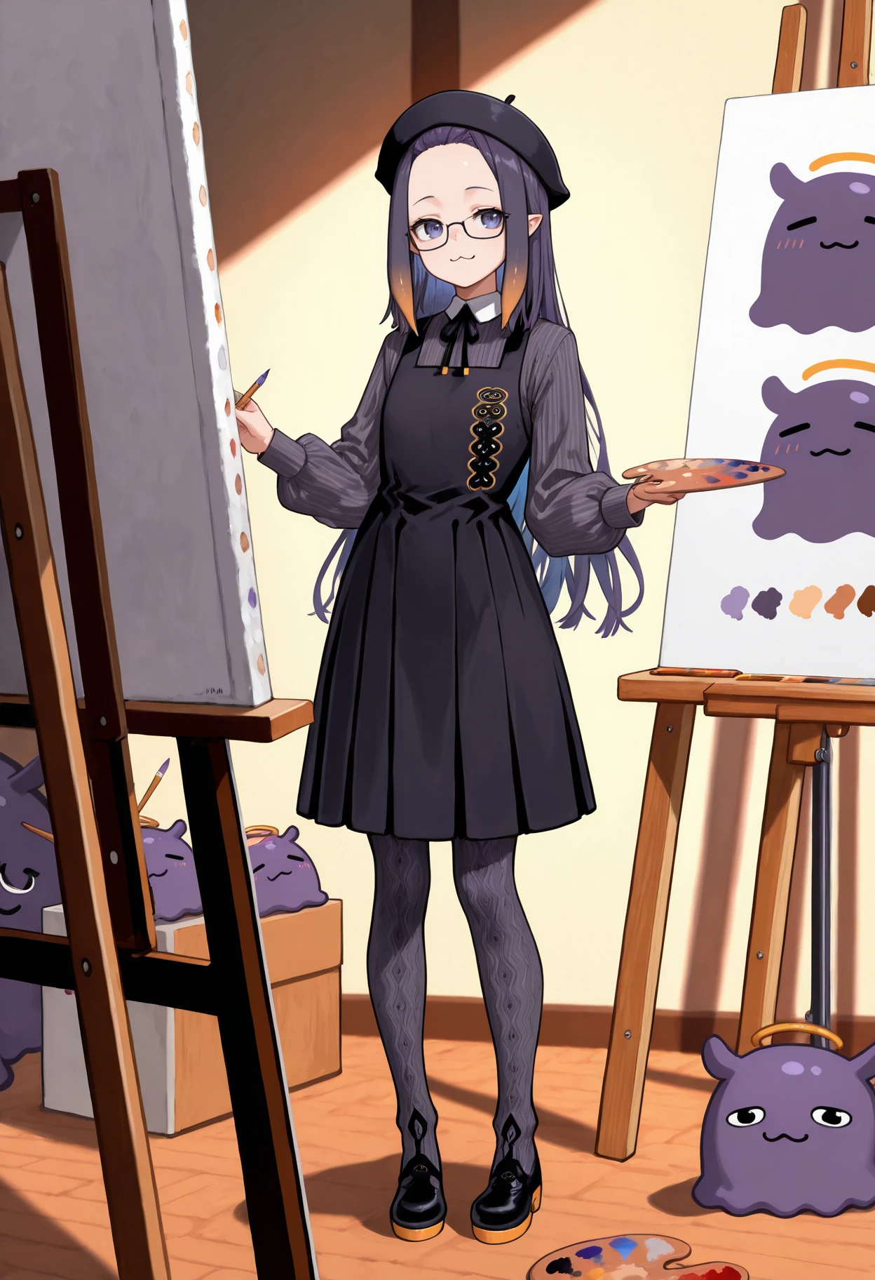 inaina_painter, pinafore dress, pinstripe shirt, beret, forehead, glasses, pantyhose