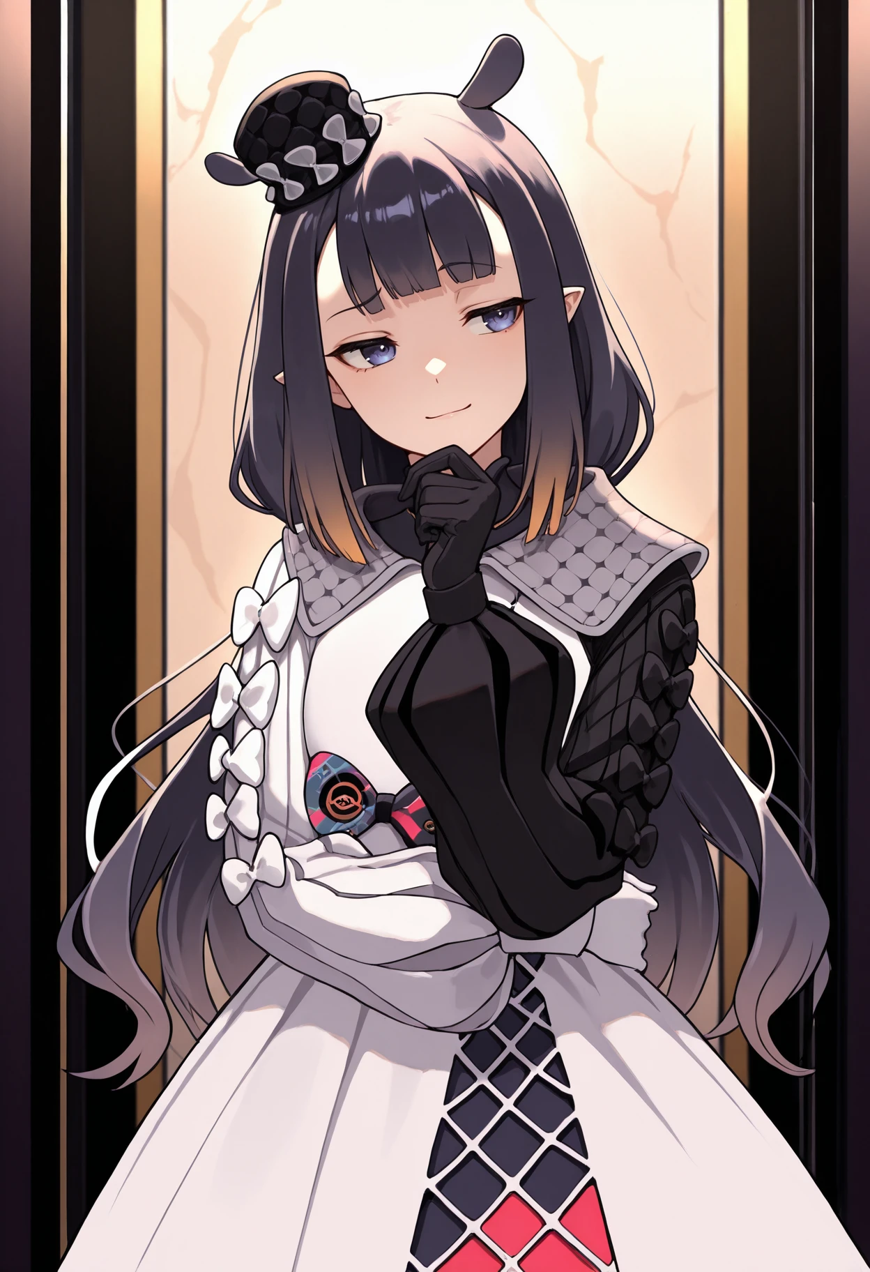 inaina_clrfl, white dress, multicolored dress, bow, mini hat, mismatched sleeves, mismatched gloves