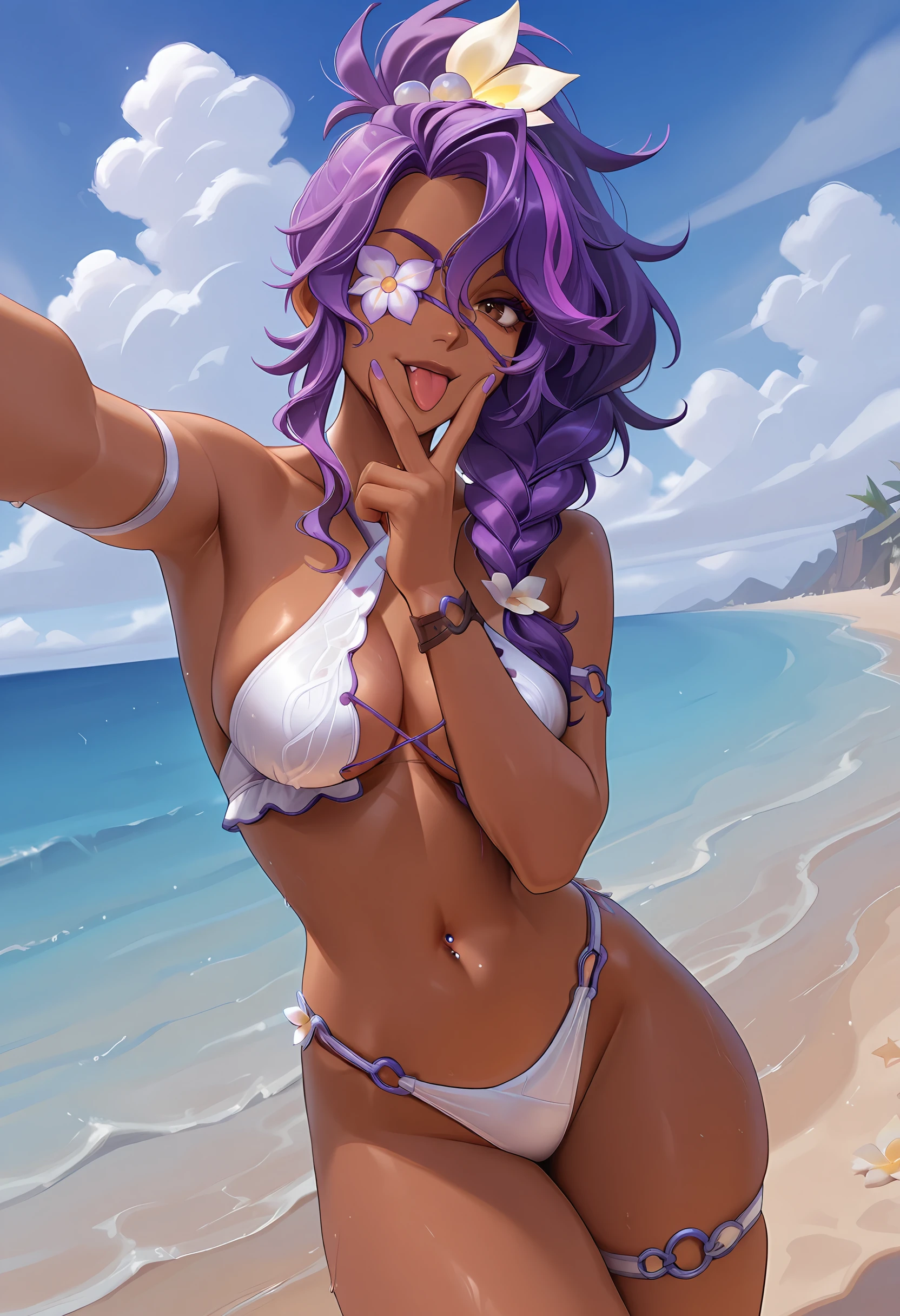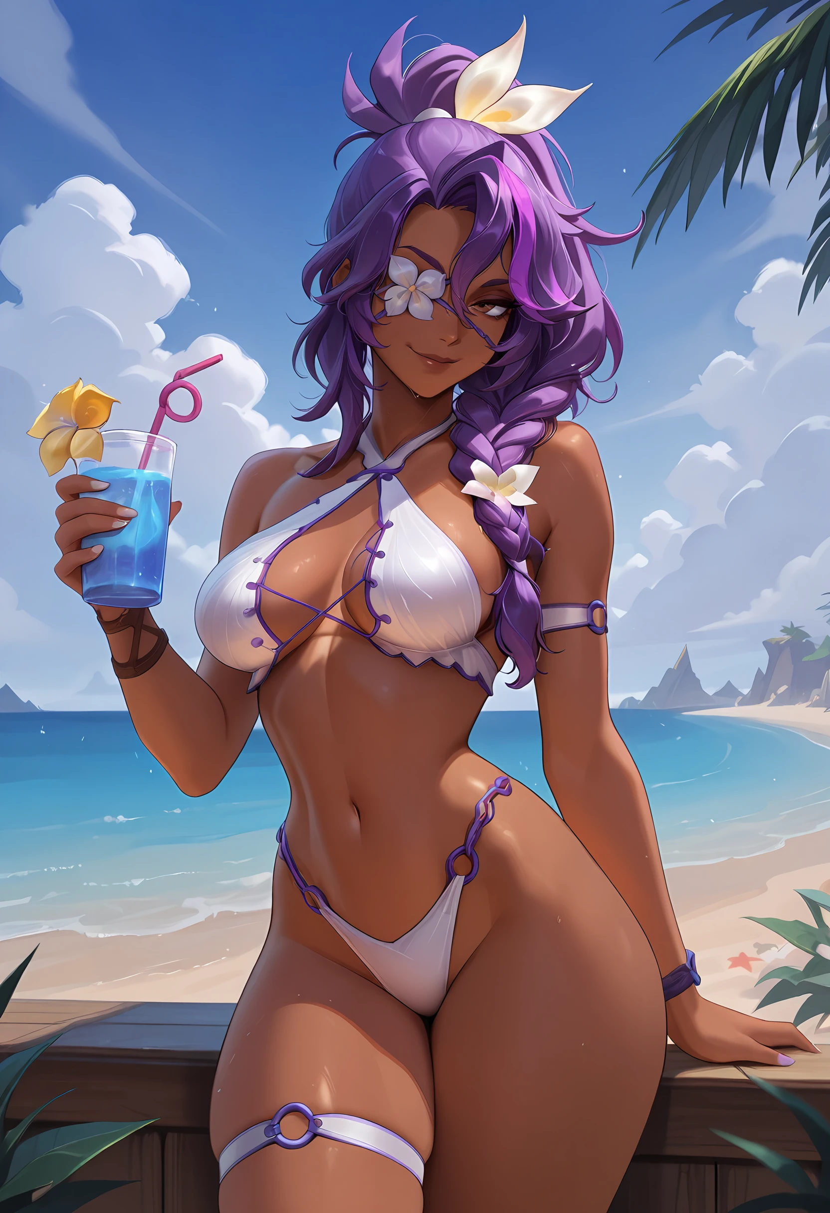 spsamirail, long hair, purple hair, brown eye, streaked hair, single braid, ponytail, dark-skinned female, (flower eyepatch:1.1), medium breasts, navel, bare shoulders, hair flower, white bikini, criss-cross bikini top, criss-cross strings, white flower, halterneck, sarong, navel piercing, o-ring thigh strap, o-ring arm strap, jewelry, I use V12 WAI-NSFW-illustrious-SDXL checkpoint for my images.