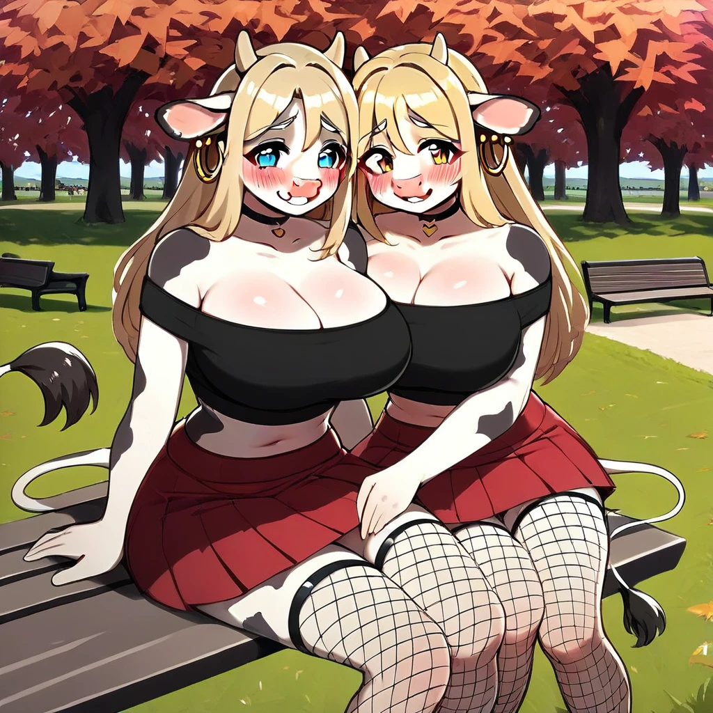 blue eyes, long blonde hair, black tube tops, black choker, red mini skirt, black see-through stockings, big gold earrings, blonde tail, black fingernails, small cow horns