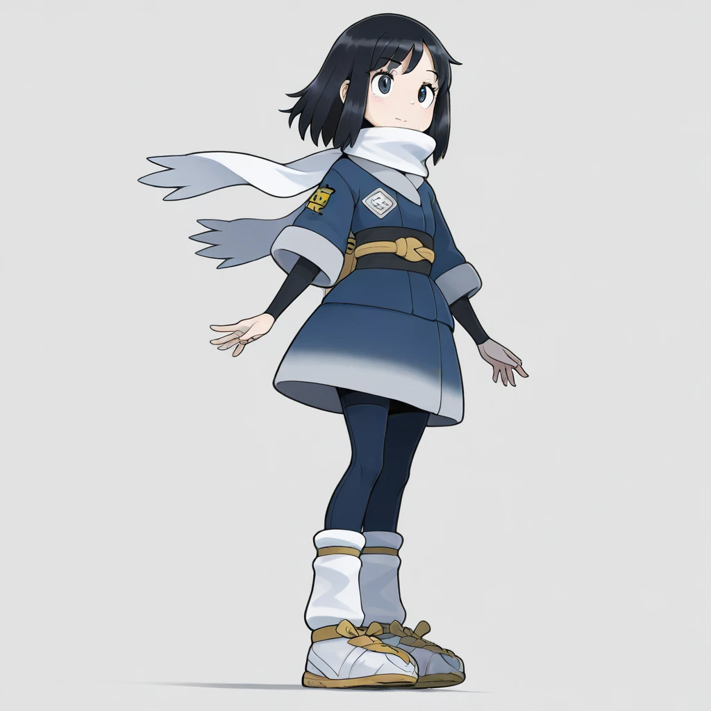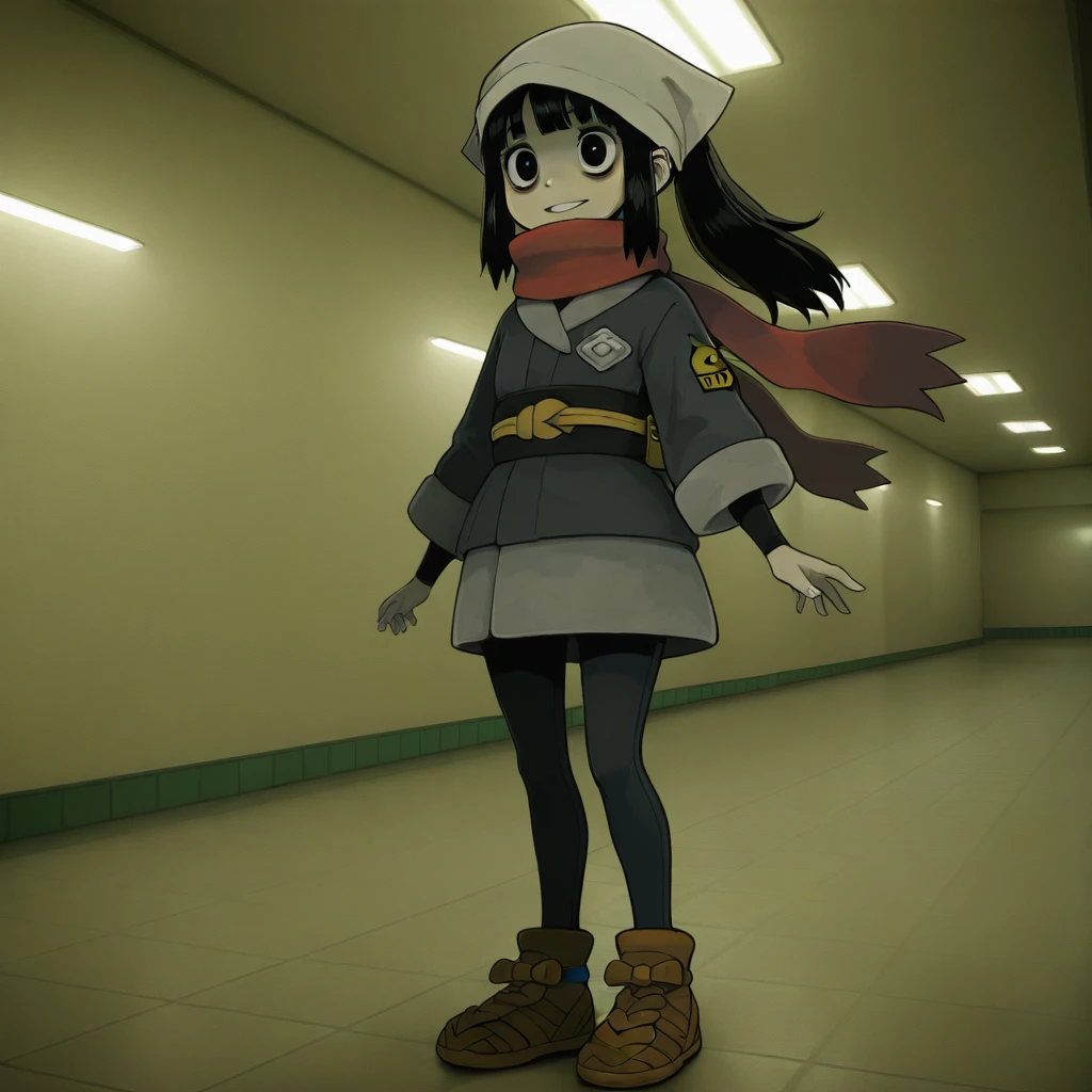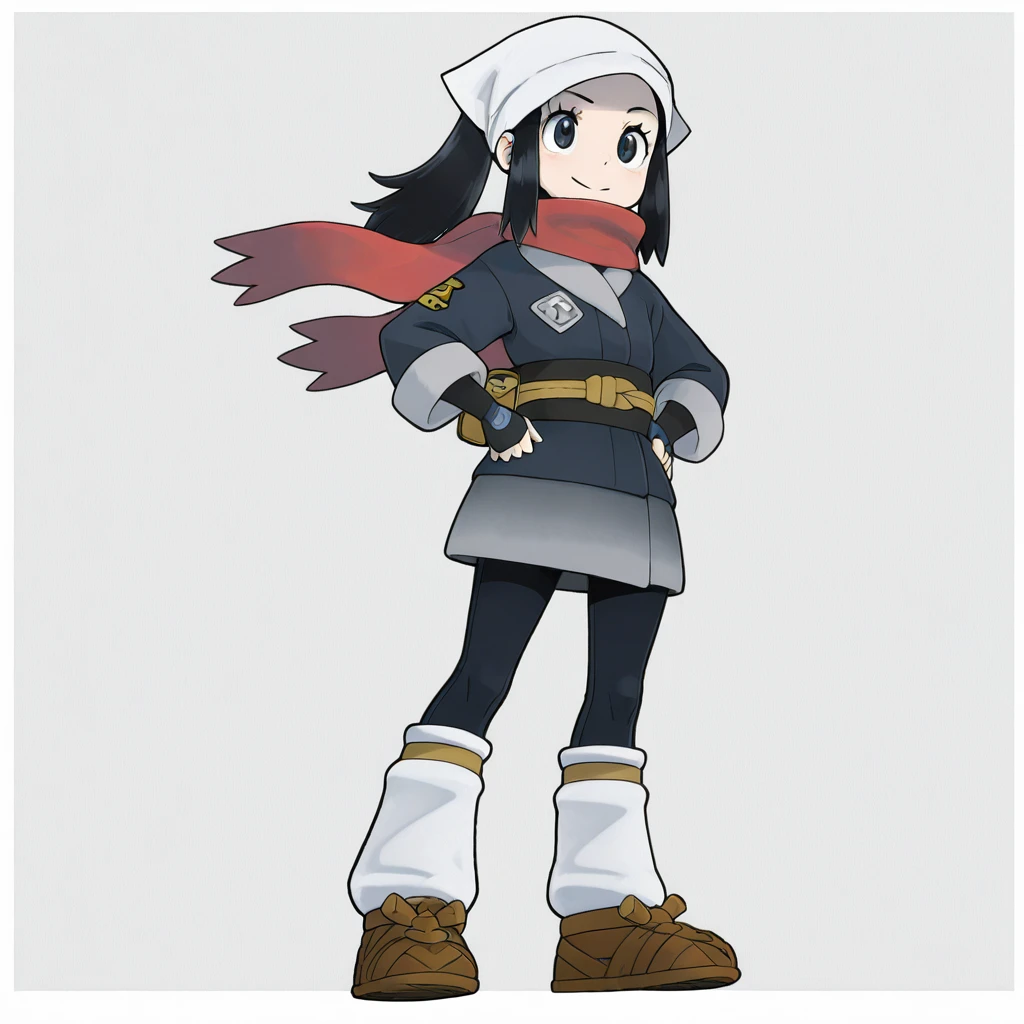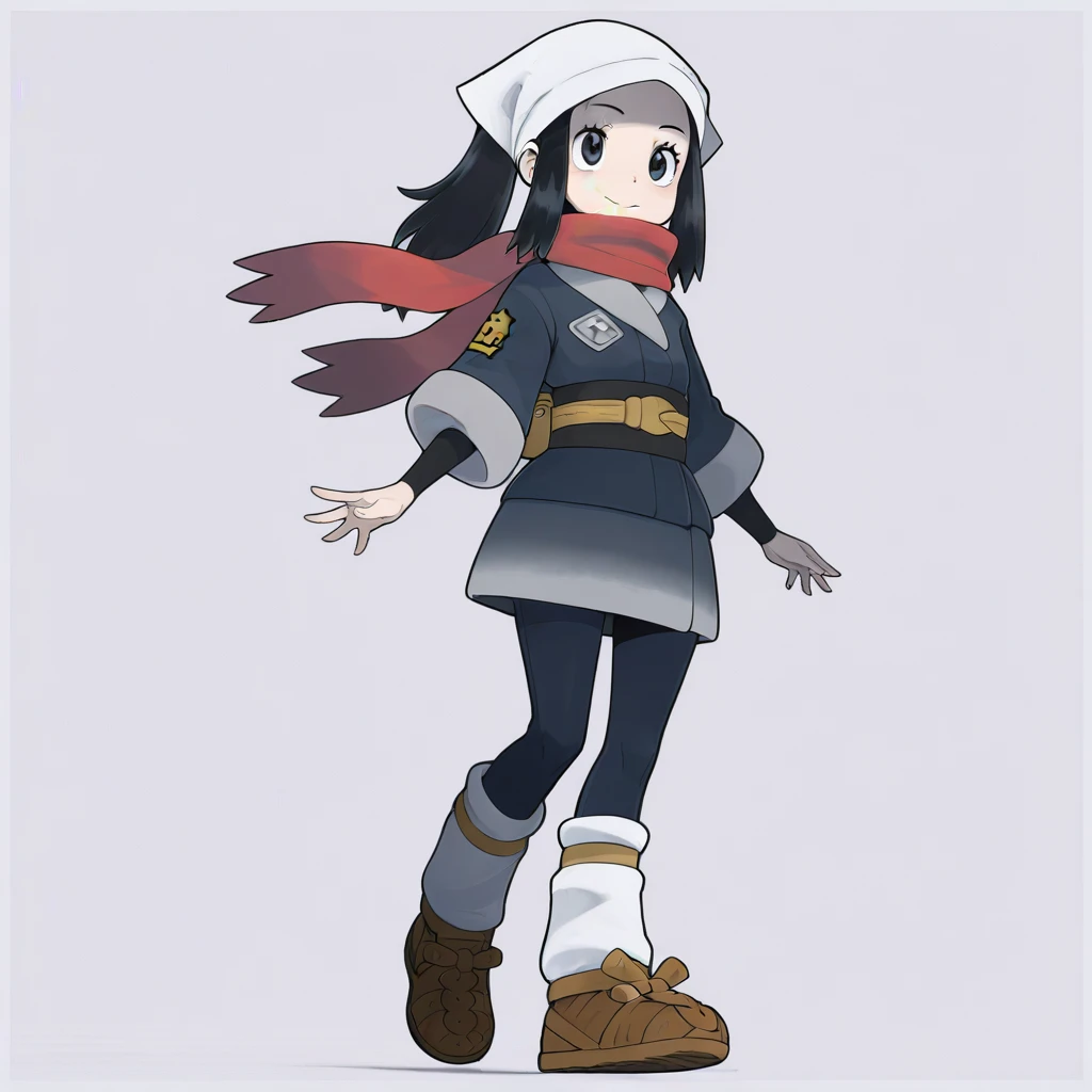 Helpful (and maybe even needed) tags: black hair, grey clothes, red scarf, white headwear, brown footwear