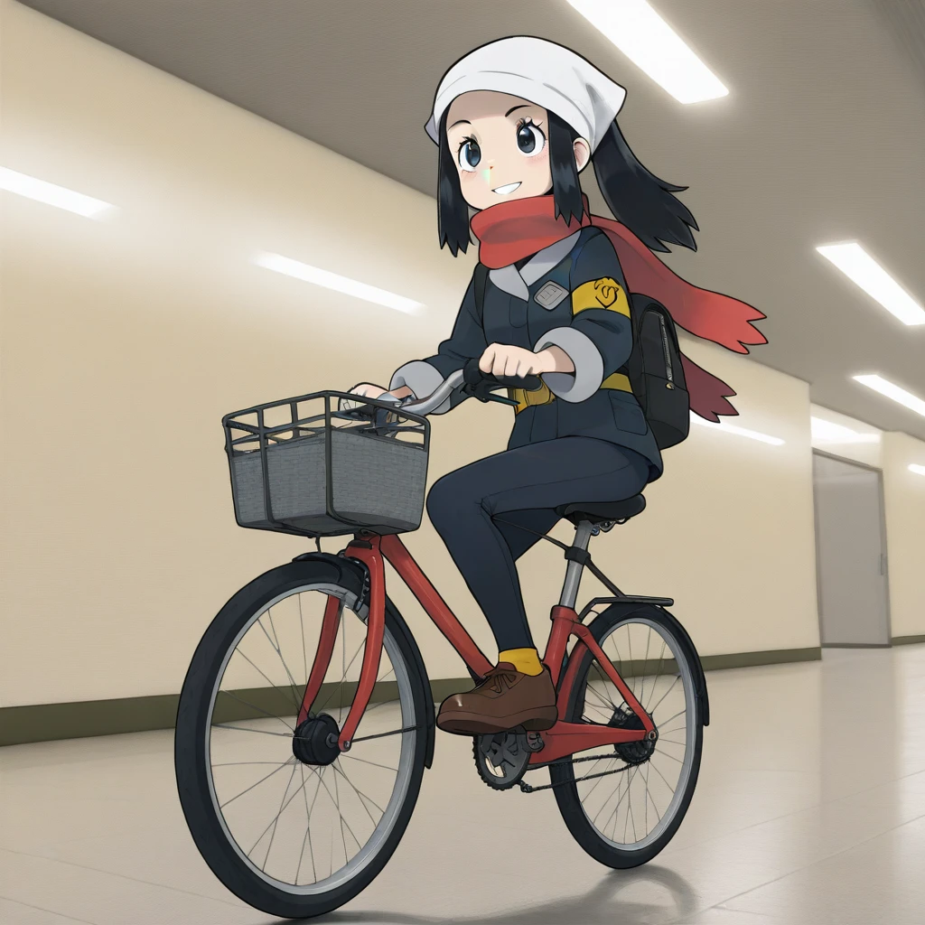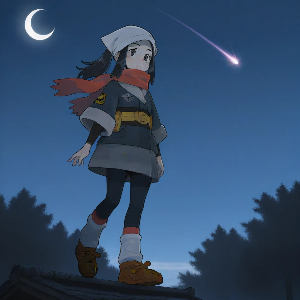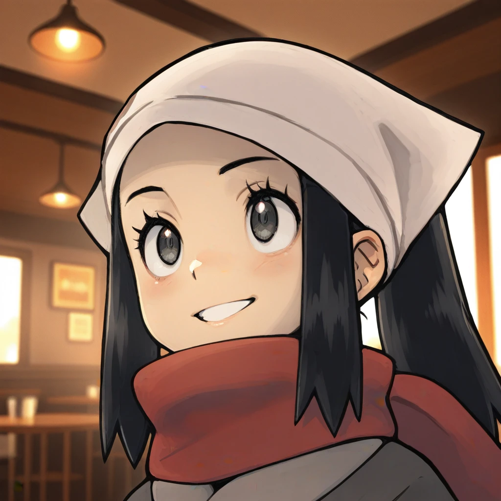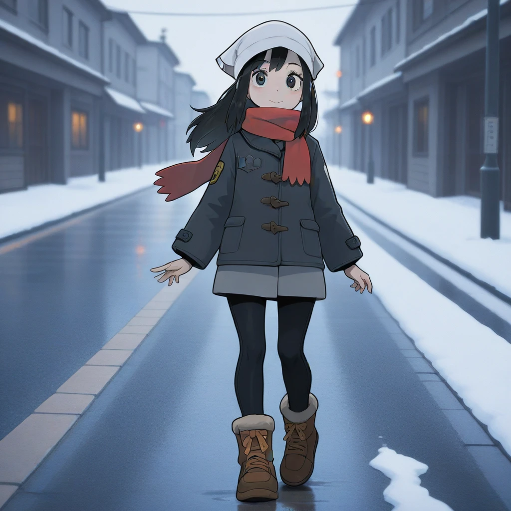 Helpful (and maybe even needed) tags: black hair, grey clothes, red scarf, white headwear, brown footwear