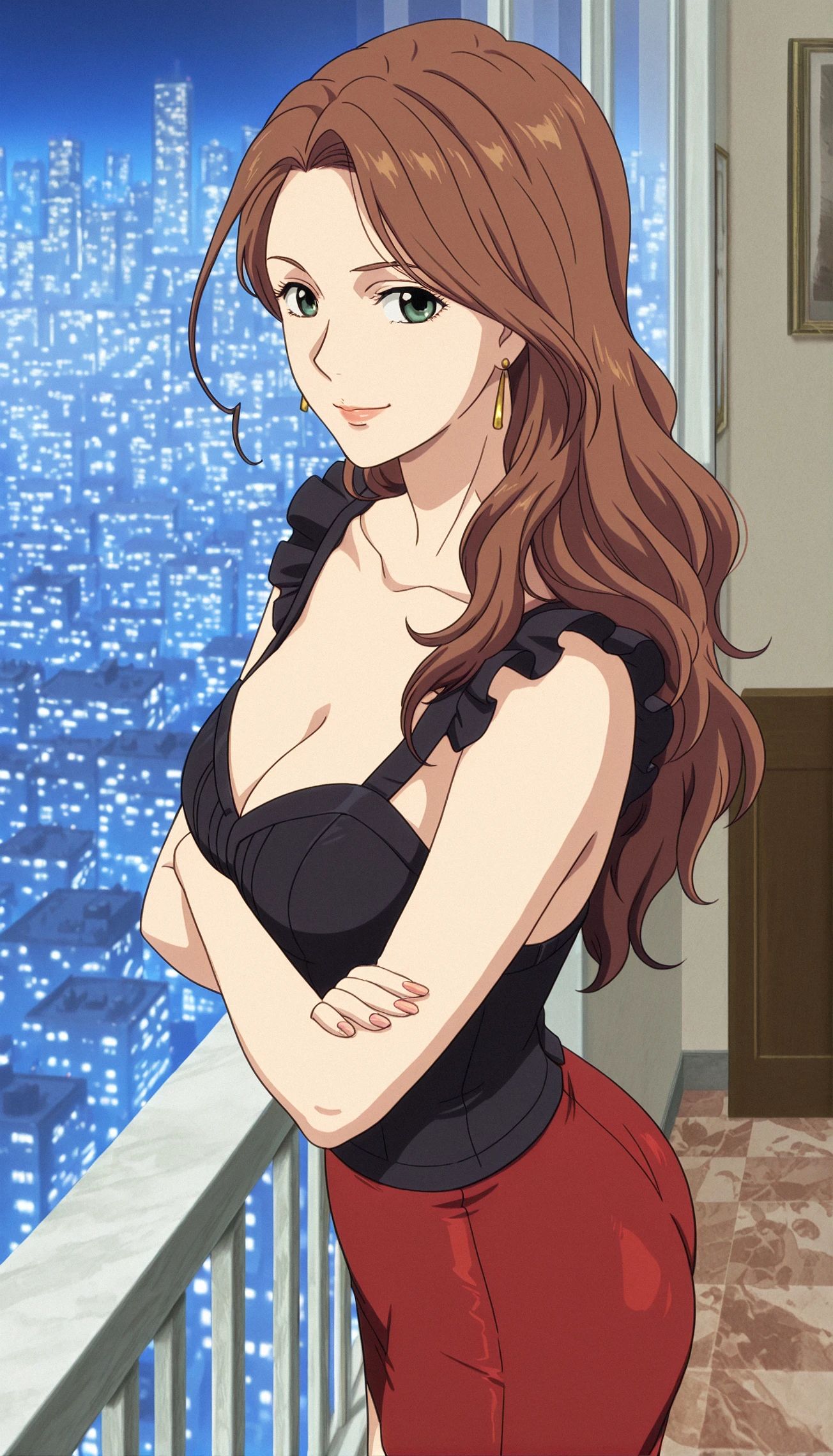 Shindo, 1girl, solo, long wavy brown hair, black corset-style top with ruffled straps and a central ring at the front,high-waisted red pencil skirt, gold earrings, bare shoulders, cleavage, collarbone, green eyes, medium breasts, sleevesless