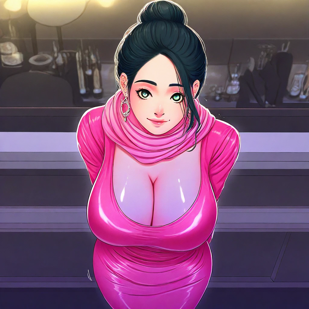 4. ((super sexy medium-sleeves pink dress, obscene cleavage, huge cleavage, sexy long-earrings, )) pink silk scarf
