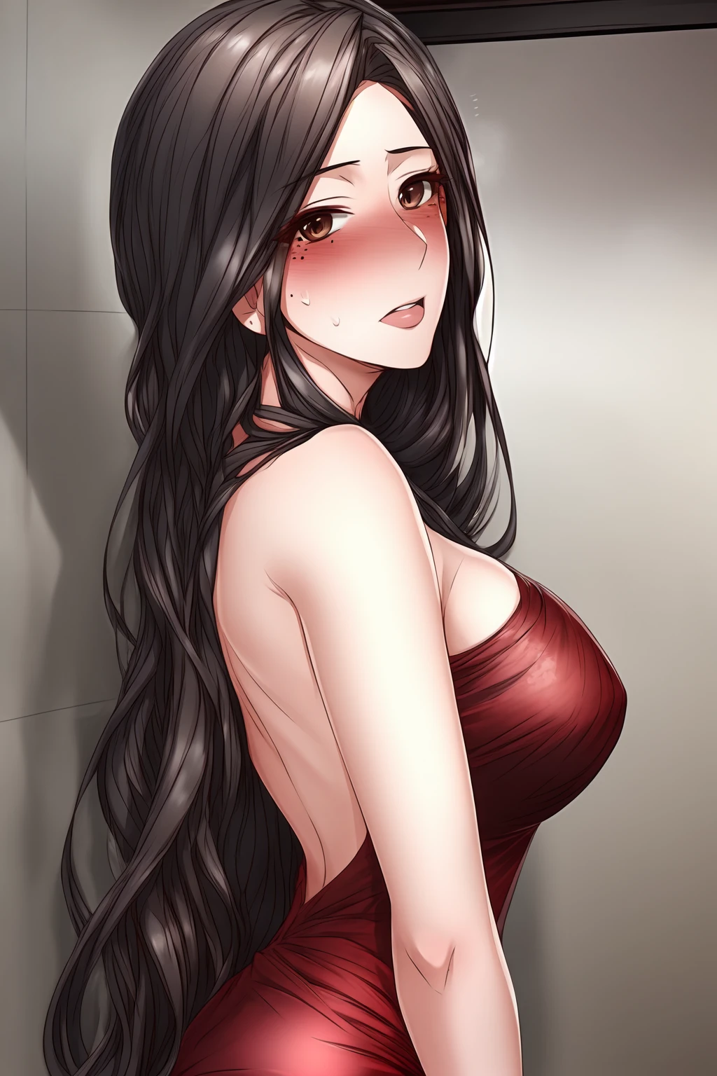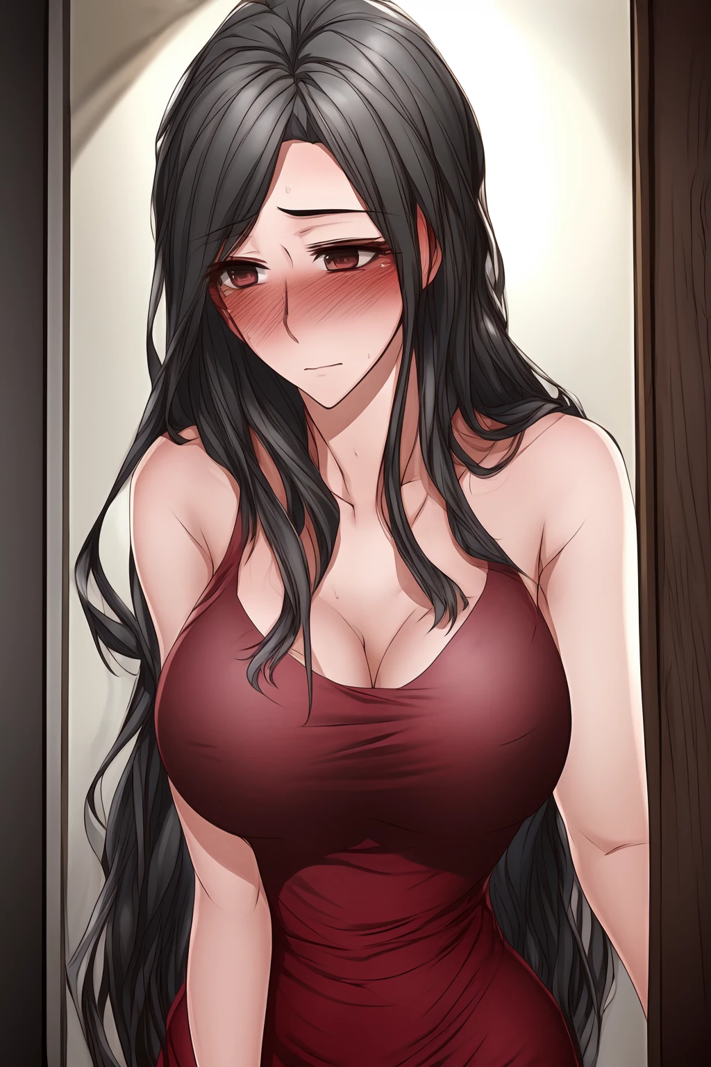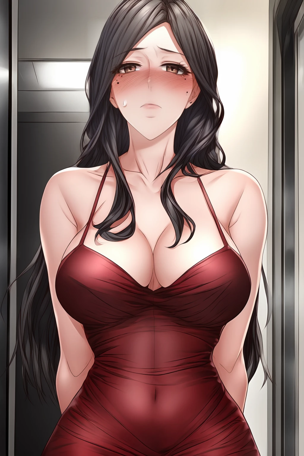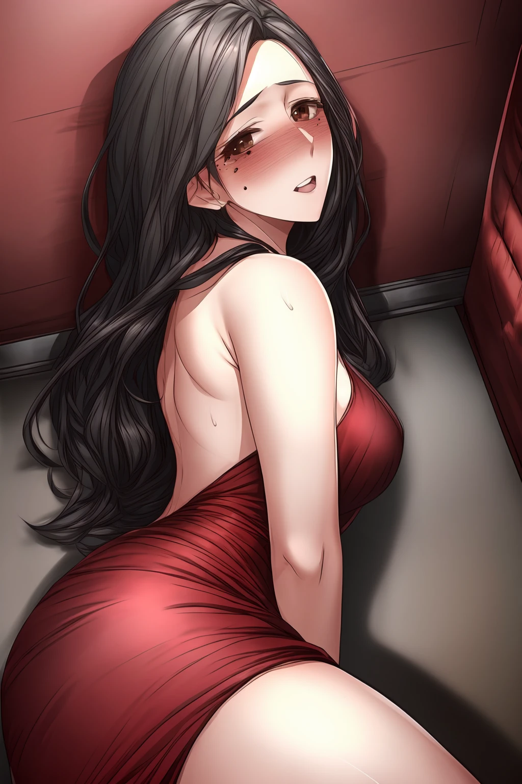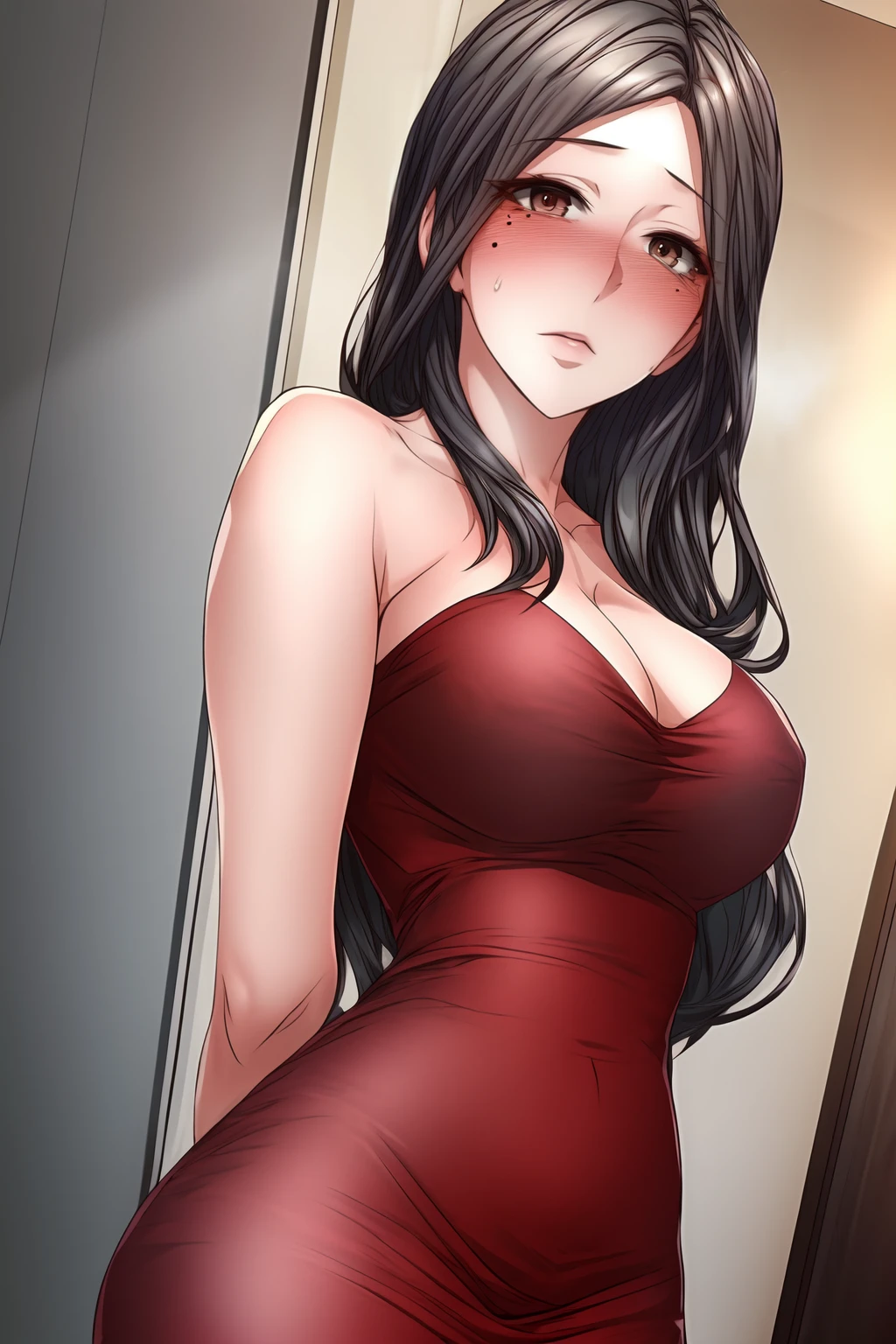 1girl, solo, sty-qiaoan, red dress, mole under eye, black hair, blush, brown eyes, long hair, mature female,