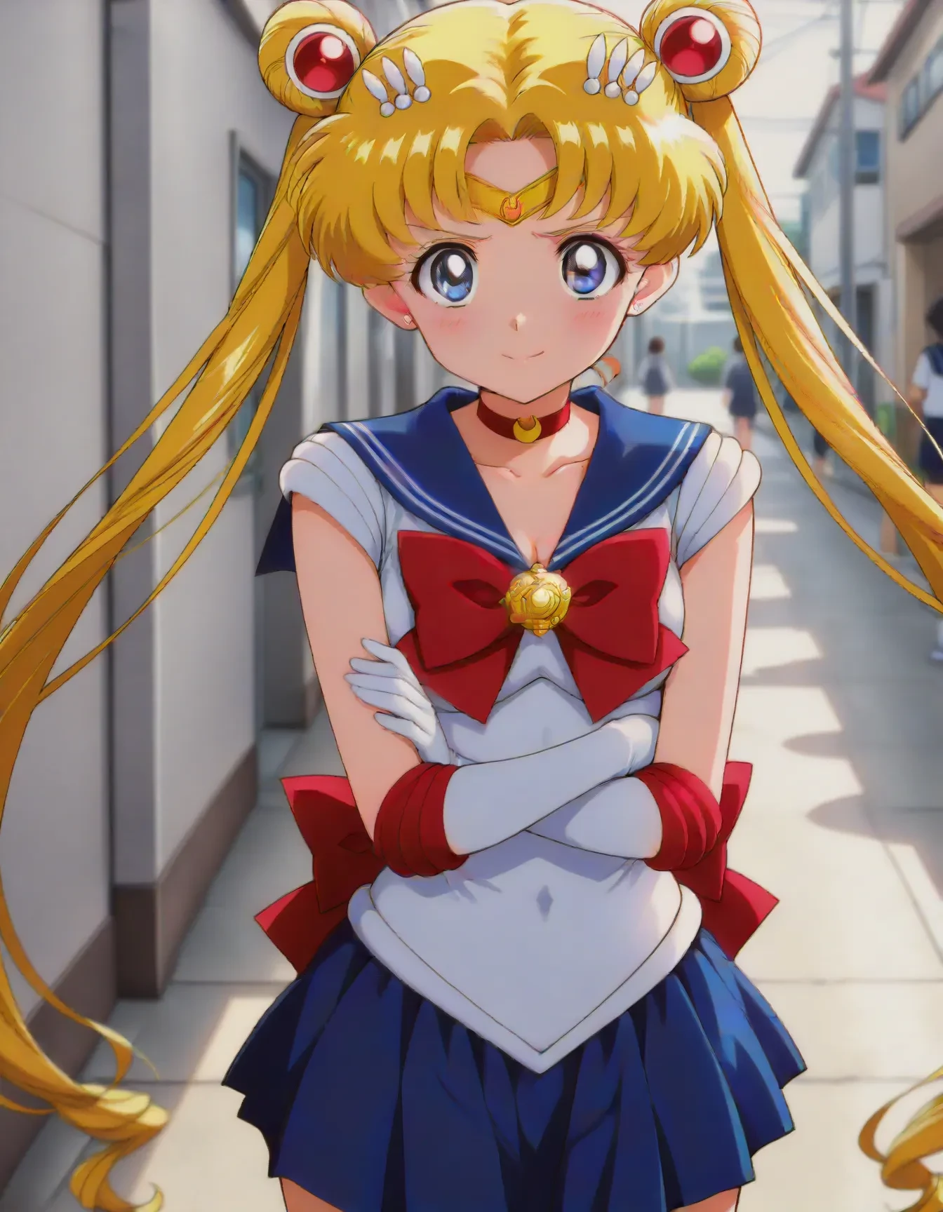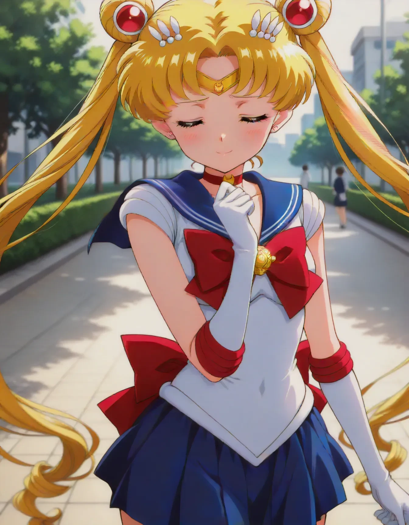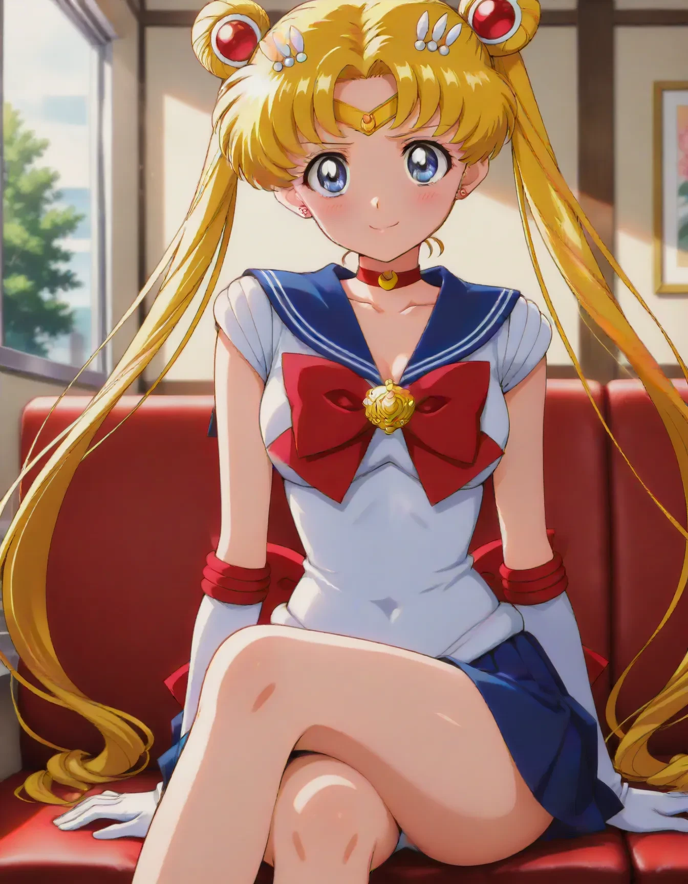 triggerWord: tsukino usagi,1girl,solo,solo focus,blonde hair,blue eyes,double bun,hair bun,long hair,twintails,parted bangs,hair ornament,circlet,back bow,blue sailor collar,blue skirt,bow,brooch,choker,elbow gloves,gloves,jewelry,leotard,magical girl,pleated skirt,red bow,red choker,ribbon,sailor collar,sailor senshi uniform,skirt,white gloves,