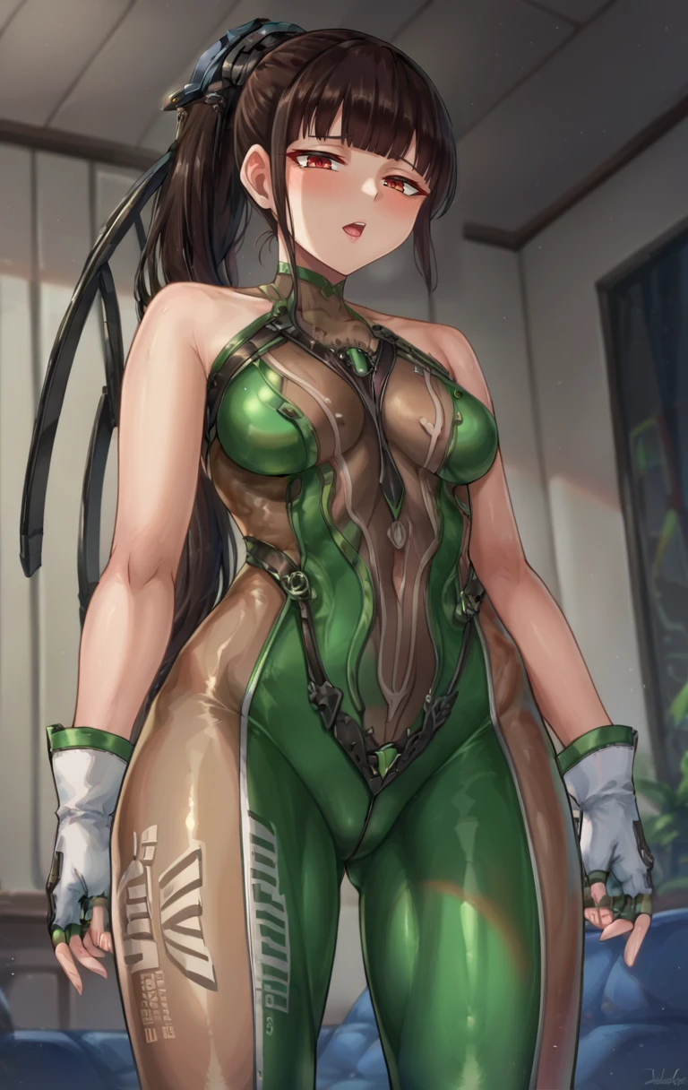 EveMarlo,1girl,solo,long hair,brown hair,black hair,brown eyes,ponytail,shiny,blunt bangs,lips,see-through,fingerless gloves,green bodysuit,high ponytail,skin tight,shiny clothes
